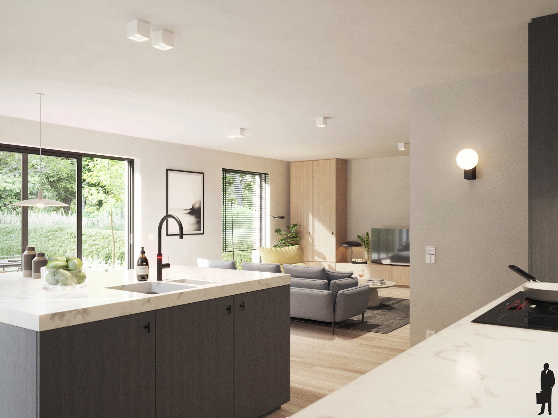 - Een open keuken met keukeneiland en uitgerust met alle comfort en inbouwtoestellen