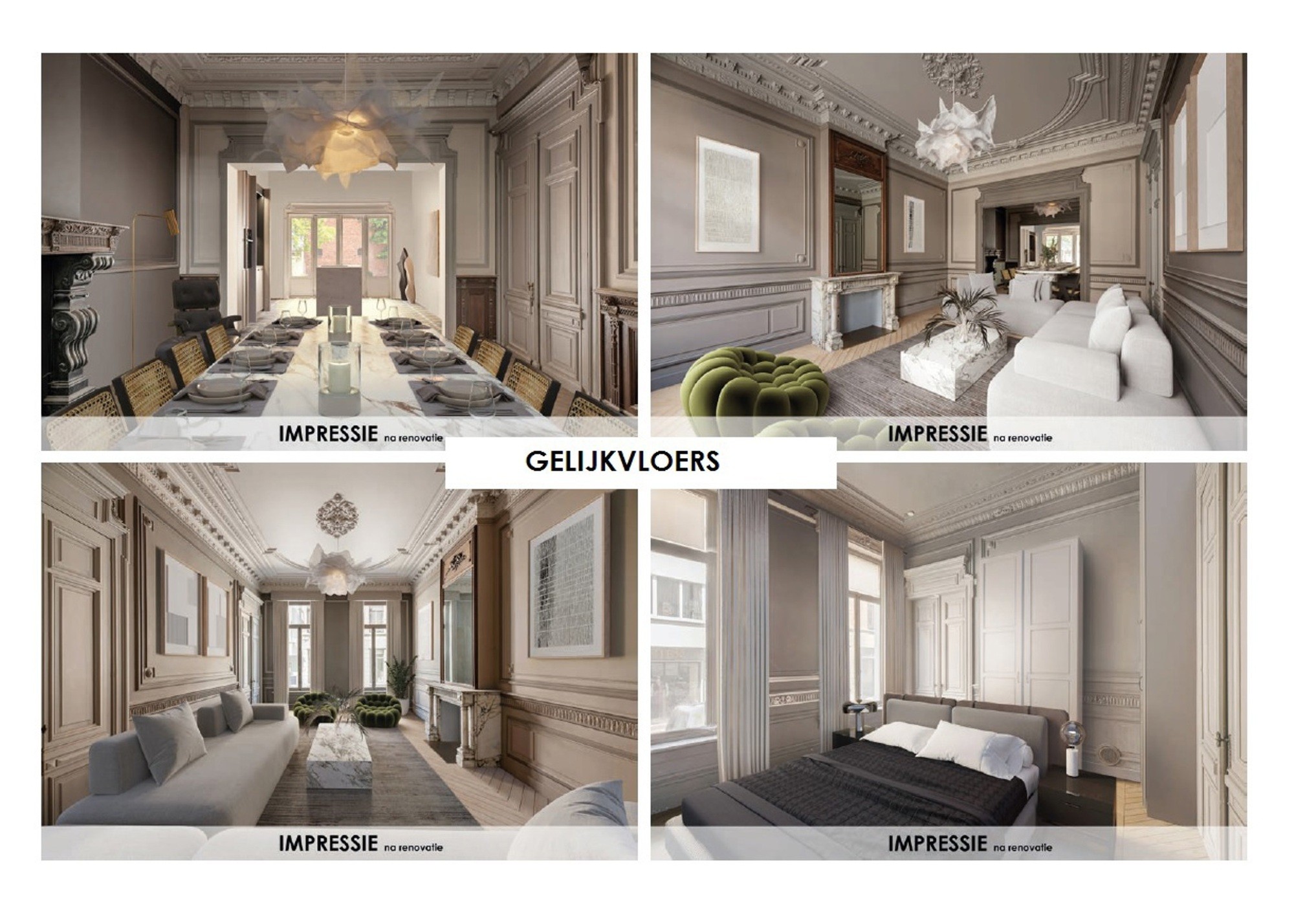 Het gebouw zal worden omgevormd tot 4 appartementen met terrassen, grote individuele kelder en 2 carports met fietsenberging. De renovatie zal gebeuren met het grootste respect voor alle authentieke elementen, zonder daarbij de (technologische) noden van vandaag uit het oog te verliezen. Zo wordt het gebouw uiteraard uitgerust met een lift. Vanzelfsprekend worden alle beschermde elementen in ere hersteld: Te denken aan de monumentale binnendeuren, de mouluren, open haarden, de majestueuze koepel, de indrukwekkende koetsdoorgang, … Elk appartement zal de volledige verdieping beslaan, waardoor u groots kan wonen, in een kleinschalige residentie: