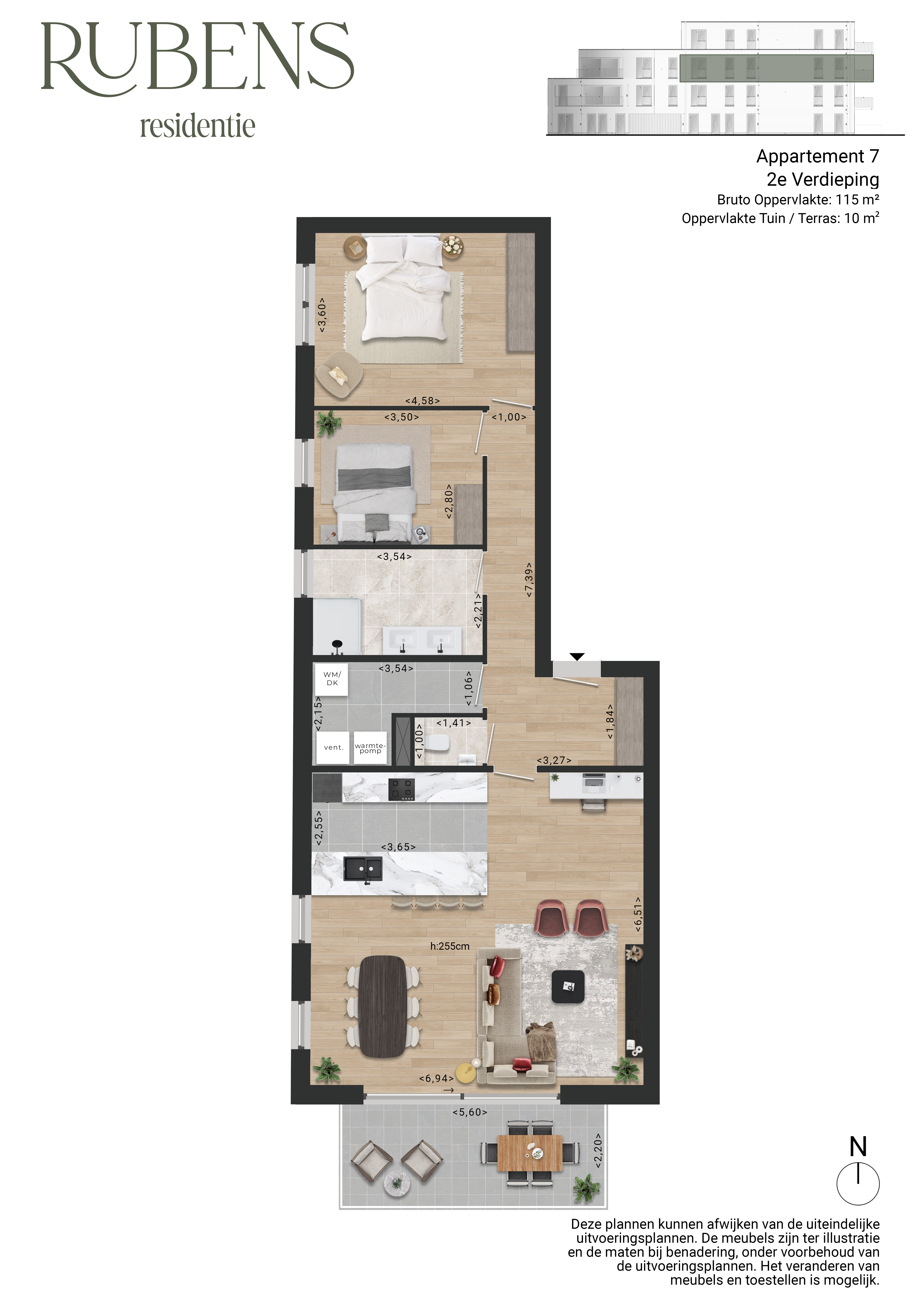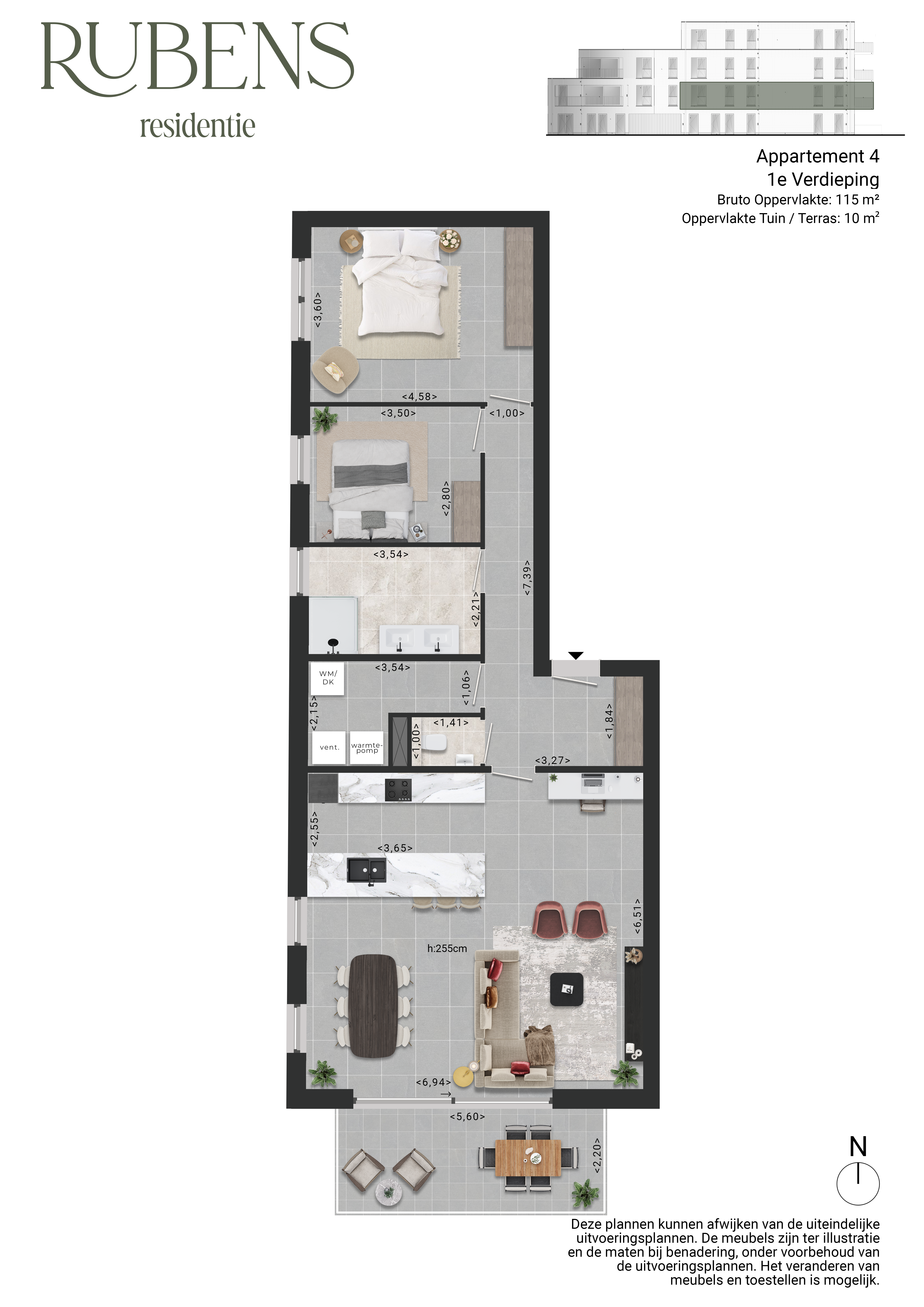 Appartement 3 bevindt zich op de eerste verdieping en is met 137m² het grootste appartement in de residentie. Het appartement is voorzien van 2 volwaardige slaapkamers. De woonkamer geniet langs 2 zijden van natuurlijk daglicht en is voorzien van een open leefkeuken. Een schuifraam geeft toegang tot het grote, overdekt terras van 17m² met west oriëntatie.