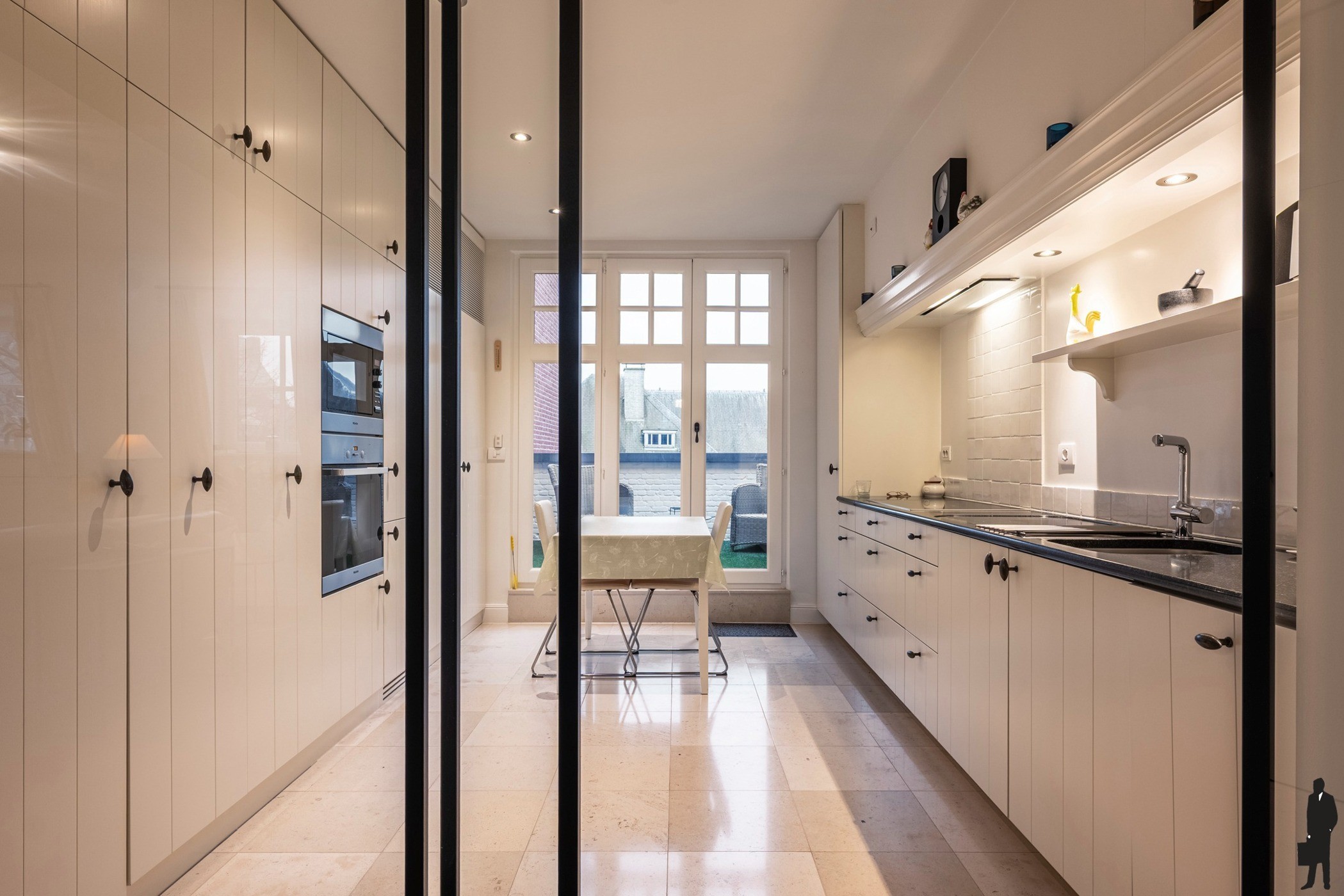 De lift komt rechtstreeks toe in het appartement. U betreedt het appartement via een ruime inkomhal met gastentoilet en garderobekasten. Een dubbele deur brengt u naar de leefruimte met een gezellige eetkamer en zithoek. De leefkeuken is voorzien van veel kastruimte, een natuurstenen werkblad met dubbele spoelbak en kwaliteitstoestellen van Miele (inductiekookplaat, combi-oven ijskast en diepvriezer. Aansluitend is er toegang tot het volledige private en zuidgerichte terras, vanwaar u een mooi zicht heeft op de gemeenschappelijke binnentuin. Weggewerkt in een ingemaakte kast vindt u de toegang tot de praktische berging en wasplaats.