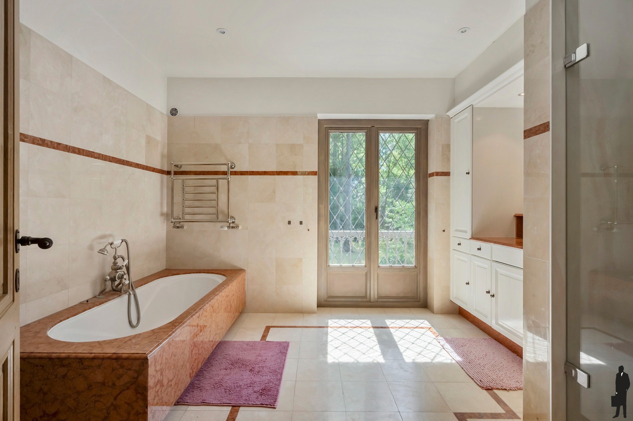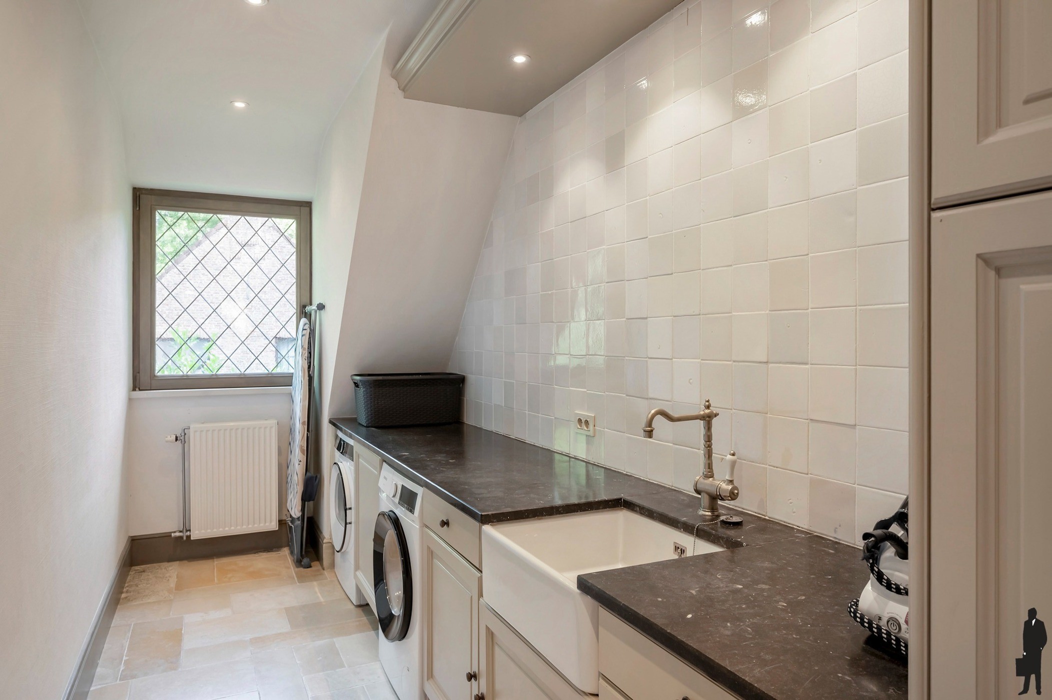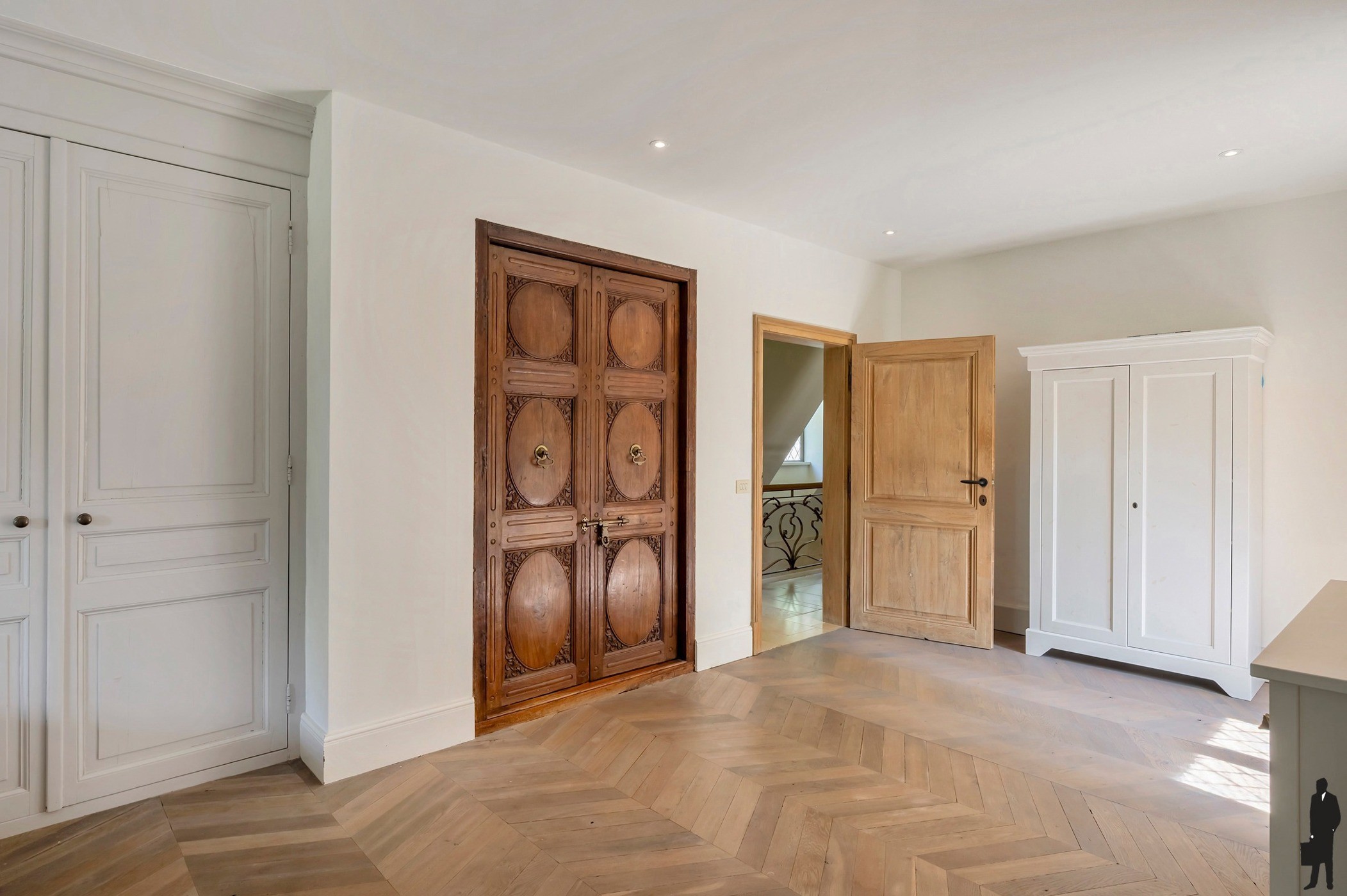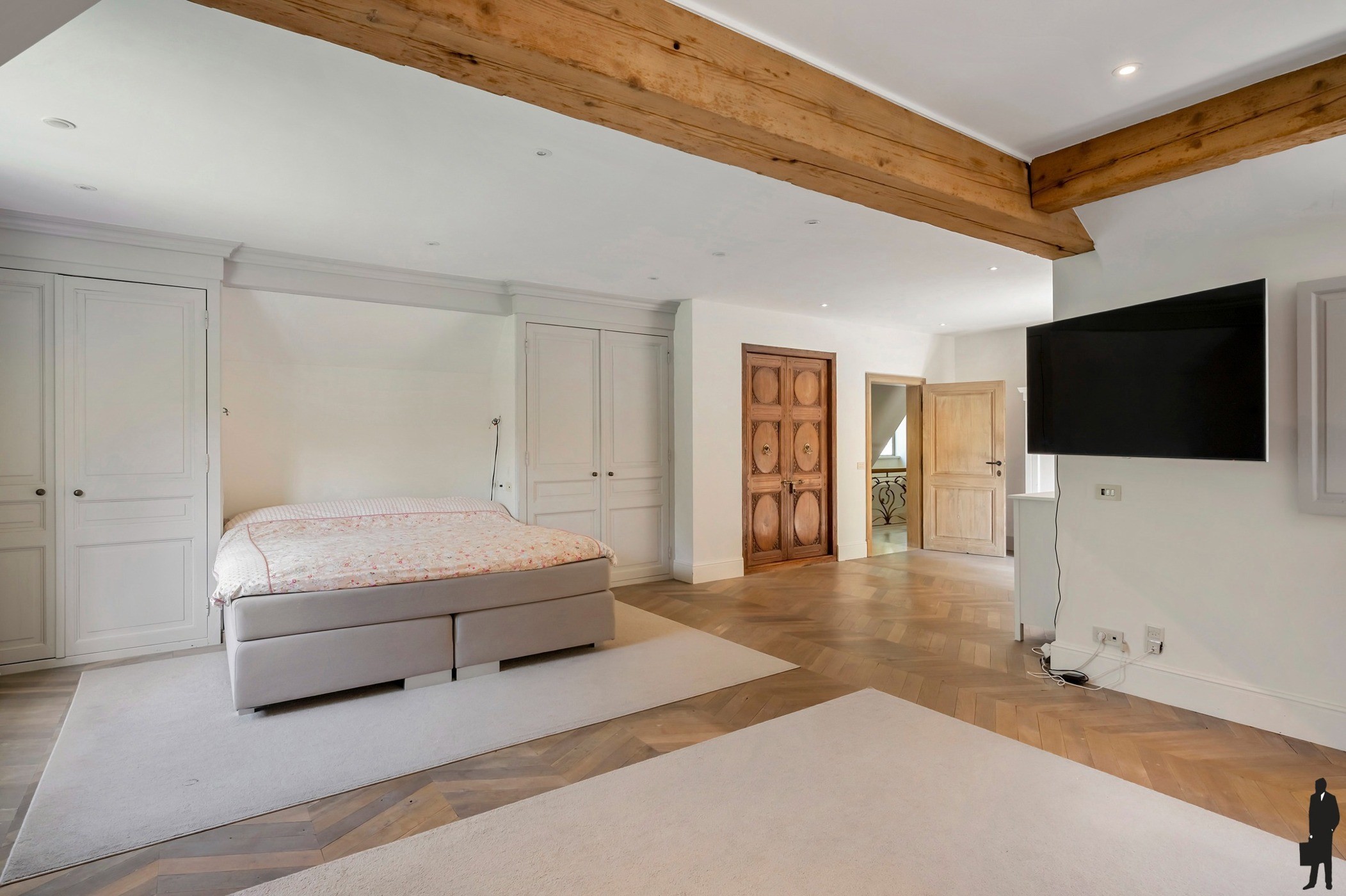 Eerste verdieping: Een statige trap in natuursteen leidt naar de eerste verdieping. Hier bevindt zich de riante master bedroom, voorzien van een parketvloer, maatwerkkasten en een badkamer in marmer met dubbele wastafel, ligbad, inloopdouche, toilet en bidet. Daarnaast zijn er nog drie ruime slaapkamers, eveneens afgewerkt met parket, en een tweede stijlvolle badkamer. Praktisch is ook de aanwezigheid van een aparte was- en strijkkamer met ingemaakte kasten.