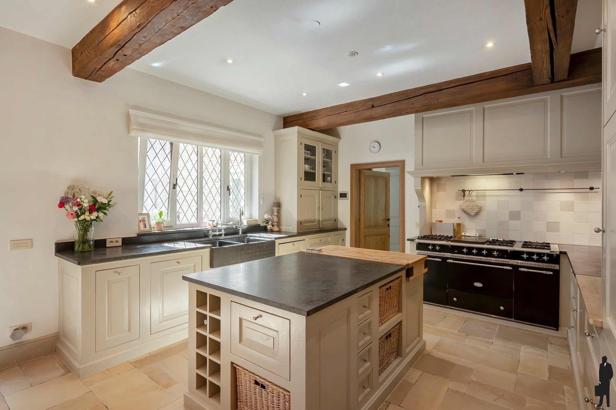 Het eetgedeelte is eveneens afgewerkt met Franse natuursteen en bevindt zich aansluitend aan de volledig uitgeruste leefkeuken. Deze keuken is voorzien van alle comfort, waaronder een Lacanche gasfornuis, kwalitatieve inbouwtoestellen (koelkast, diepvriezer en vaatwasser), een natuurstenen werkblad en een gezellige ontbijthoek onder prachtige houten balkenplafonds.