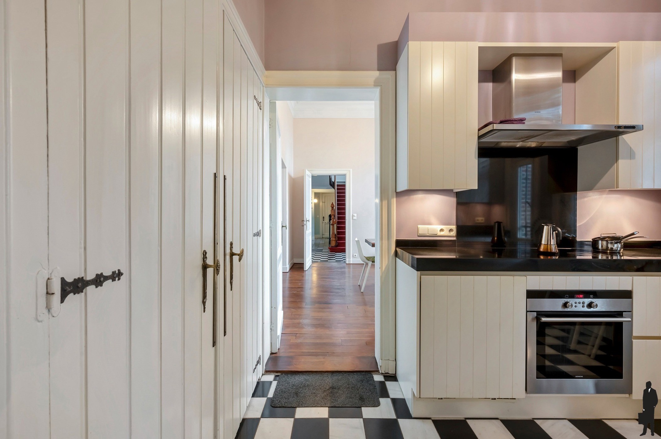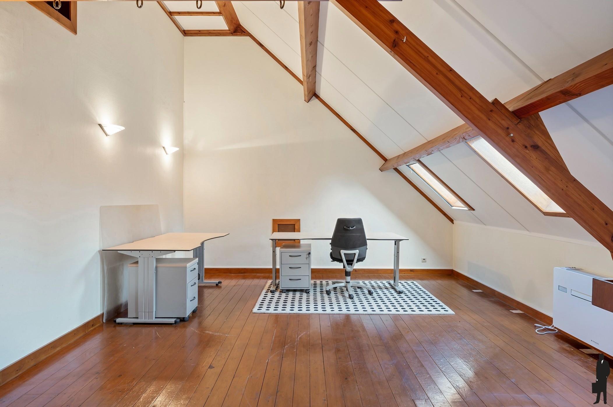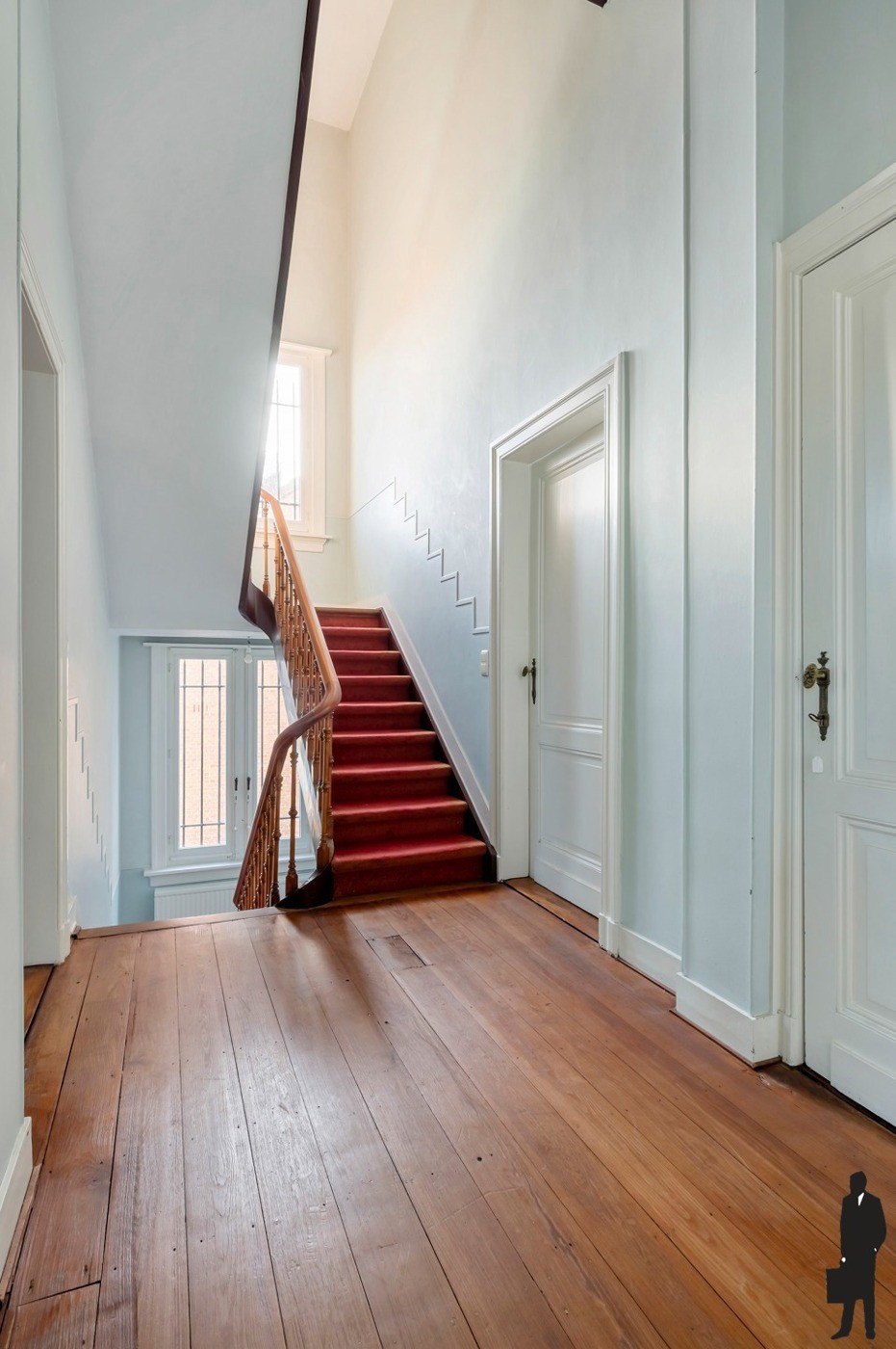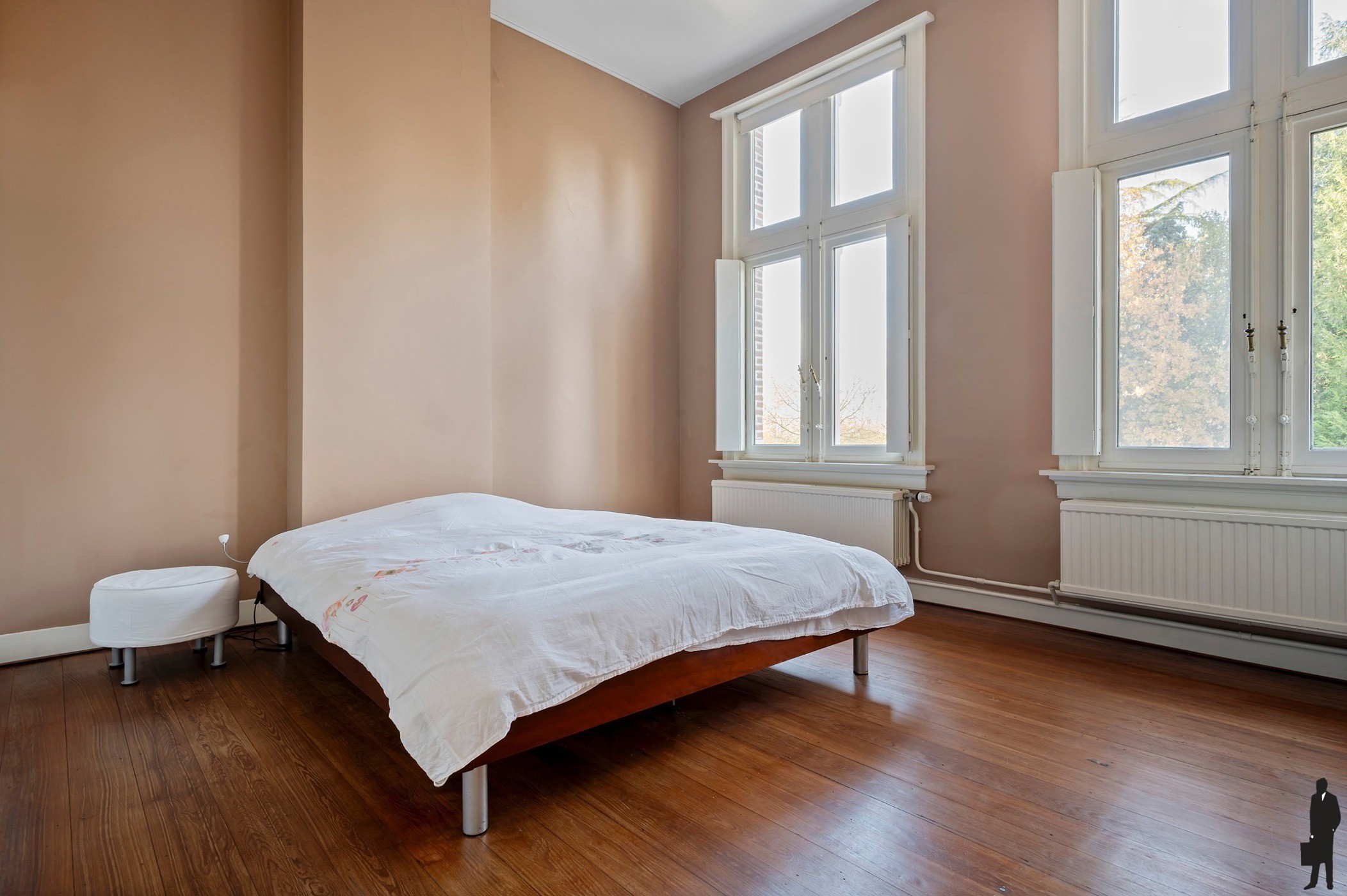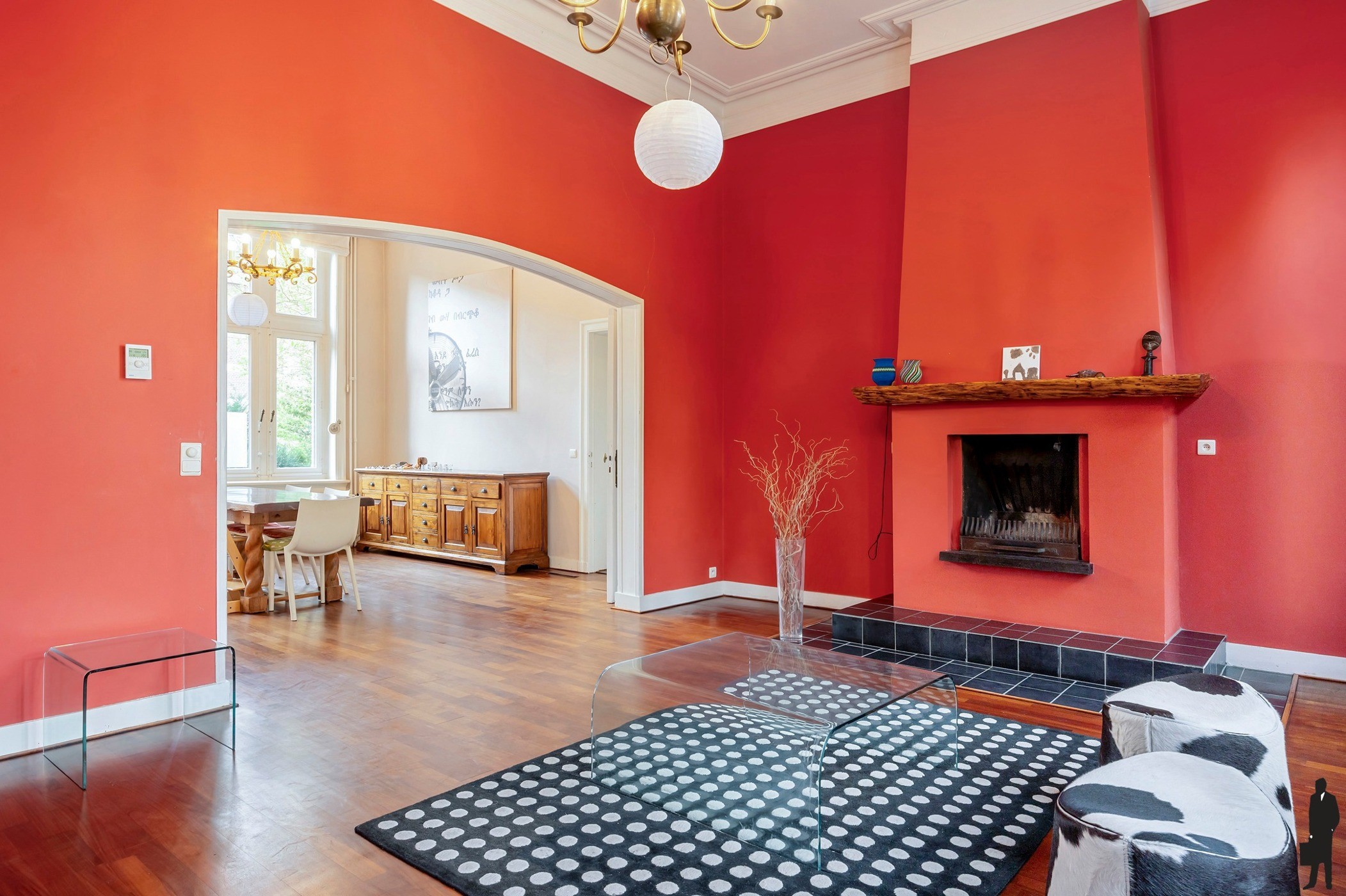- Zéér ruime living (ca. 53 m²) met veel lichtinval, grote raampartijen, openslaande deuren, open haard, hoge gerenoveerde plafonds (ca. 3,70 hoog), gerenoveerde houten rolluiken en kogelvrij dubbelglas