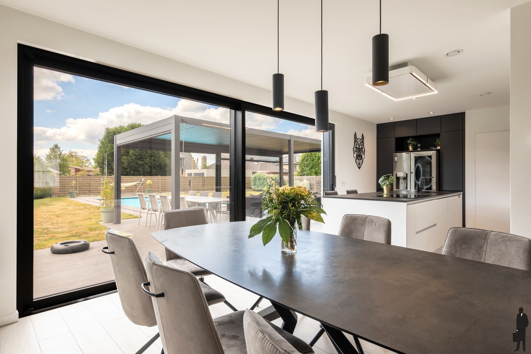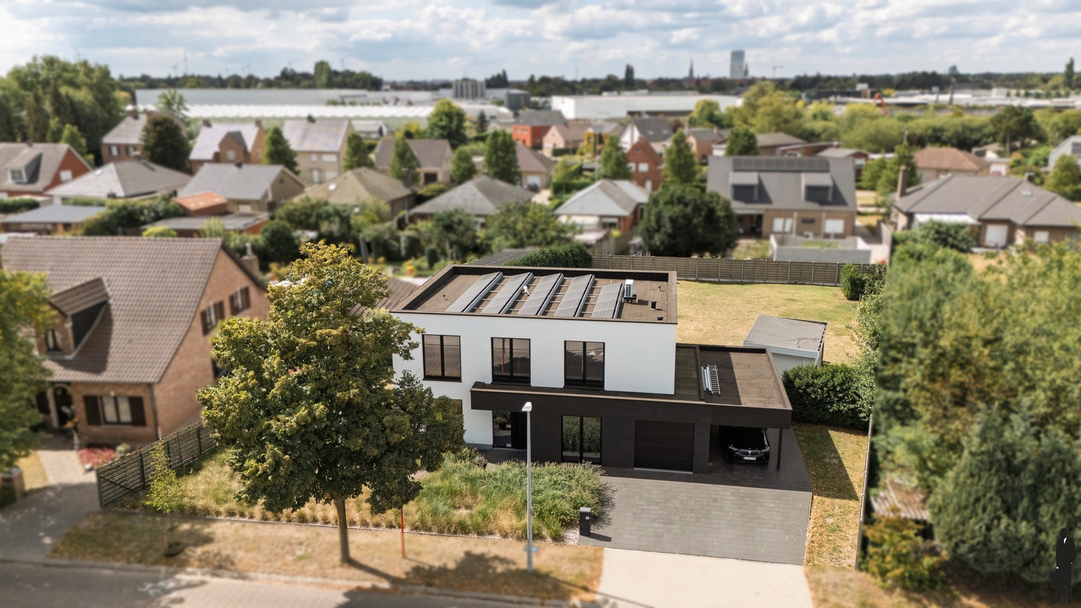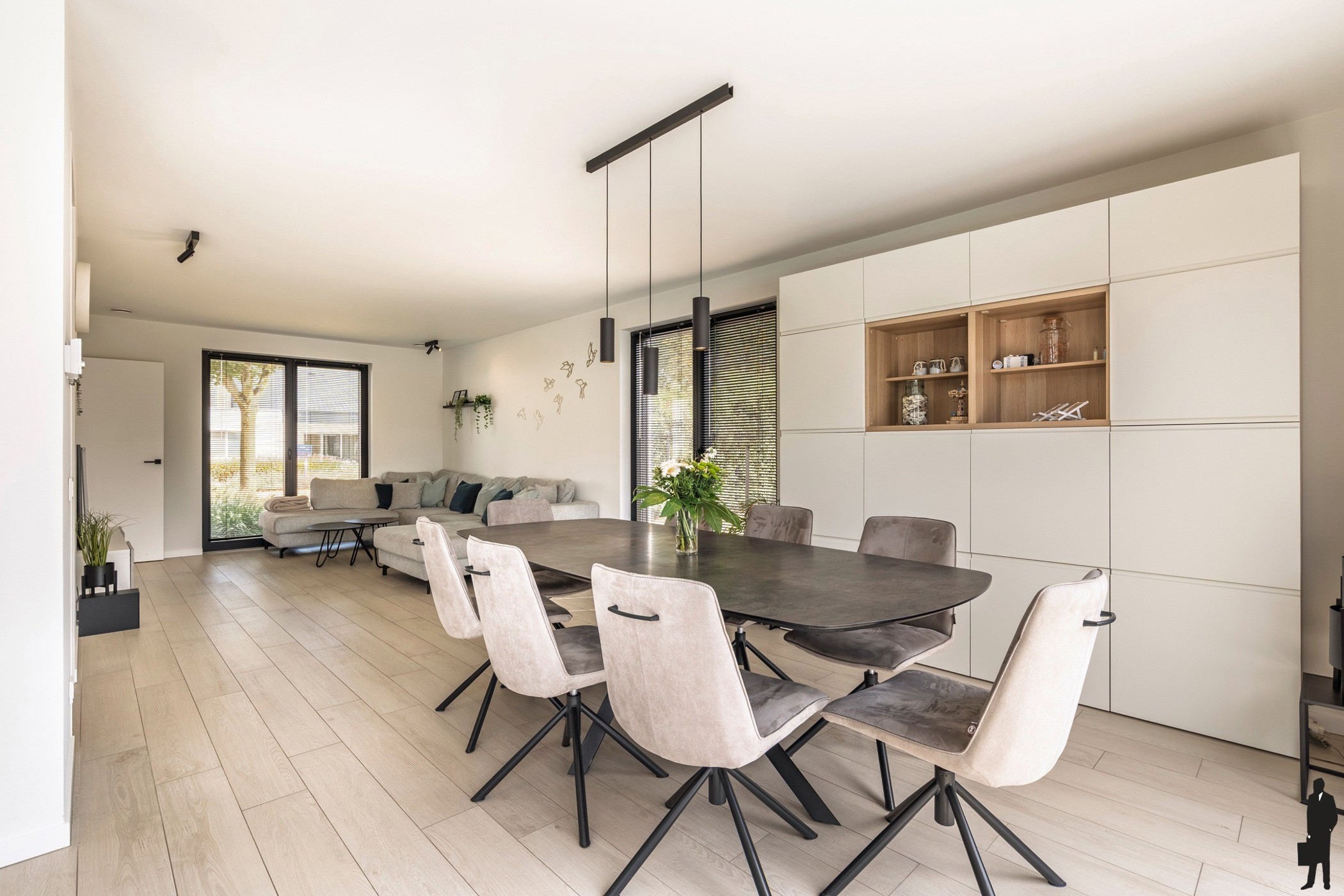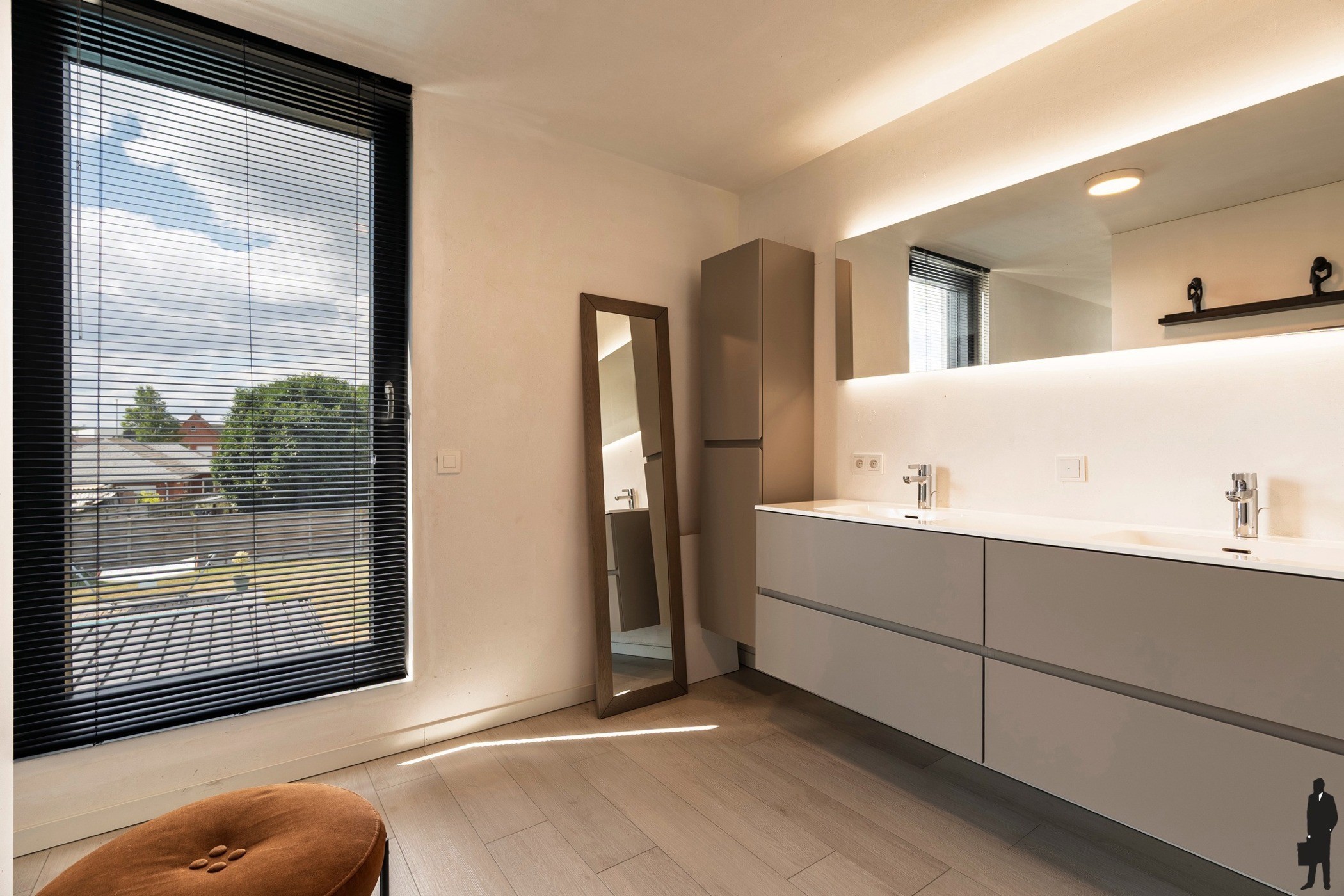 Gelijkvloerse verdieping: De inkomhal is voorzien van een vestiaireruimte, apart gastentoilet en bergruimte. Vanuit de inkomhal bereikt u enerzijds de lichtrijke leefruimte met grote schuifraam, anderzijds de bureauruimte. De open leefkeuken is volledig uitgerust met kwalitatieve AEG-toestellen: vaatwasser, oven, combi-oven, stoomoven, inductiekookplaat en een Amerikaanse koelkast. Aansluitend bevindt zich een praktische bijkeuken/wasplaats met ingemaakte kasten en een inkom langs de achterzijde met apart toilet. Verder beschikt de woning over een inpandige garage met automatische poort en een zijdeur naar de carport.