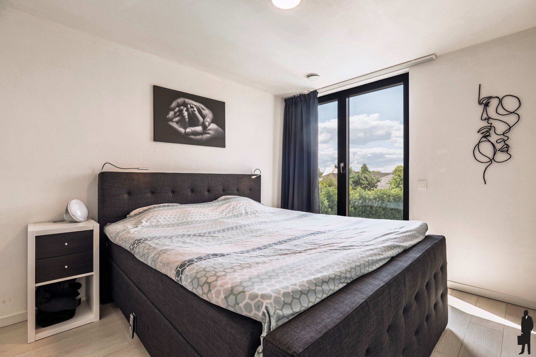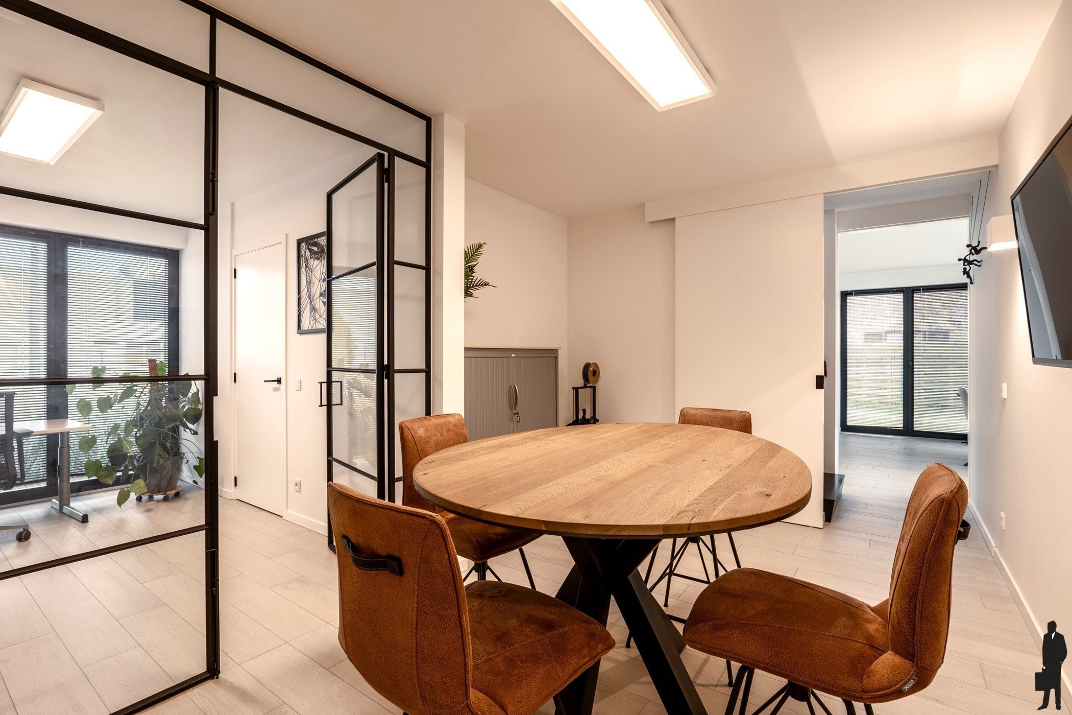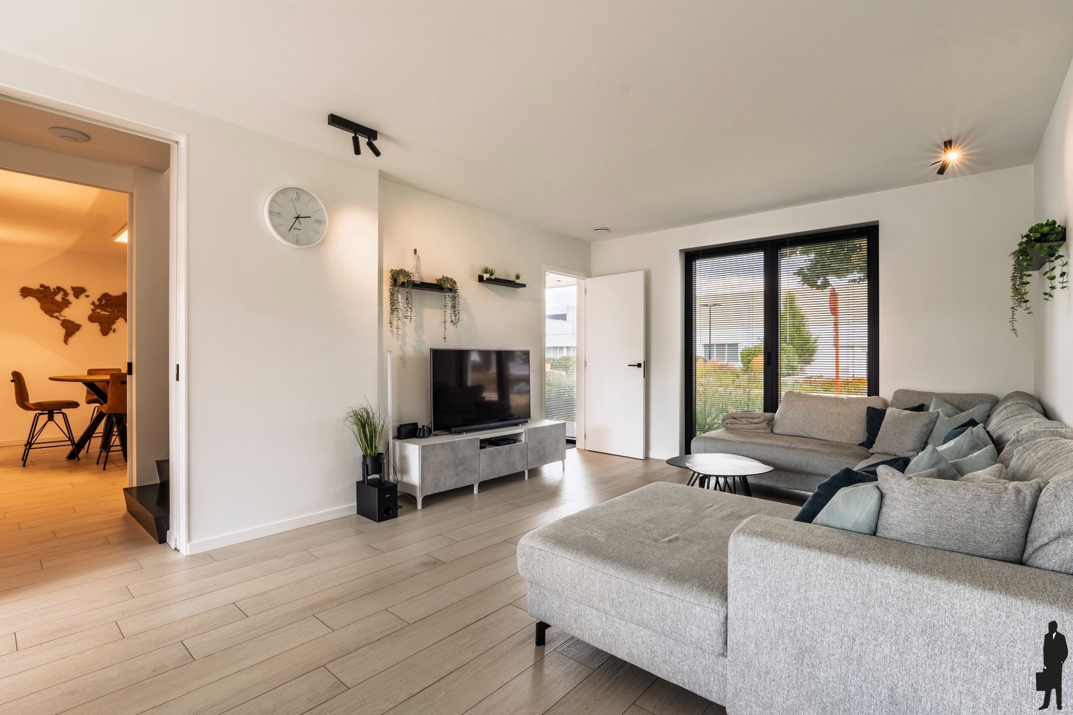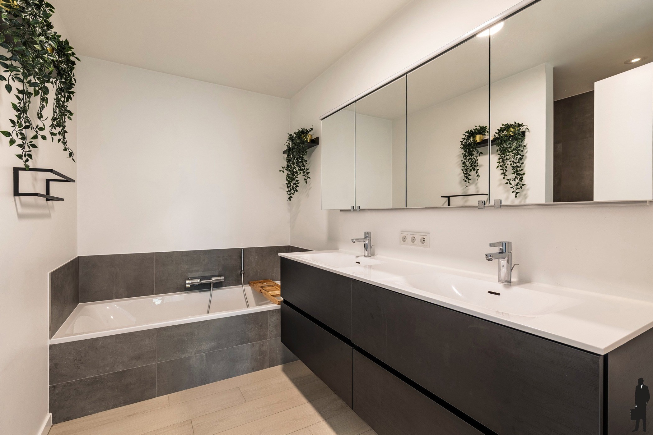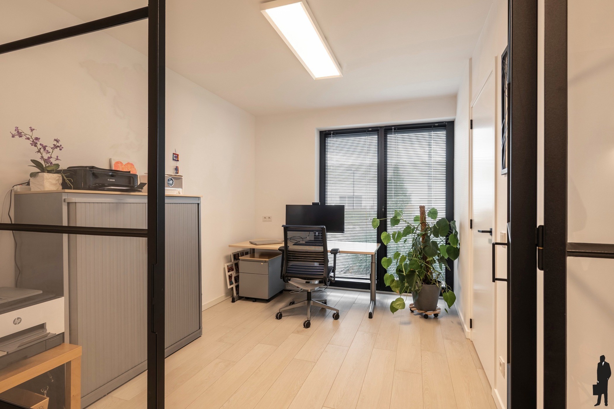 Gelijkvloerse verdieping: De inkomhal is voorzien van een vestiaireruimte, apart gastentoilet en bergruimte. Vanuit de inkomhal bereikt u enerzijds de lichtrijke leefruimte met grote schuifraam, anderzijds de bureauruimte. De open leefkeuken is volledig uitgerust met kwalitatieve AEG-toestellen: vaatwasser, oven, combi-oven, stoomoven, inductiekookplaat en een Amerikaanse koelkast. Aansluitend bevindt zich een praktische bijkeuken/wasplaats met ingemaakte kasten en een inkom langs de achterzijde met apart toilet. Verder beschikt de woning over een inpandige garage met automatische poort en een zijdeur naar de carport.