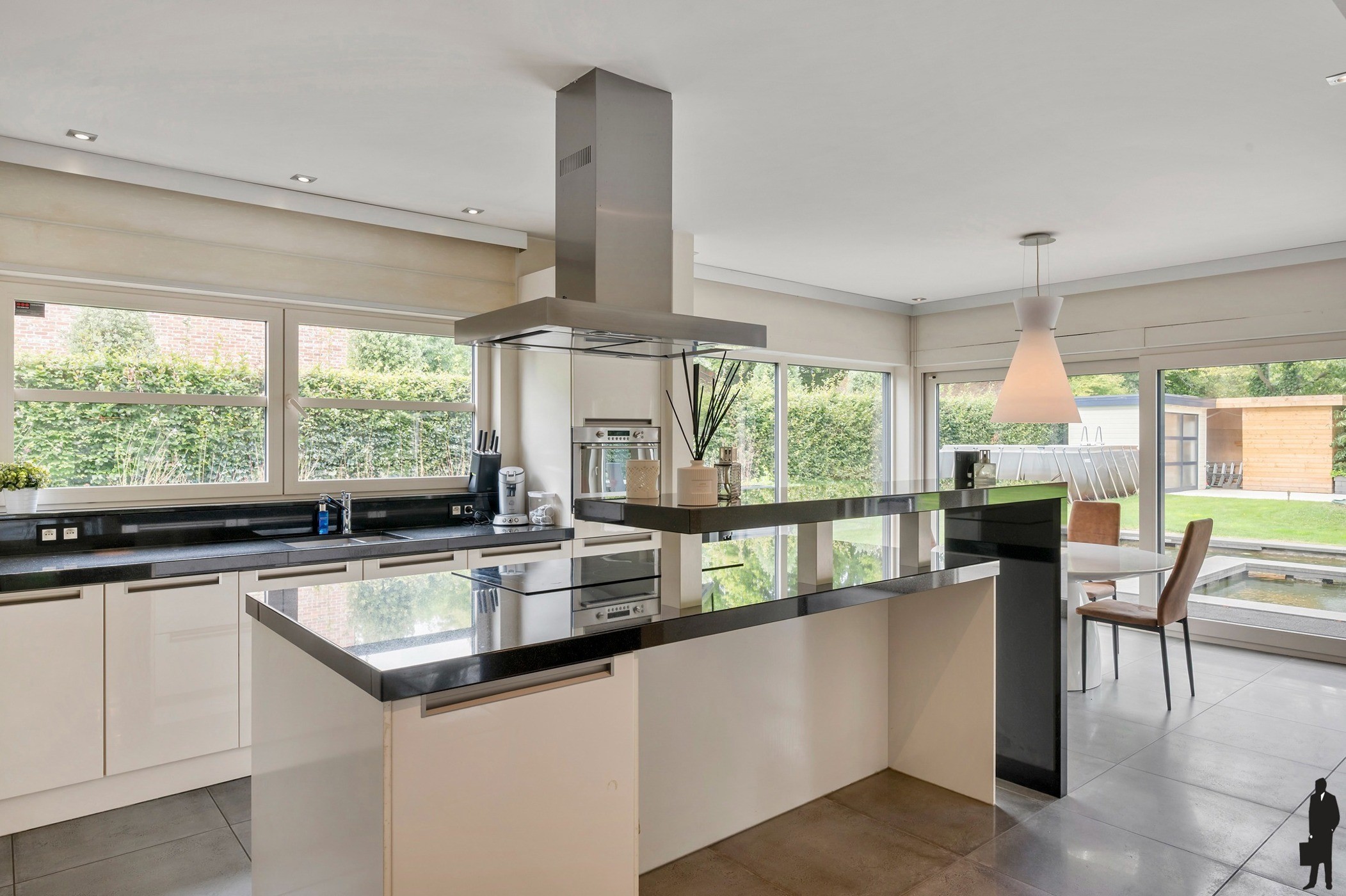 - Een leefkeuken met centraal kookeiland, inbouwtoestellen (Pelgrim oven, kookvuur, dampkap, dubbele lavabo, vaatwasser), ontbijthoek met schuifraam naar het terras en overvloedig lichtinval
