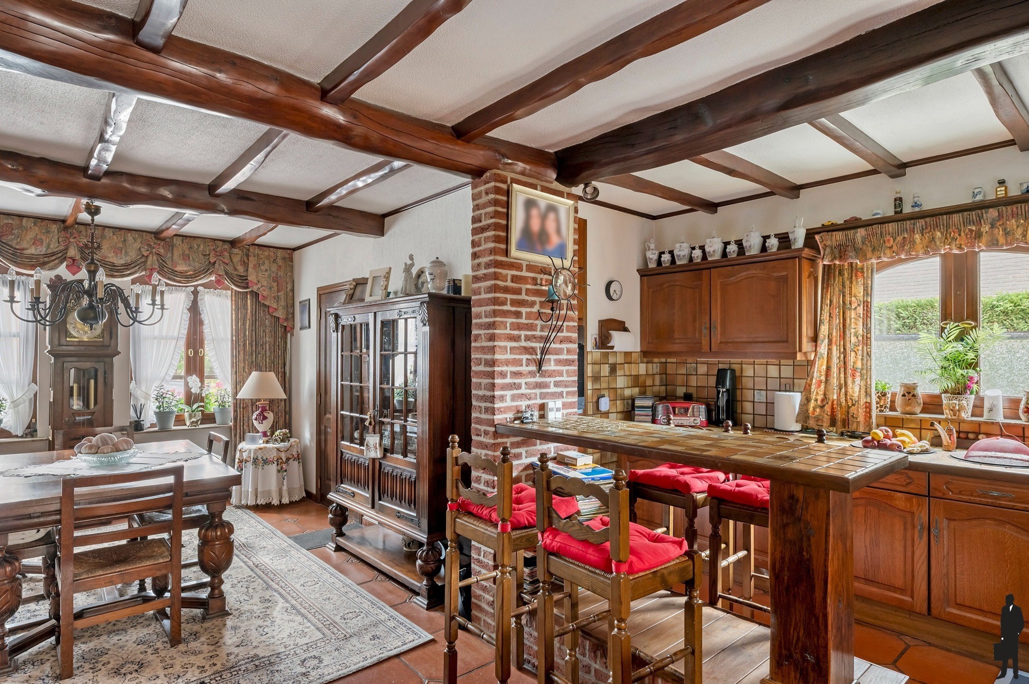 Op het gelijkvloers vind je de inkomhal met gastentoilet, een gezellige leefruimte met eetplaats, zithoek en authentieke open haard met houten balkenplafond, een keuken met bijkeuken, een lichtrijke veranda en een extra douchekamer. Vanuit de veranda is er toegang tot de tuin met gezellig terras en buitenhaard.