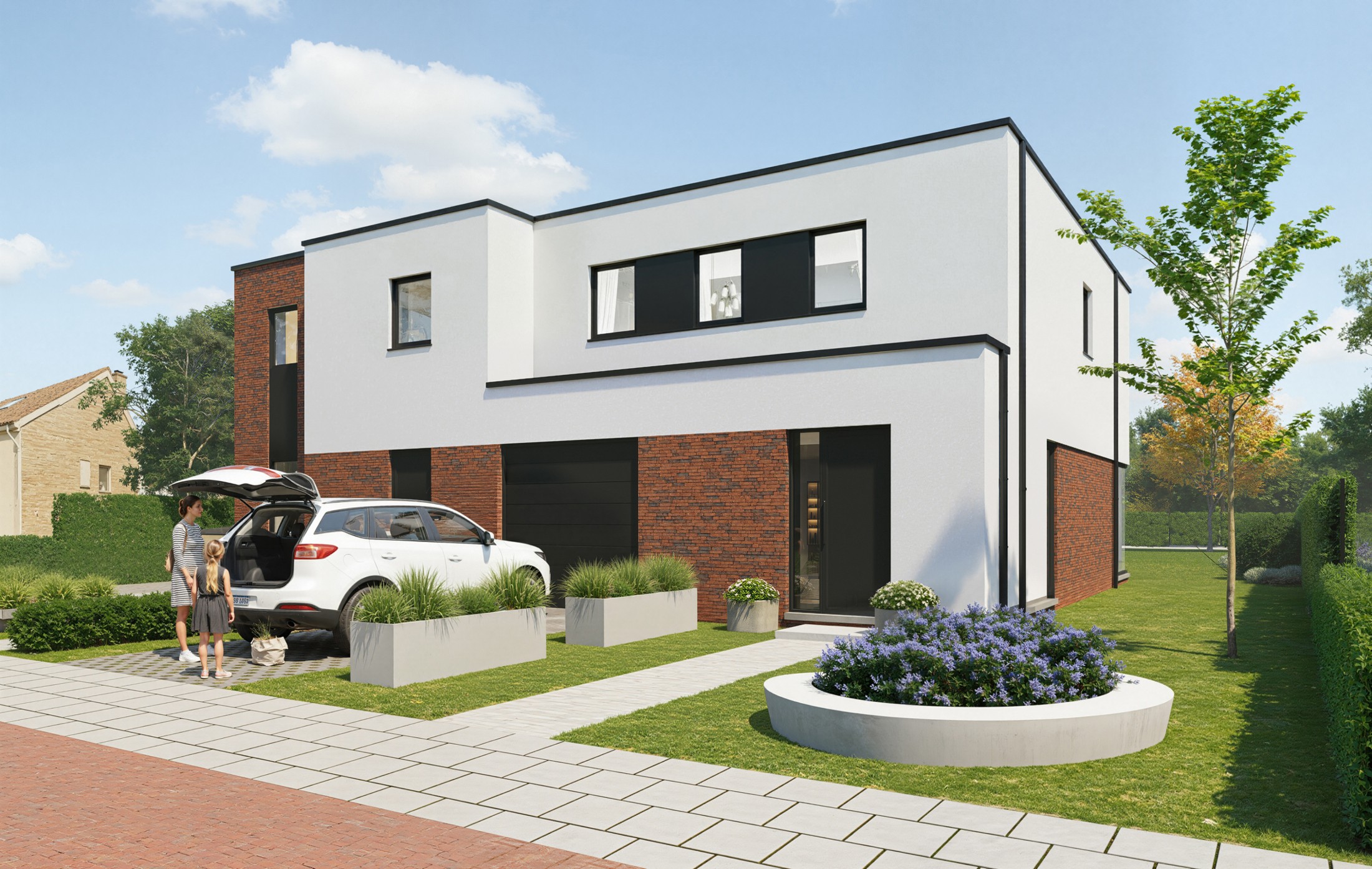 - Gevelafwerking: genuanceerde gevelsteen gecombineerd met witte buitenbepleistering en/of plaatbekleding