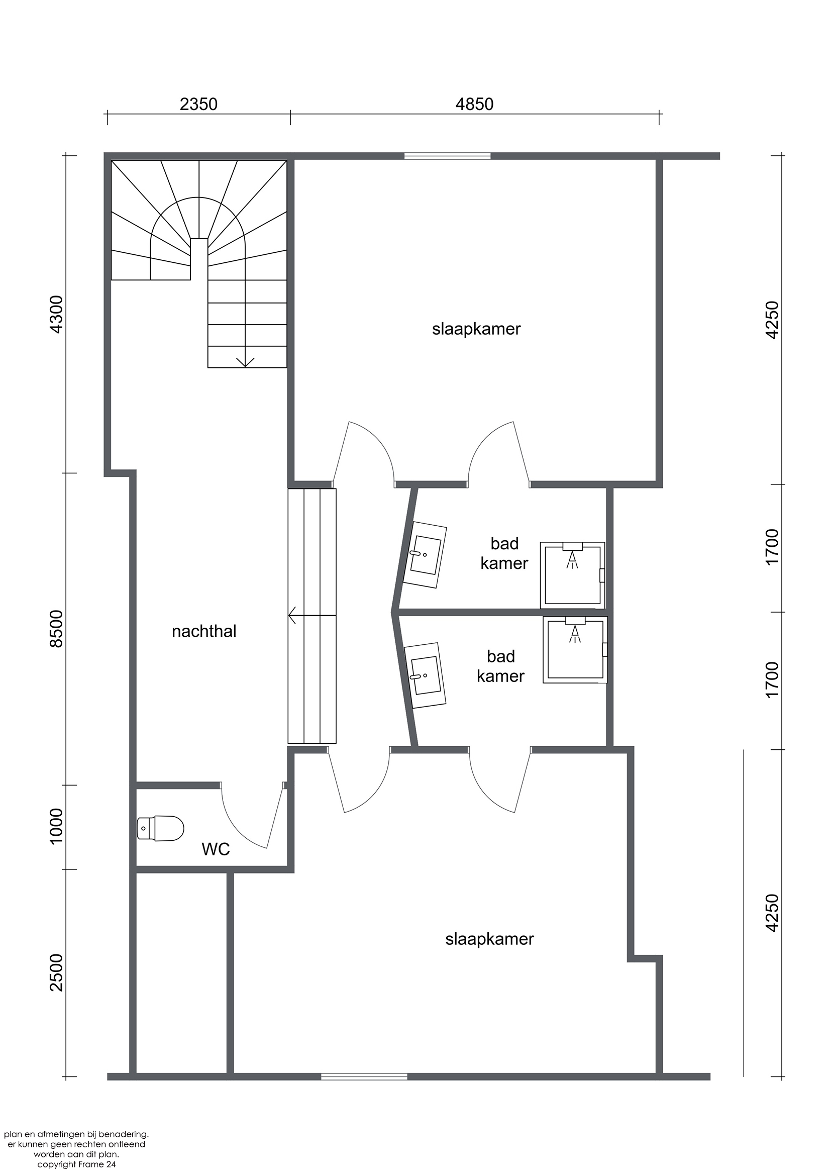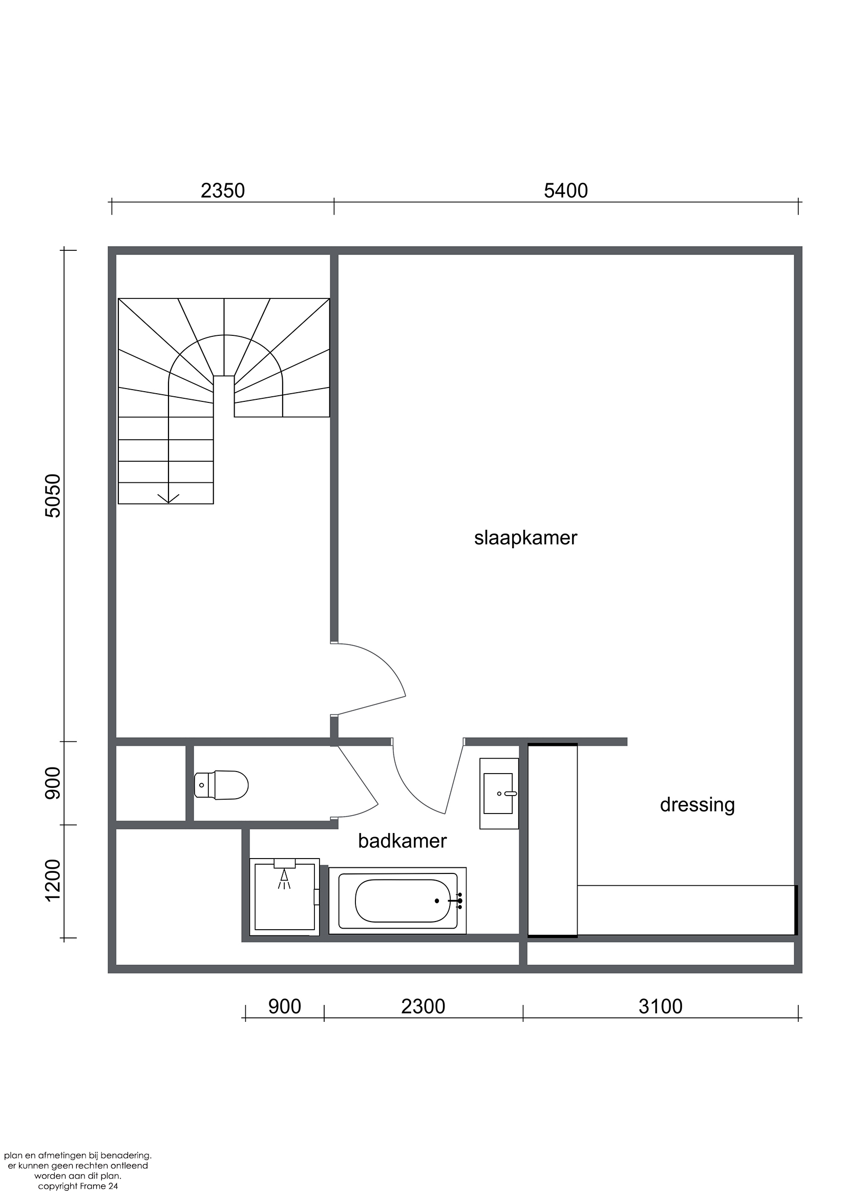 De split-level verdieping: - Een ruime dressing (ca. 26 m²) op vast tapijt met ingemaakte kasten - Een apart toilet - Een eerste slaapkamer (ca. 20 m²) met aanpalende zithoek (ca. 17 m²) en berging (mogelijkheid voor extra slaapkamer) - Een badkamer (ca. 17 m²) met dubbele gootsteen, ingemaakte kasten, douche, ligbad en bidet.