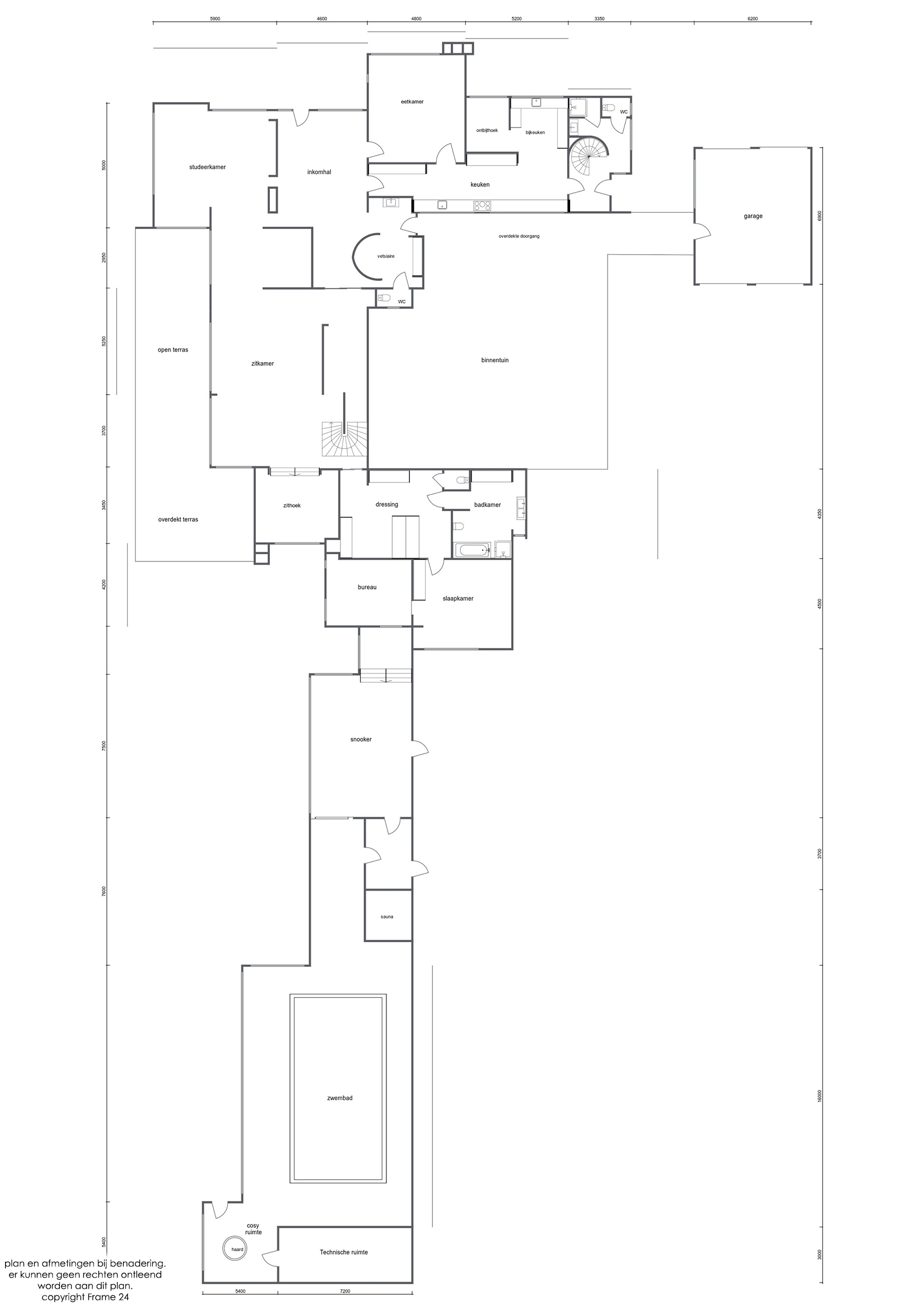 De gelijkvloerse verdieping: - Een inkomhal op marmer met vestiaire, gootsteen en gastentoilet - Middels glazen deur naar woonkamer (ca. 70 m²) op vast tapijt met open haard, en schuiframen naar de tuin en overdekt terras - Een verlaagd zithoek (ca. 12 m²) op vast tapijt, eveneens met open haard - Een aanpalende bar (ca. 16 m²) - Een ruim bureau (ca. 29 m²) op parket, eveneens met schuiframen naar de tuin - Een eetkamer (ca. 25 m²) eveneens op marmer - Een keuken (ca. 20 m²) met inbouwtoestellen - Een aanpalende verhoogde ontbijthoek (ca. 4 m²) op vast tapijt - Een bijkeuken (ca. 8 m²) met dubbele gootsteen en aansluiting voor wasapparatuur - Een dienstingang met ingemaakte kasten, lavabo, apart toilet en douchekamer - Via dienstingang naar een ruime kelder bestaande uit wijnkelder, berging en technische kelder - Een polyvalente ruimte/snookerkamer met schuifraam naar de tuin - Een Een poolgedeelte/wellness met binnenzwembad (12 m op 6m) + jetstream, chloor, roldek alsook 2 kleedkamers, toilet, berging, douchekamer, technische berging, sauna, lavabo, bar met gootsteen, zitgedeelte met open haard en toegang naar de tuin - Een aparte dubbele garage (ca. 42 m²).