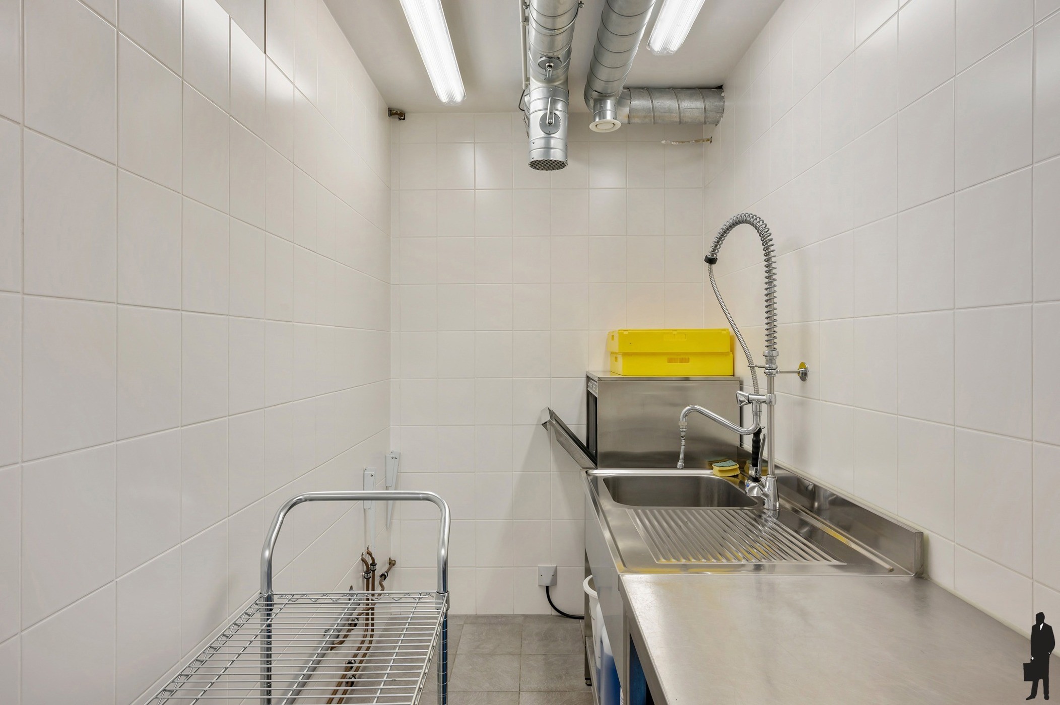 - Een ingerichte bedrijfskeuken met industriële toestellen in roestvrij staal met aanpalende afwaskeuken.