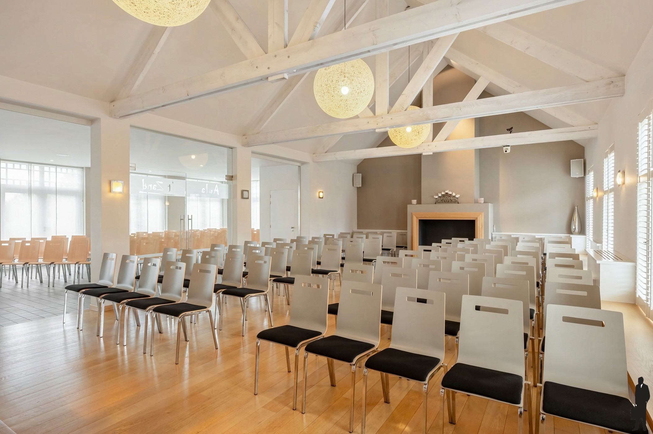 - Een aula (Ca. 85 m²) met open haard
