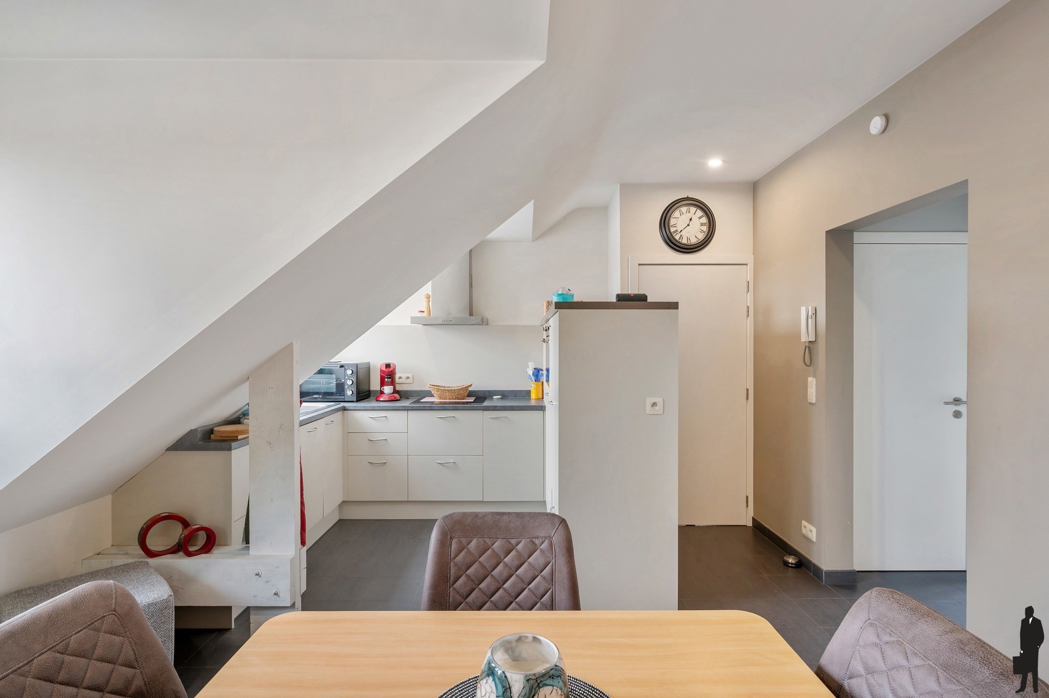 - Een open keuken met inbouwtoestellen