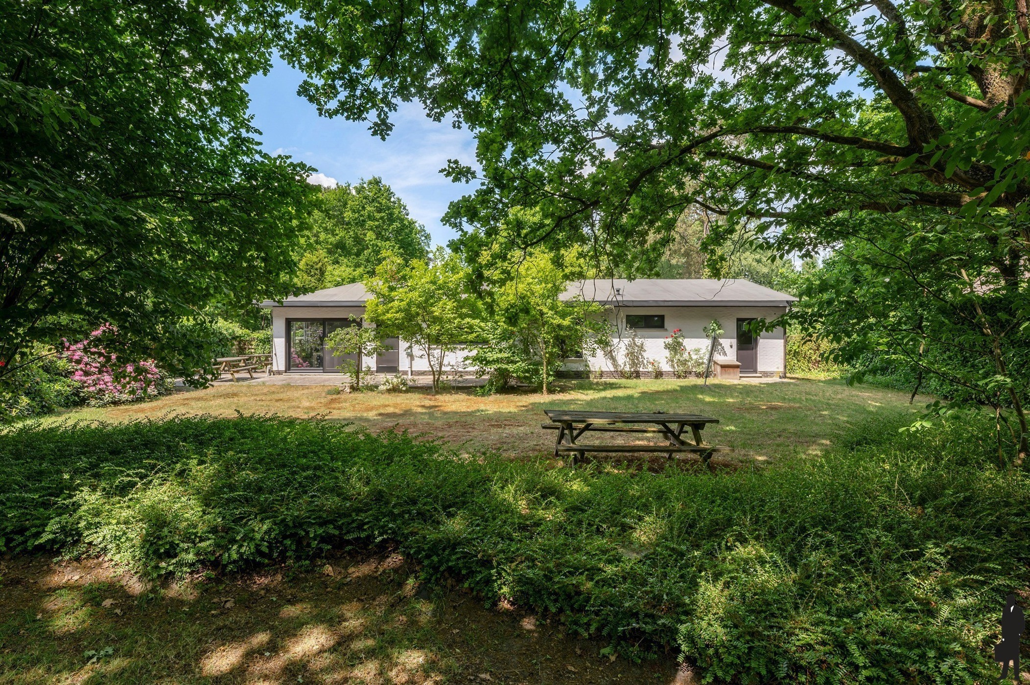 De woning biedt vooraan buitenparking voor 5 à 6 wagens. Aan de beide zijden van de woning bevinden zich groenstructuren en rechts een oostgeoriënteerd ochtendterras. Beide vleugels beschikken over ruime (overdekte) terrassen. Deze terrassen geven uit op een diepe, landelijke en private natuurtuin, ideaal georiënteerd op het Westen. U vindt er naast (groenblijvende en bloeiende) heesters zoals hortensia's, rododendrons ook imposante eikenbomen, Wilde wingerd, krentenboompjes, plataanbomen en krulwilg. Achteraan is er een denbosgedeelte.