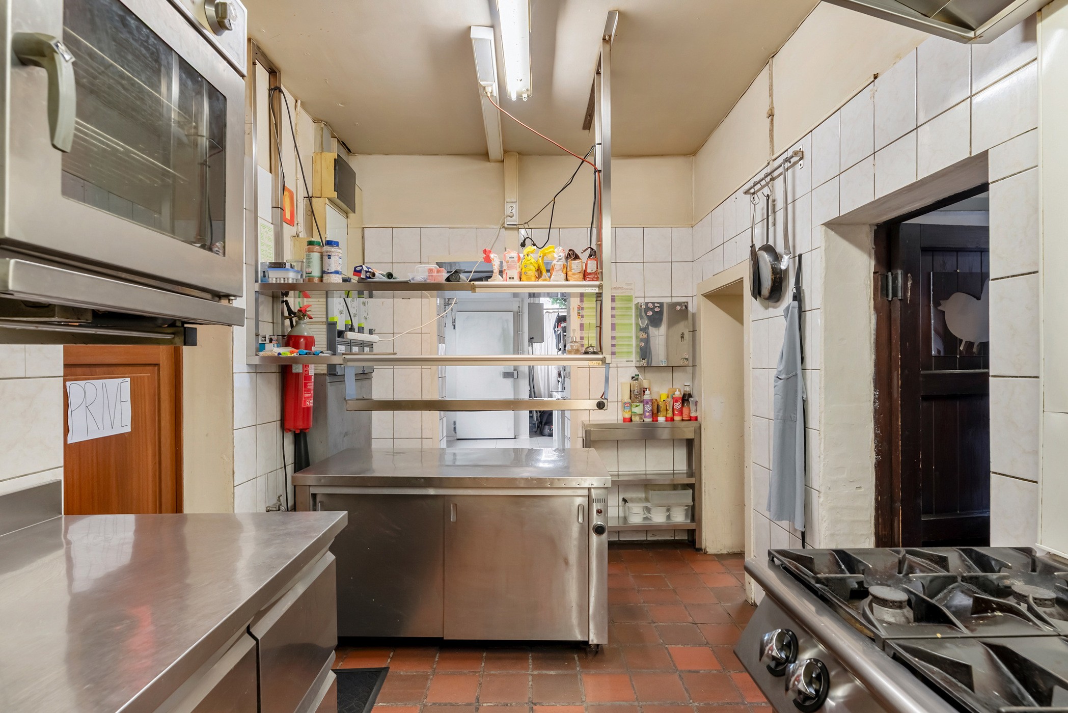 We betreden de eetgelegenheid via de inkomhal. Verder zien we het zitgedeelte met bar, tussenhal met een vrouwen en mannentoilet, garage, wasplaats, berging en volledig uitgeruste keuken met koelcel.