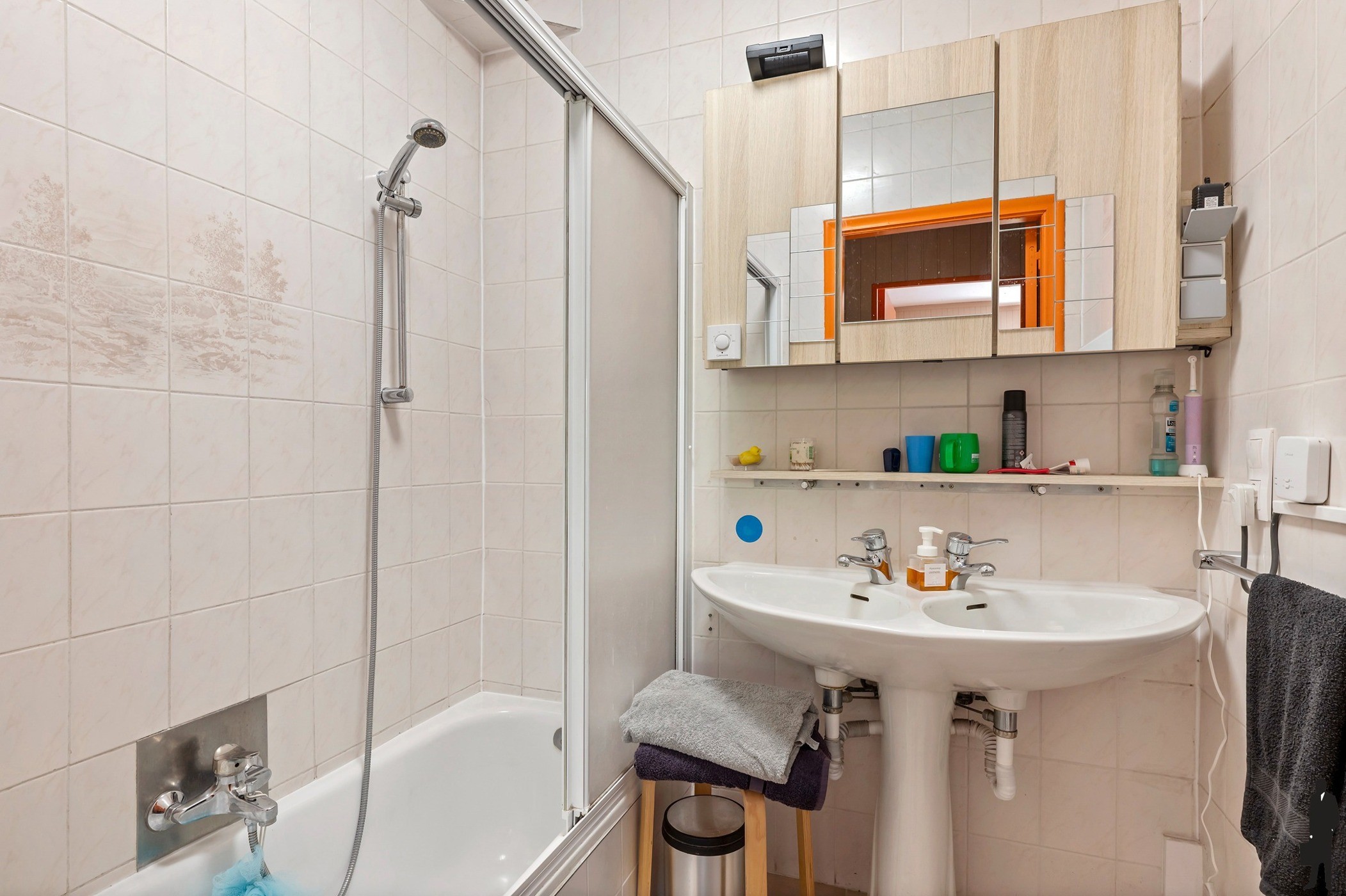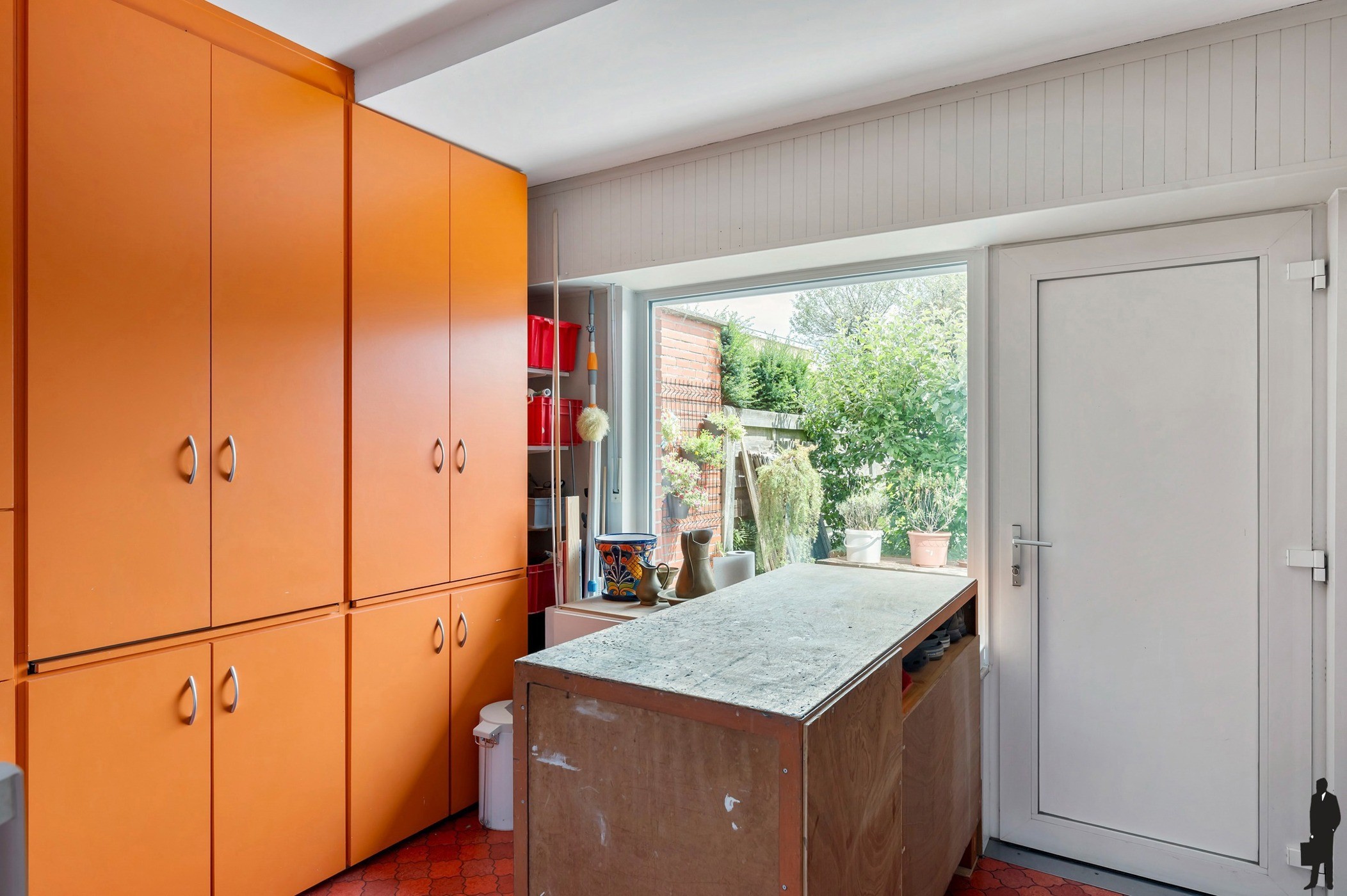 Gelijkvloerse verdieping: Via de inkomhal betreedt u de woning. Een ingemaakte kast onder de trap biedt hier een handige vestiaireoplossing. Daarnaast is er een apart gastentoilet. Op deze verdieping bevinden zich twee (slaap)kamers en een badkamer. De hoofdslaapkamer is uitgerust met rolluiken en geniet van een rustige ligging achteraan. De tweede kamer – momenteel ingericht als werkkamer – beschikt over ingemaakte kasten en biedt rechtstreeks toegang tot de tuin. De badkamer is voorzien van een douche in bad en een dubbele wastafel. Tot slot is er een inpandige garage met kantelpoort en aparte deur. Hier zijn ook aansluitingen voorzien voor wasmachine en droogkast.