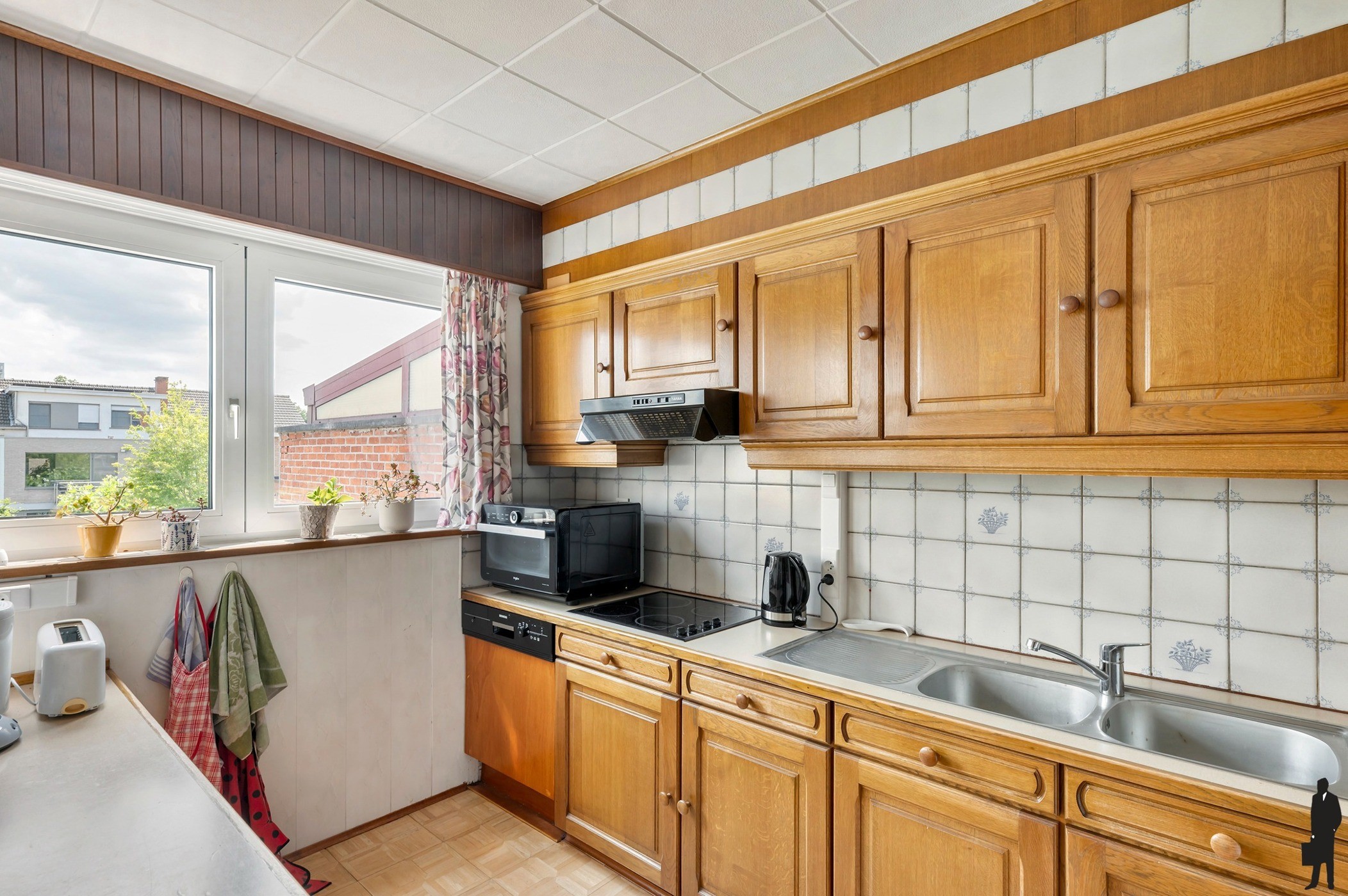 De aangrenzende keuken is functioneel ingericht en voorzien van alle nodige toestellen: een keramisch kookvuur, vaatwasser, koelkast met vriesvak en een combi-oven. Ook op deze verdieping bevindt zich een apart toilet.