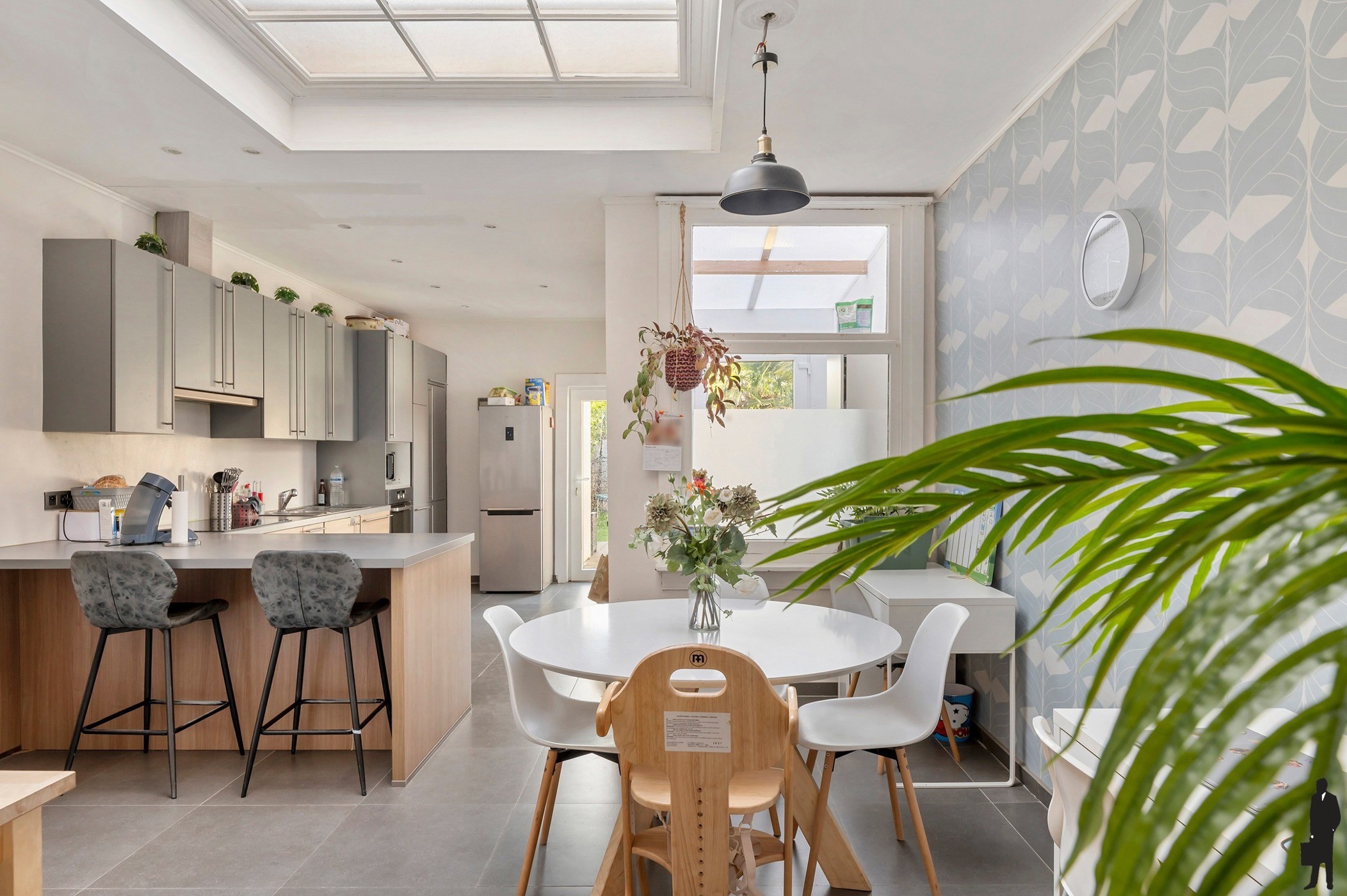 - Eetkamer nabij de geïnstalleerde keuken met toegang tot de tuin