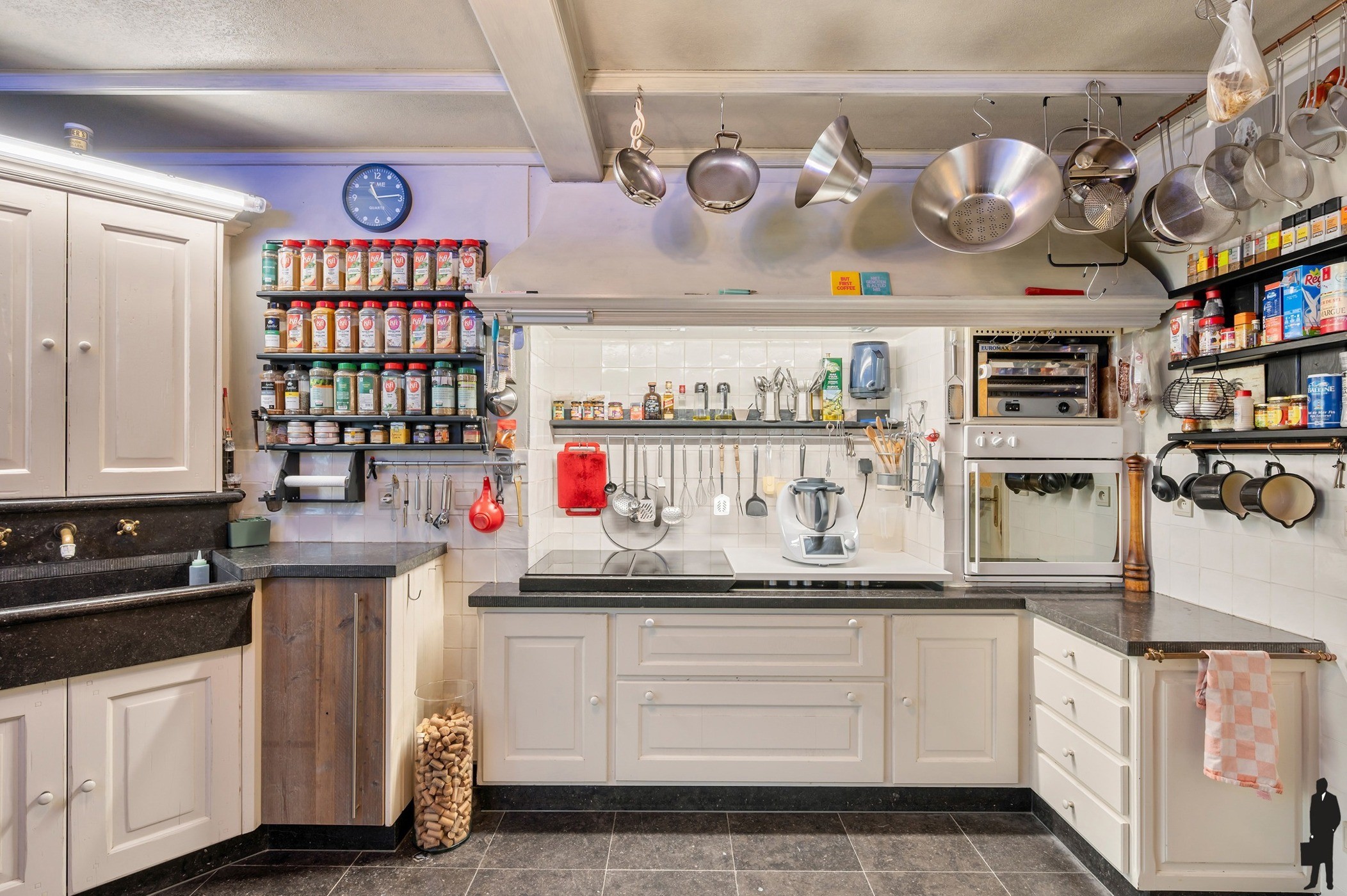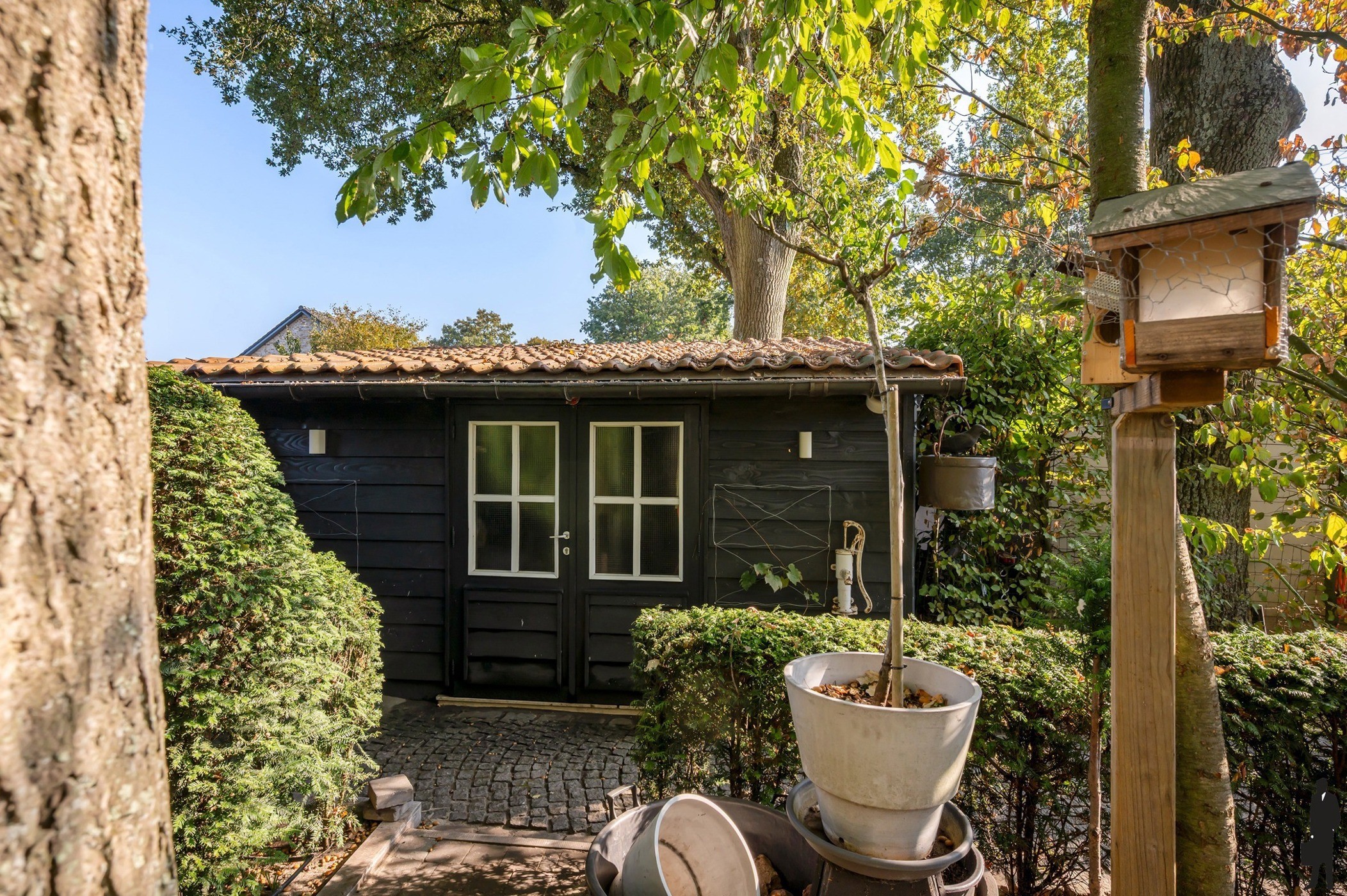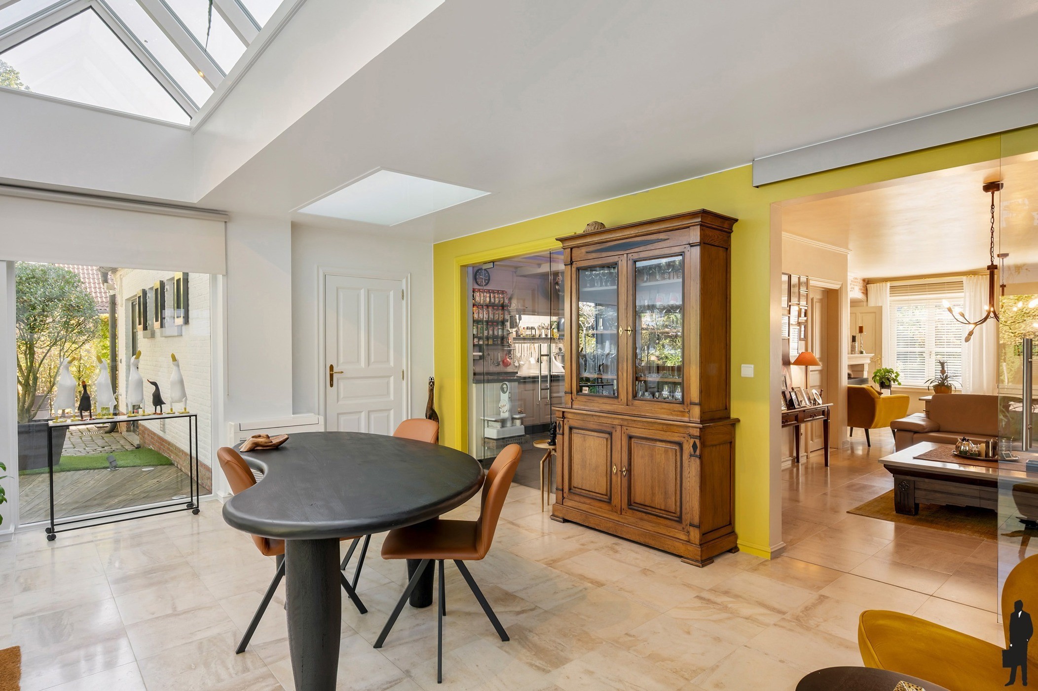 Via de inkomhal met gastentoilet bereik je de lichtrijke leefruimte die is ingedeeld in een gezellige zithoek met open haard en een ruime eetplaats. De grote raampartijen zorgen voor een mooie lichtinval en bieden zicht op de groene omgeving. Aansluitend bevindt zich de aanbouw met glazen dakpartij, een aangename ruimte die vandaag dienstdoet als eetkamer en waar binnen en buiten naadloos in elkaar overvloeien. De volledig uitgeruste keuken sluit hier perfect bij aan en beschikt over kwalitatieve toestellen en voldoende kastruimte. Verder is er een praktische wasplaats en een ruime inpandige garage met plaats voor twee wagens en extra berging.
