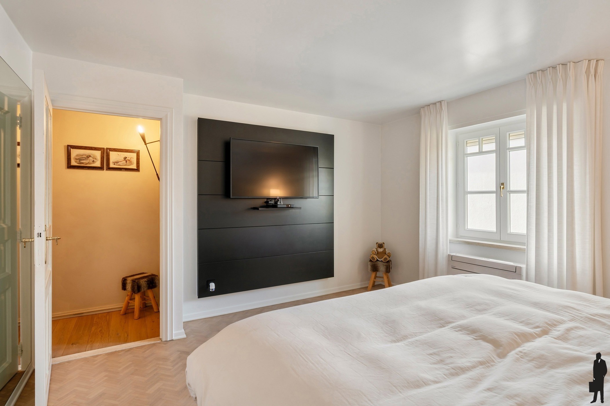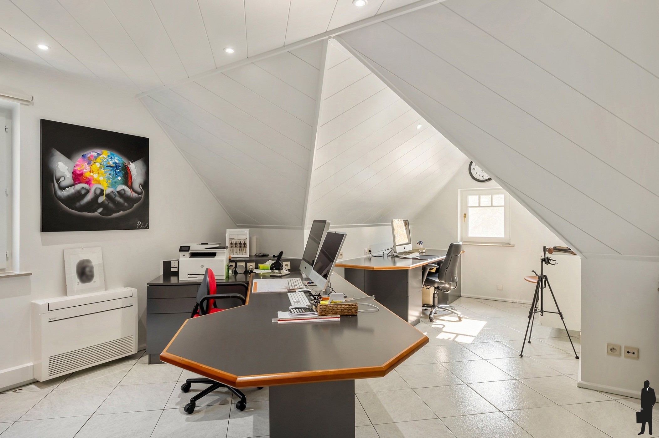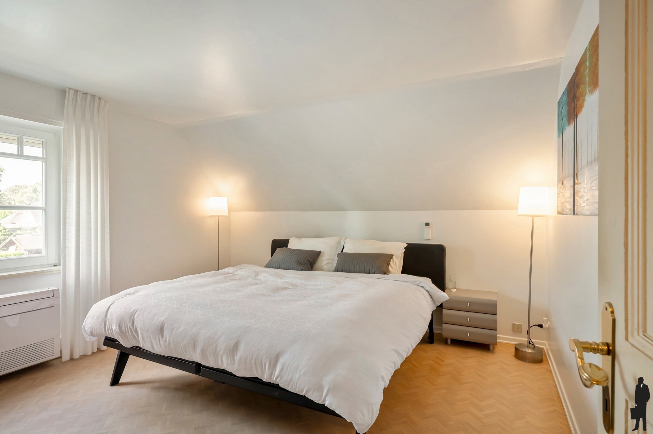 De eerste verdieping omvat een ruime nachthal met toegang tot de masterbedroom, twee bijkomende slaapkamers waarvan één momenteel als dressing is ingericht en werd voorzien van sauna, en een ruime badkamer voorzien van ligbad, douche en lavabo. De vierde kamer wordt momenteel gebruikt als bureel of thuiskantoor, ideaal voor wie graag van thuis uit werkt.