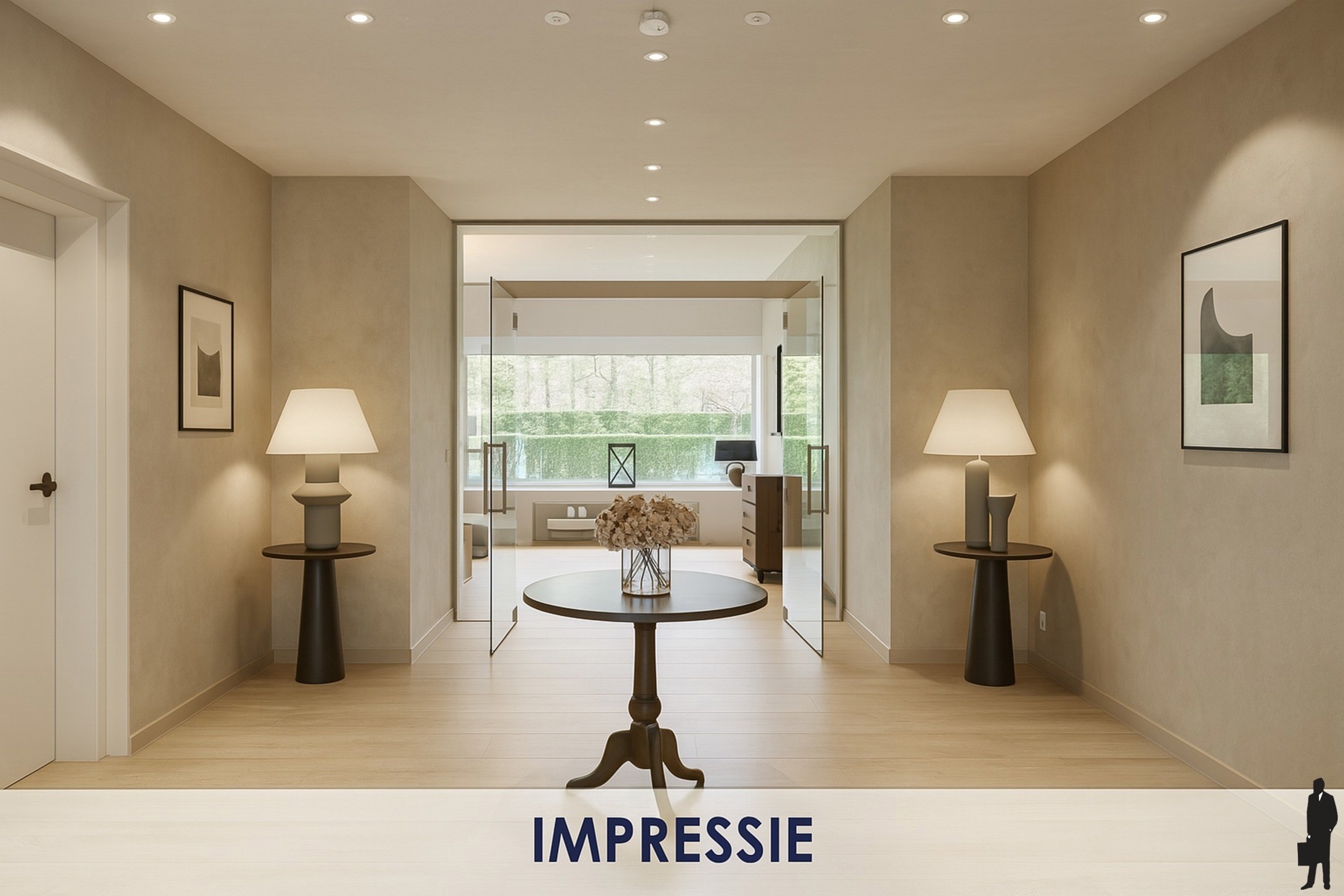 Riante entree met ruime vestiairekasten en gastentoilet; via glazen deuren doorzicht naar achtertuin en ruime tussenhal met bureel.