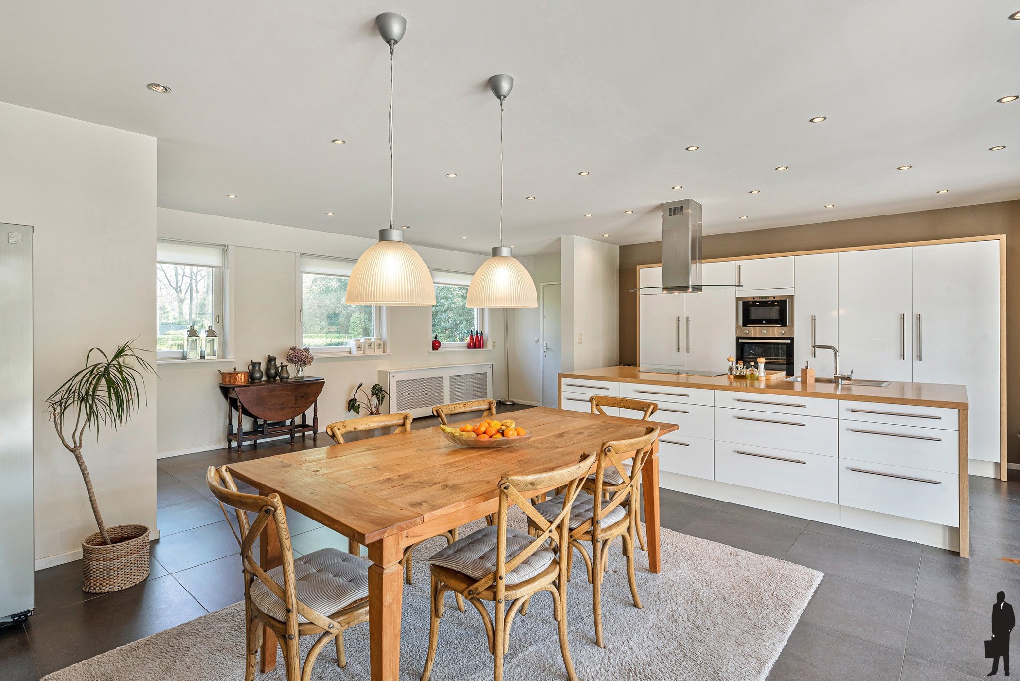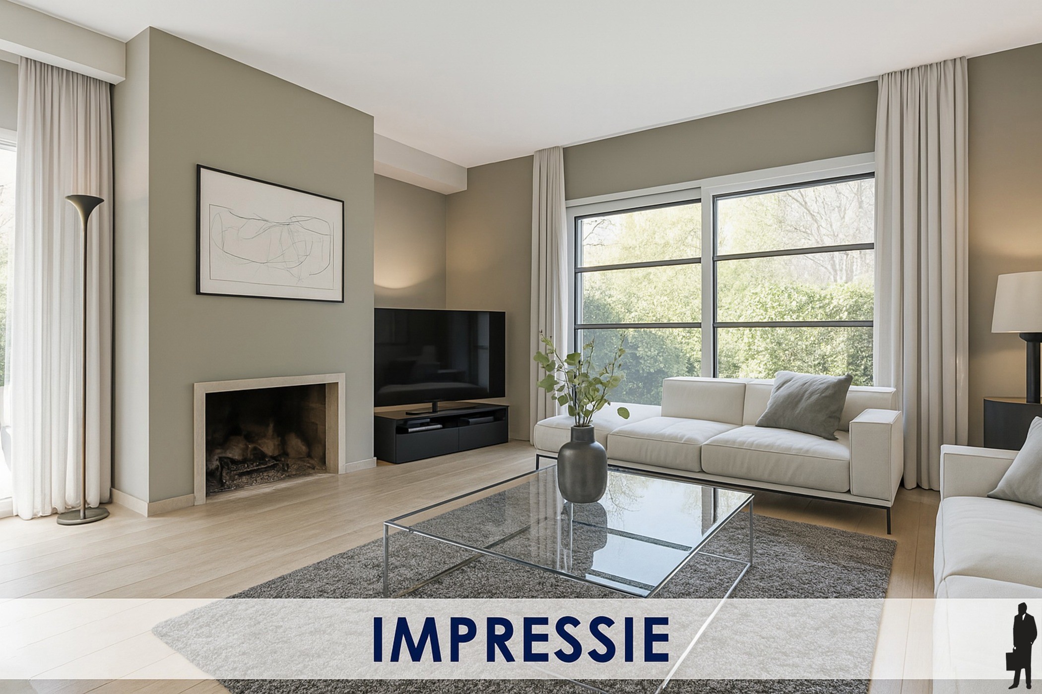 Voorts dubbele schuifdeuren naar zonnige L-vormige living bestaande uit een zitgedeelte (43m²) met open haard en eetkamer (36m²); voorzien van aluminium schuiframen en panoramaraam met uitzicht op de achtertuin met ruim terras.