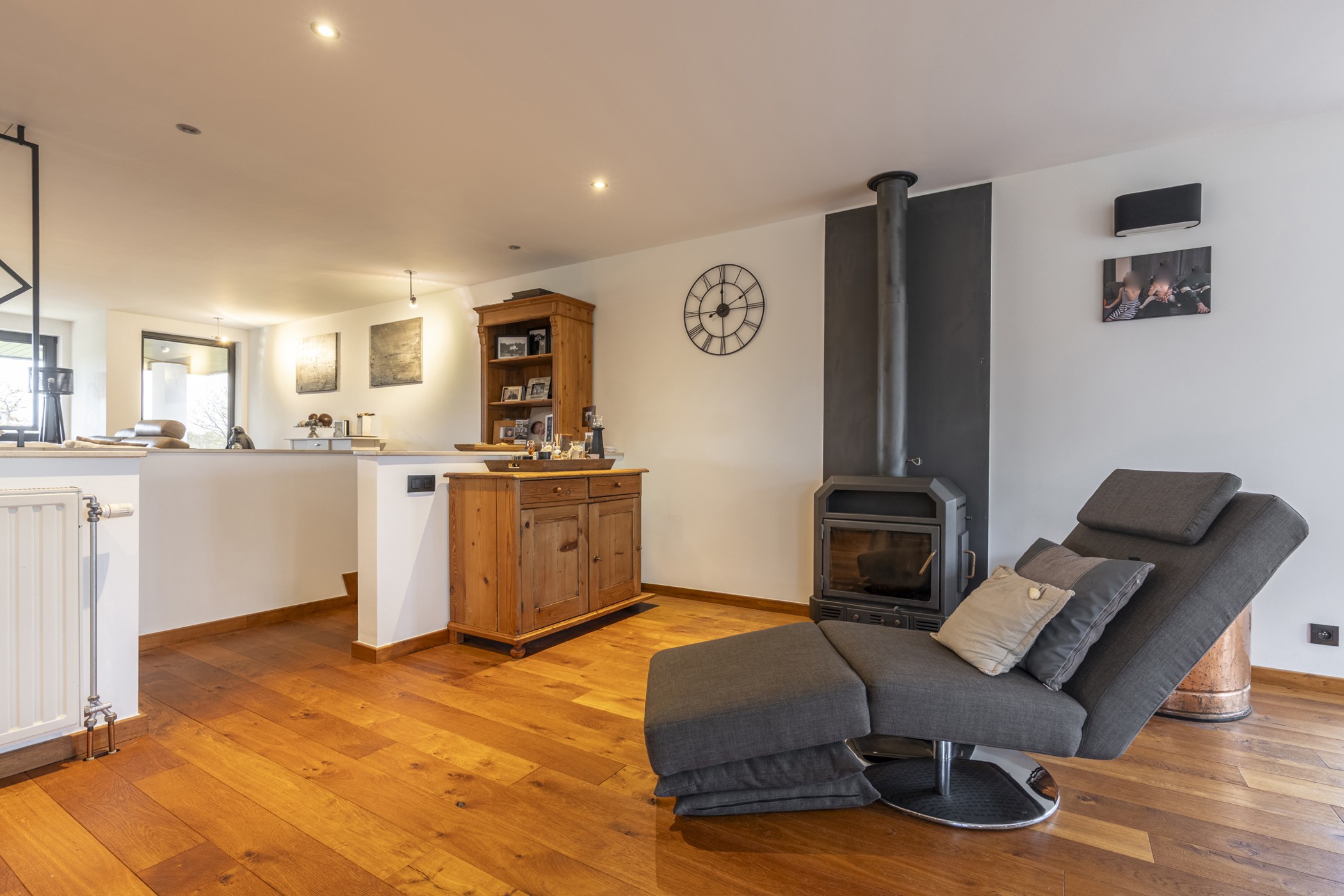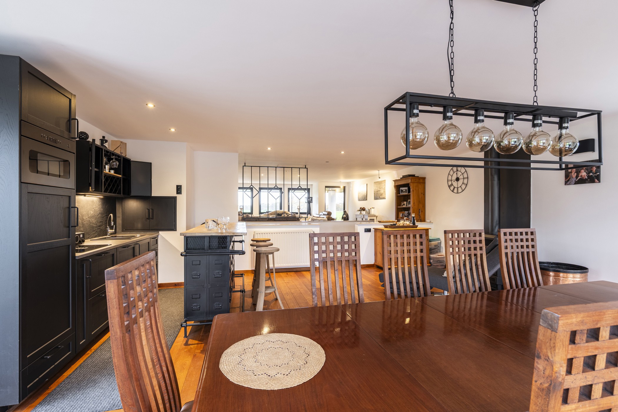 Binnenin geniet je van een ruime leefomgeving met een lichtrijke woonkamer die uitkijkt op uitgestrekte weidevelden, een prachtig panoramisch zicht dat elke dag rust en natuurbeleving brengt. De woning beschikt over vier volwaardige slaapkamers, waarvan enkele zich op het gelijkvloers bevinden, ideaal voor wie gelijkvloers wil wonen. De ruime badkamer is praktisch en hedendaags ingericht.