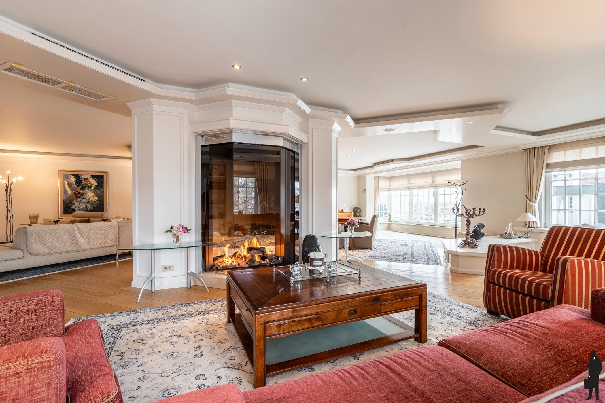 • Grote raampartijen, stijlvolle plafonddetails en een centraal geplaatste panoramische haard zorgen voor een warme, uitnodigende sfeer.
