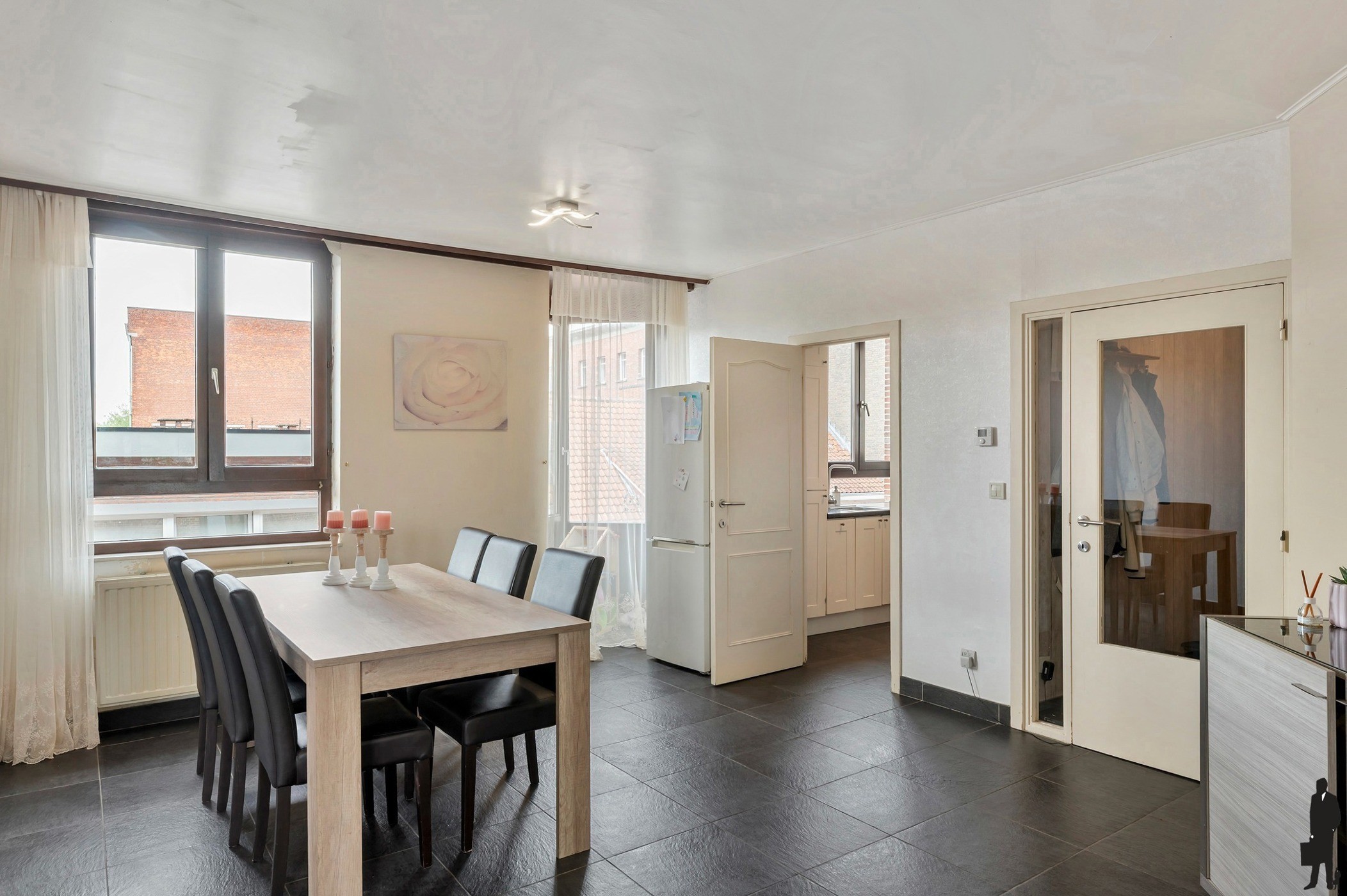 Bij het betreden van het appartement kom je in een ruime inkomhal die toegang biedt tot alle vertrekken. De gezellige woonkamer baadt in natuurlijk licht en geeft via het grote schuifraam toegang tot een aangenaam terras aan de achterzijde met uitzicht op een rustige binnenplaats – ideaal om even tot rust te komen.