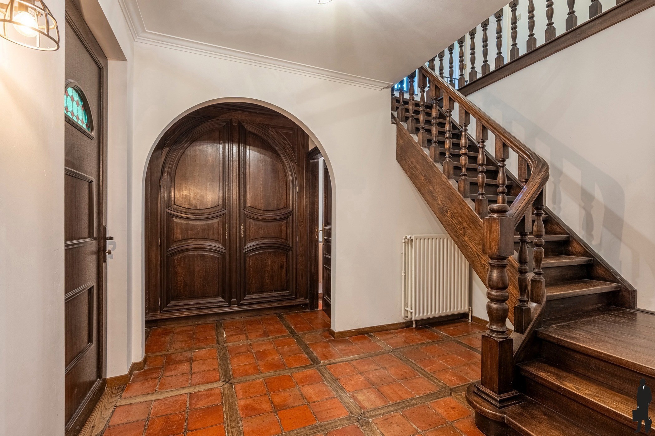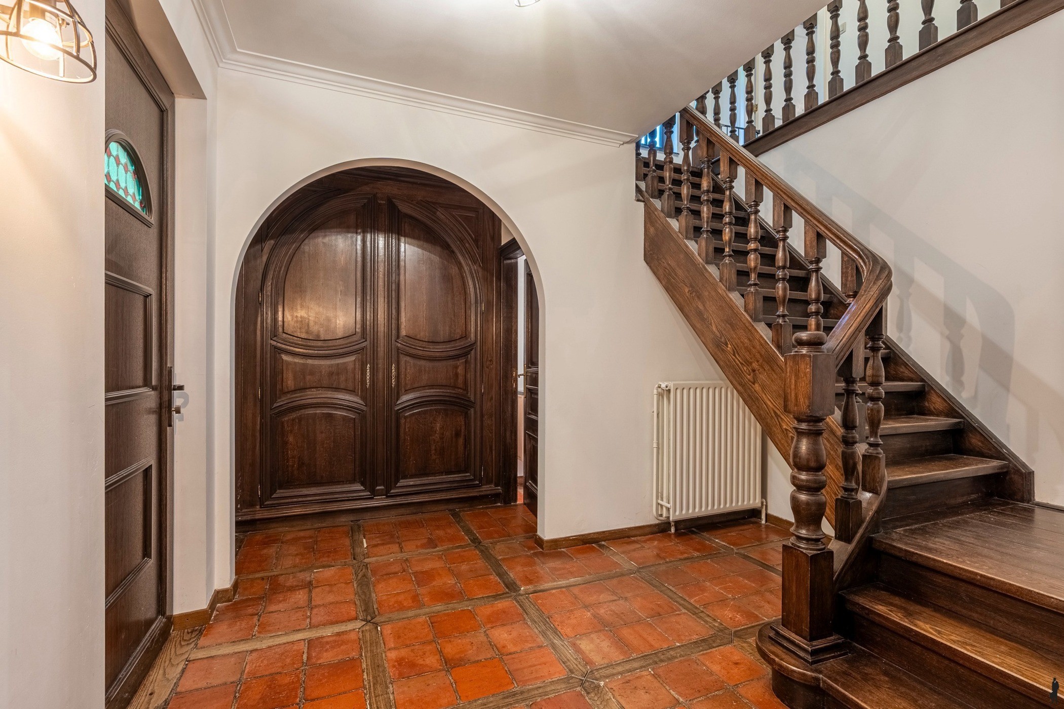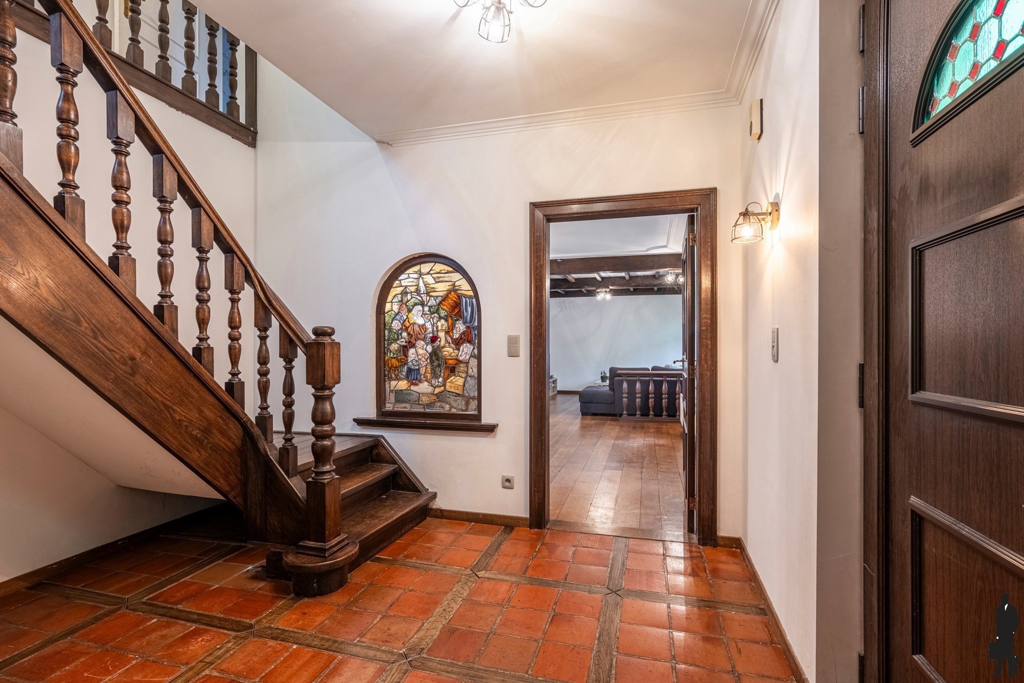 Via de ruime en uitnodigende inkomhal wordt u meteen warm onthaald. De natuurstenen vloer, de prachtige massief eiken trap en de ruime vestiaire met gastentoilet stralen klasse en degelijkheid uit en zetten meteen de toon voor de rest van de woning.