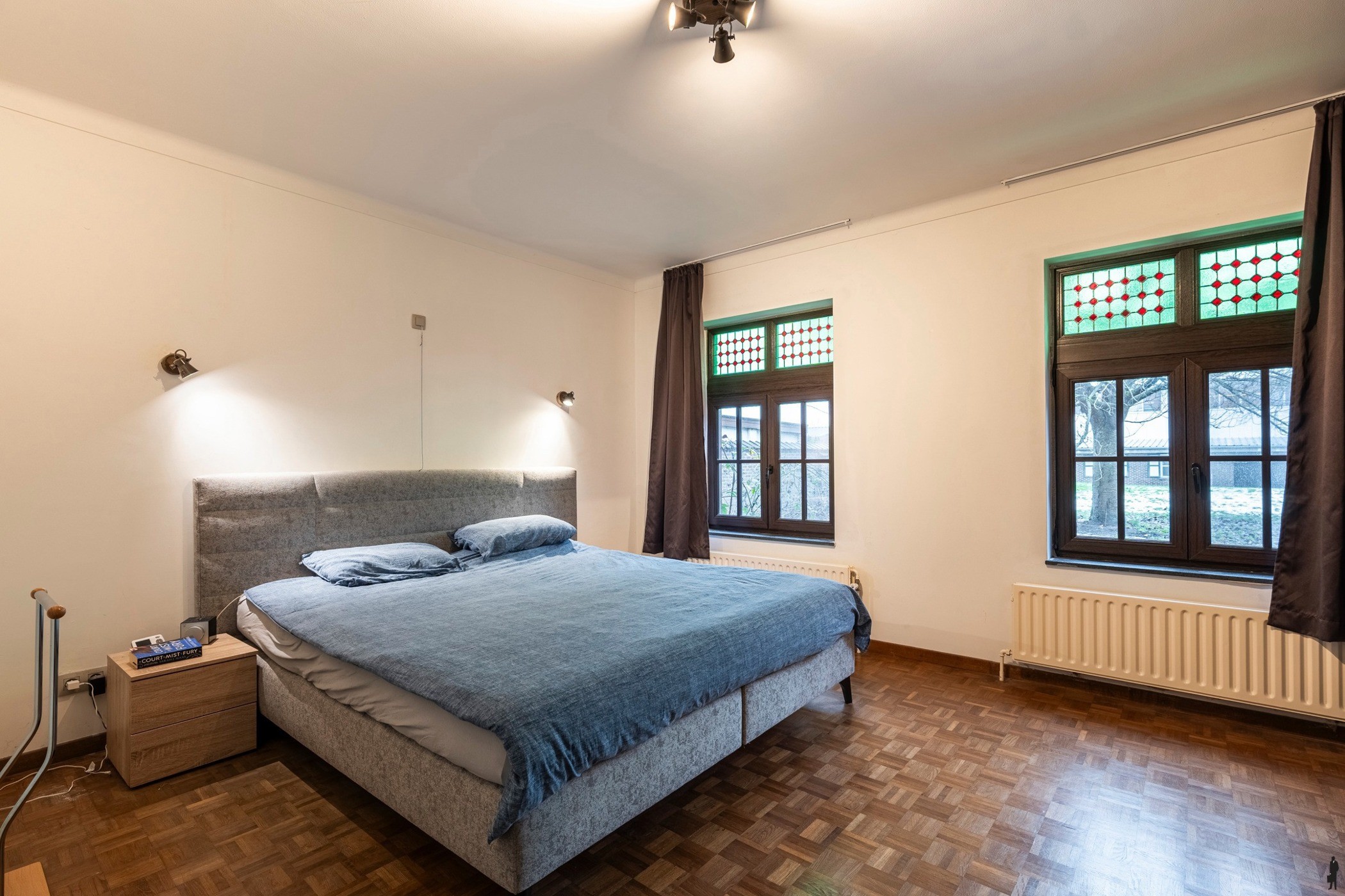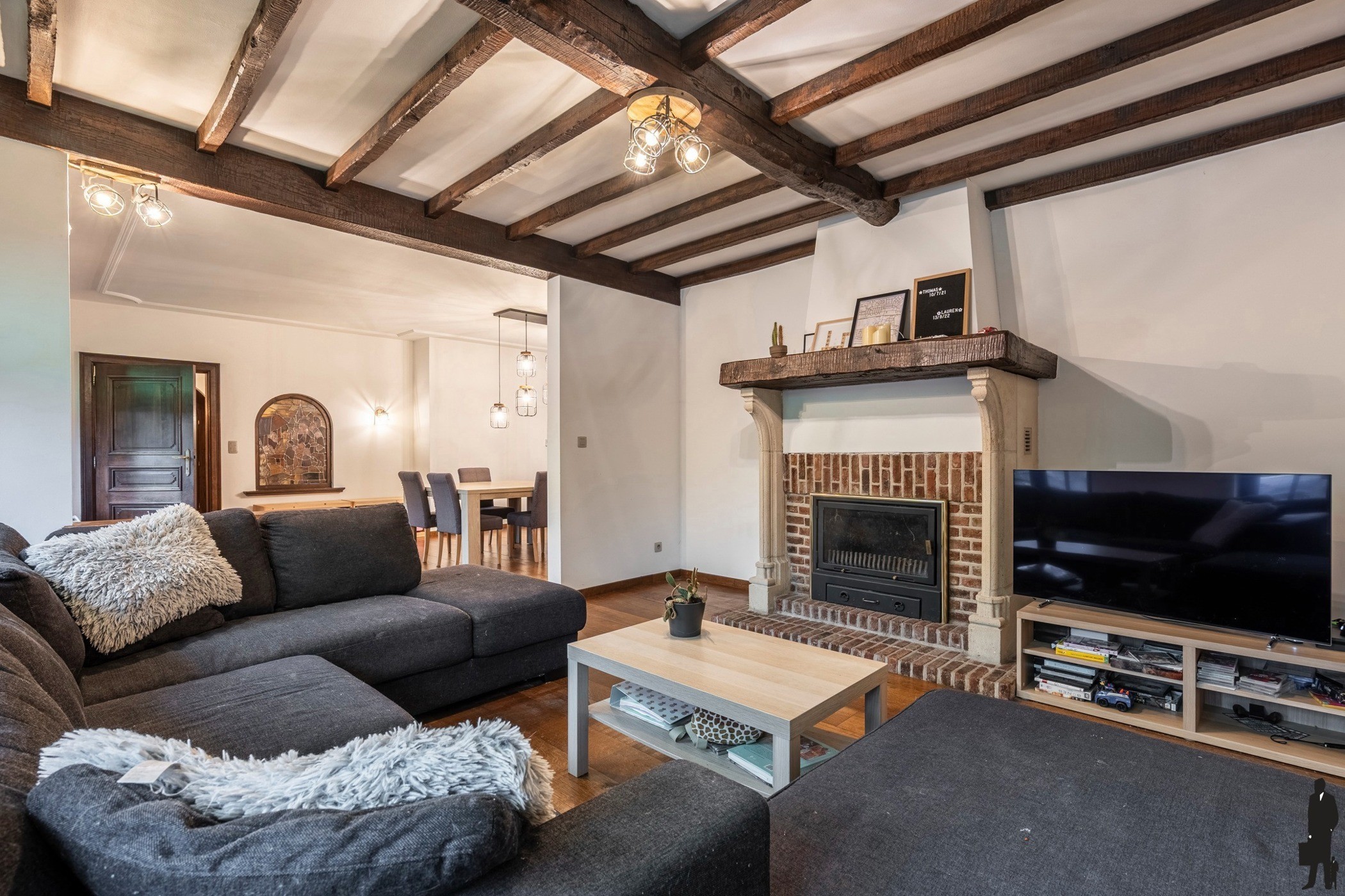 De leefruimte is royaal opgevat en aangenaam ingedeeld met een gezellige zithoek rond de televisie en de ingebouwde haard. Grote raampartijen zorgen voor veel lichtinval en bieden een mooi zicht op de voortuin. De eetkamer die voorzien is van mooie plafondlijsten, gelegen tussen de zithoek en de keuken, kijkt uit op de achtertuin en geeft via een schuifpui toegang tot het deels overdekte terras – ideaal om te genieten van zonnige dagen en lange zomeravonden. De woonkamer is afgewerkt met Frans eiken parket, authentieke ramen met glas-in-lood en een elegante omlijsting in Franse natuursteen rond de haard, wat bijdraagt aan een tijdloze en kwalitatieve uitstraling. Het glas-in-lood werd vakkundig geïntegreerd in nieuw hoogrendementsglas en nieuw buitenschrijnwerk, waardoor charme en energiezuinigheid perfect hand in hand gaan.