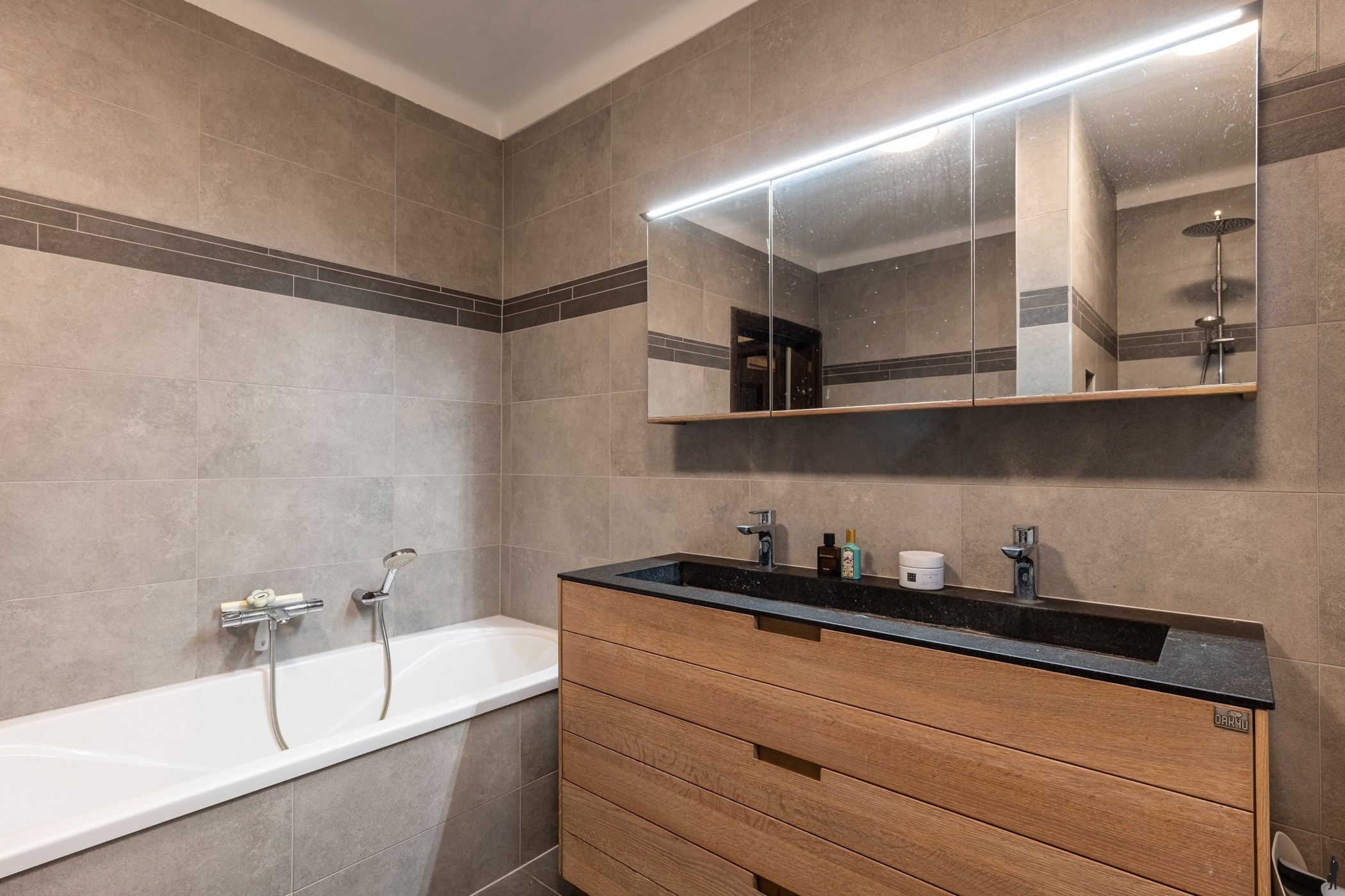 Aansluitend bevindt zich de praktische bijkeuken, eveneens voorzien van maatkasten en ingericht met ruimte voor wasmachine, droogkast en strijkhoek. Via een handige doorloop bereikt u zowel het terras als de inpandige garage. Verder op het gelijkvloers bevindt zich een ruime slaapkamer met zicht op de achtertuin, gecombineerd met een volledig vernieuwde badkamer. Deze is luxueus ingericht met een maatwerkmeubel met dubbele wastafel, spiegelkast, inloopdouche en ligbad. Hierdoor is levensbestendig wonen hier perfect mogelijk.