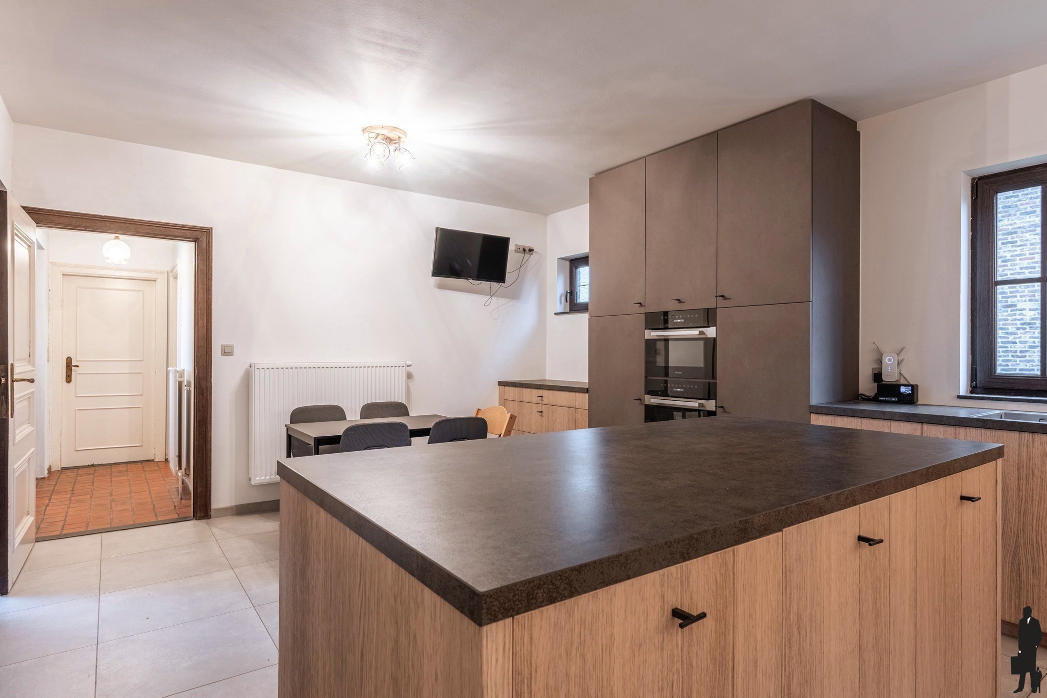 De leefkeuken vormt het kloppend hart van de woning en werd volledig vernieuwd. Ze is uitgevoerd in hoogwaardig maatwerk en uitgerust met alle hedendaagse comfort: inductiekookplaat, warme luchtoven, microgolfoven, wijnkast en een grote koelkast. Dankzij de royale opzet is er voldoende plaats voor een grote eettafel, ideaal voor gezellige familiemomenten en het ontvangen van gasten.