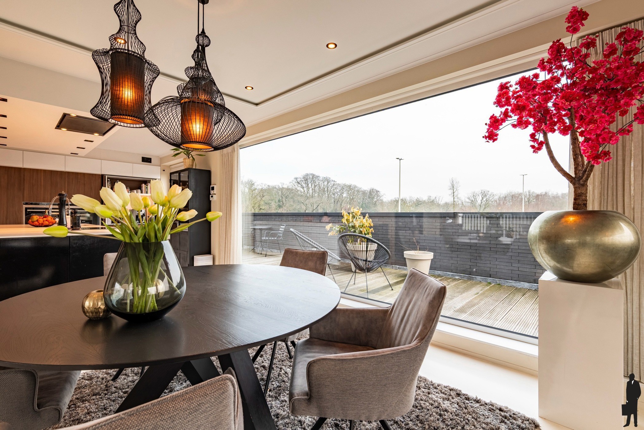 Aansluitend aan de keuken bevindt zich de eetkamer, die voldoende ruimte biedt voor gezellige familiemomenten of het ontvangen van gasten. De keuken zelf is een ware droom voor elke kookliefhebber: ze is uitgerust met een composiet werkblad, overvloedige kastruimte en een doordachte indeling. De hoogwaardige toestellen omvatten onder meer een inductiekookvuur, stoomoven, combi-oven, vaatwasser, afzuigkap met randafzuiging en een practische coffee corner voorzien van indirecte verlichting. Grote schuiframen geven rechtstreeks toegang tot het terras, waardoor binnen en buiten naadloos in elkaar overlopen.