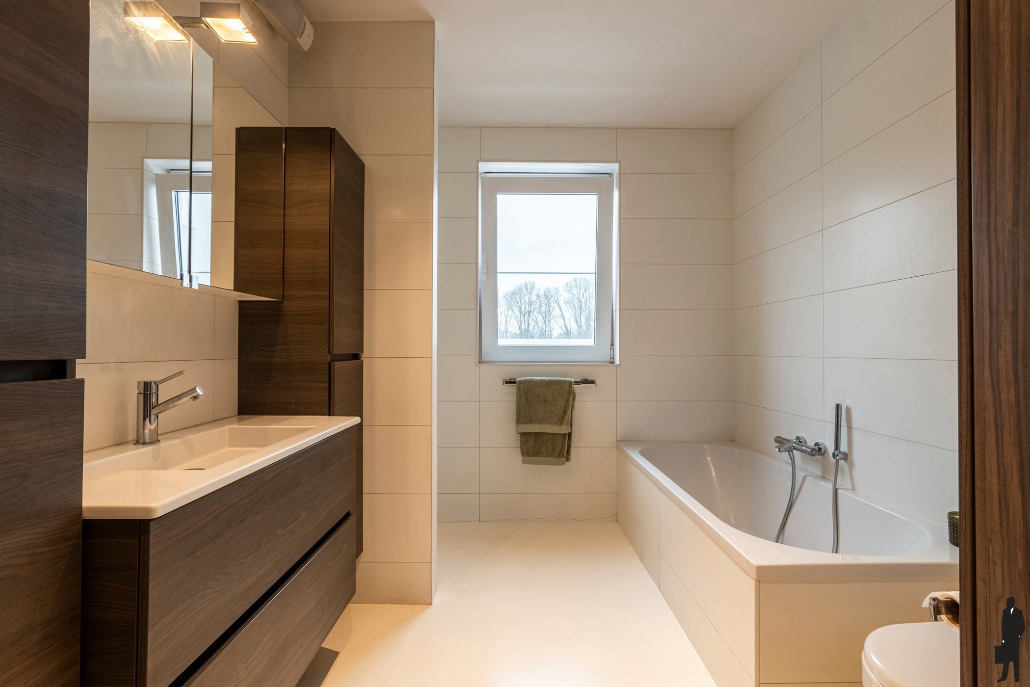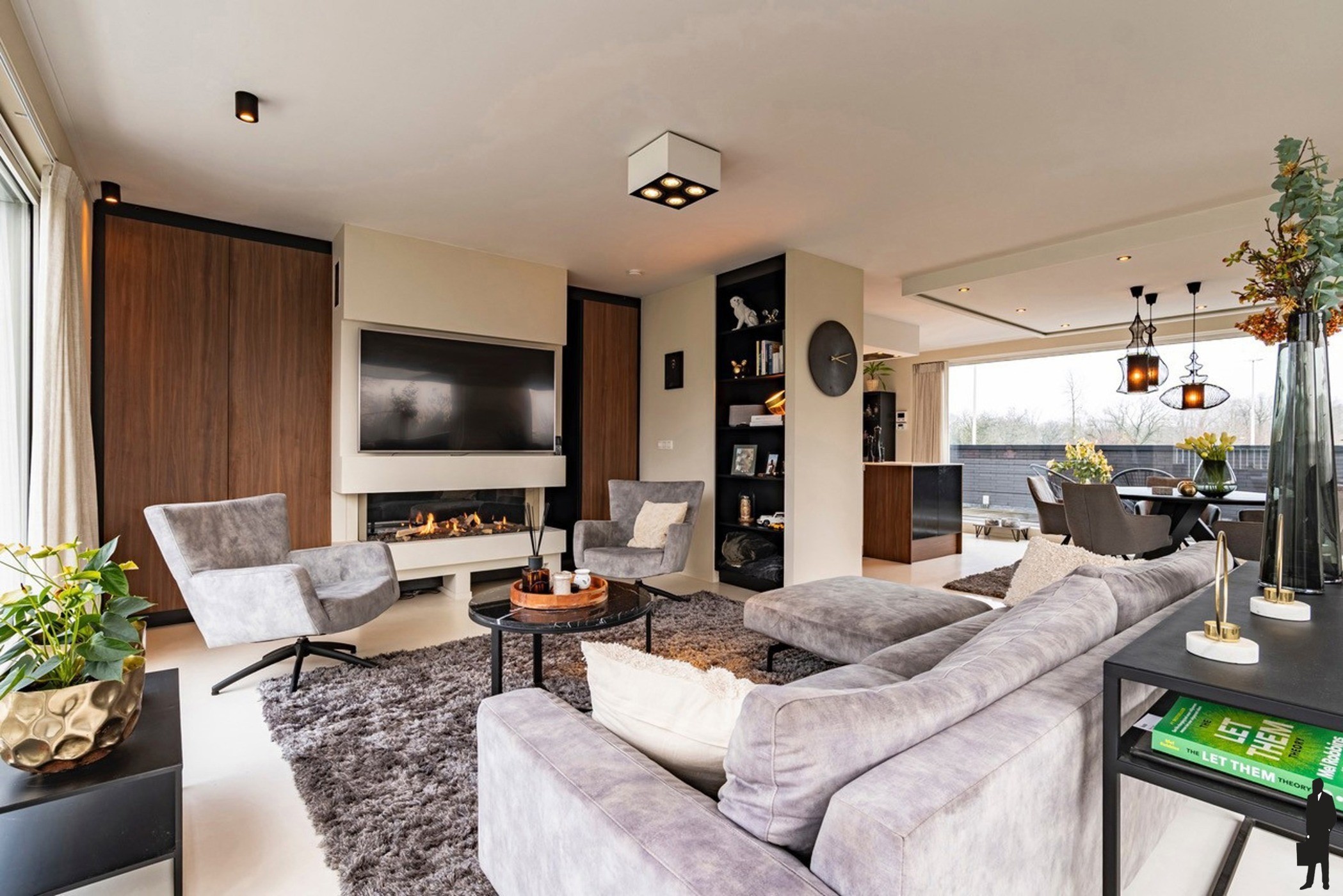 Bij het betreden van het appartement komt u in een elegante foyer, uitgerust met op maat gemaakte vestiairekasten en een discreet gastentoilet. Van hieruit leidt de woning u langs de hoogwaardig afgewerkte designkeuken naar de royale leefruimte. De woonkamer baadt in het natuurlijke daglicht dankzij de grote raampartijen en biedt een prachtig, rustgevend zicht op de omliggende groene omgeving. Bij mooi weer opent u de schuifpuien en loopt u het terras op. De gezellige zithoek is ruim opgevat en biedt plaats voor een groot salon, centraal opgesteld rond een sfeervolle gashaard. Het uitzicht op de achterliggende tuin met oude bomen en een uitgestrekt grasveld versterkt het gevoel van privacy en sereniteit. Maatwerk kasten zorgen voor extra opbergruimte en een strakke, stijlvolle afwerking.