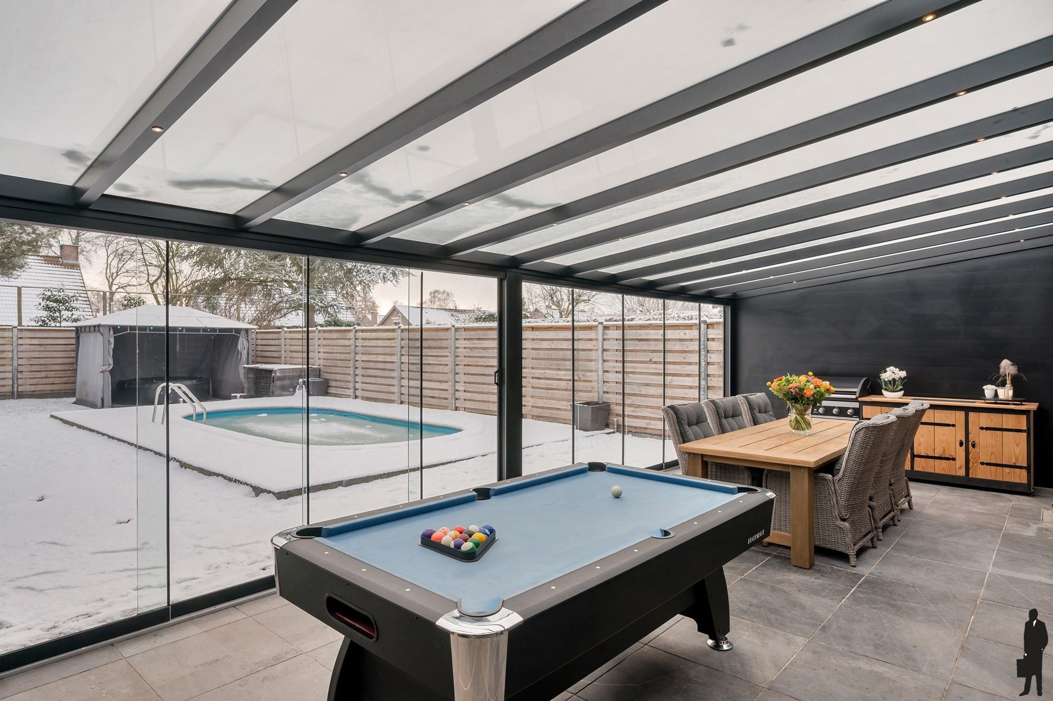 - Een ruim overdekt terras/veranda (2023) (Ca. 40 m²) voorzien van een gezellige houtkachel (2023). De schuiframen met opaalglas kunnen volledig geopend worden!