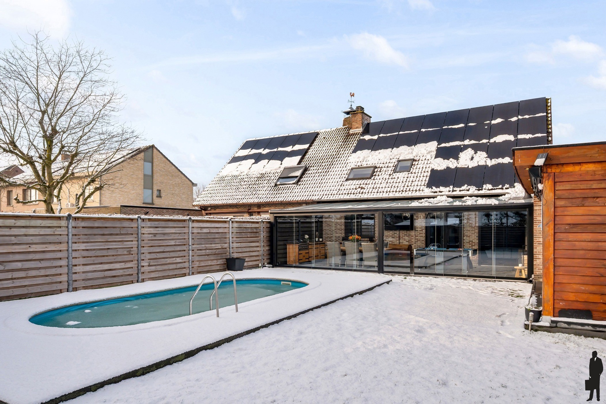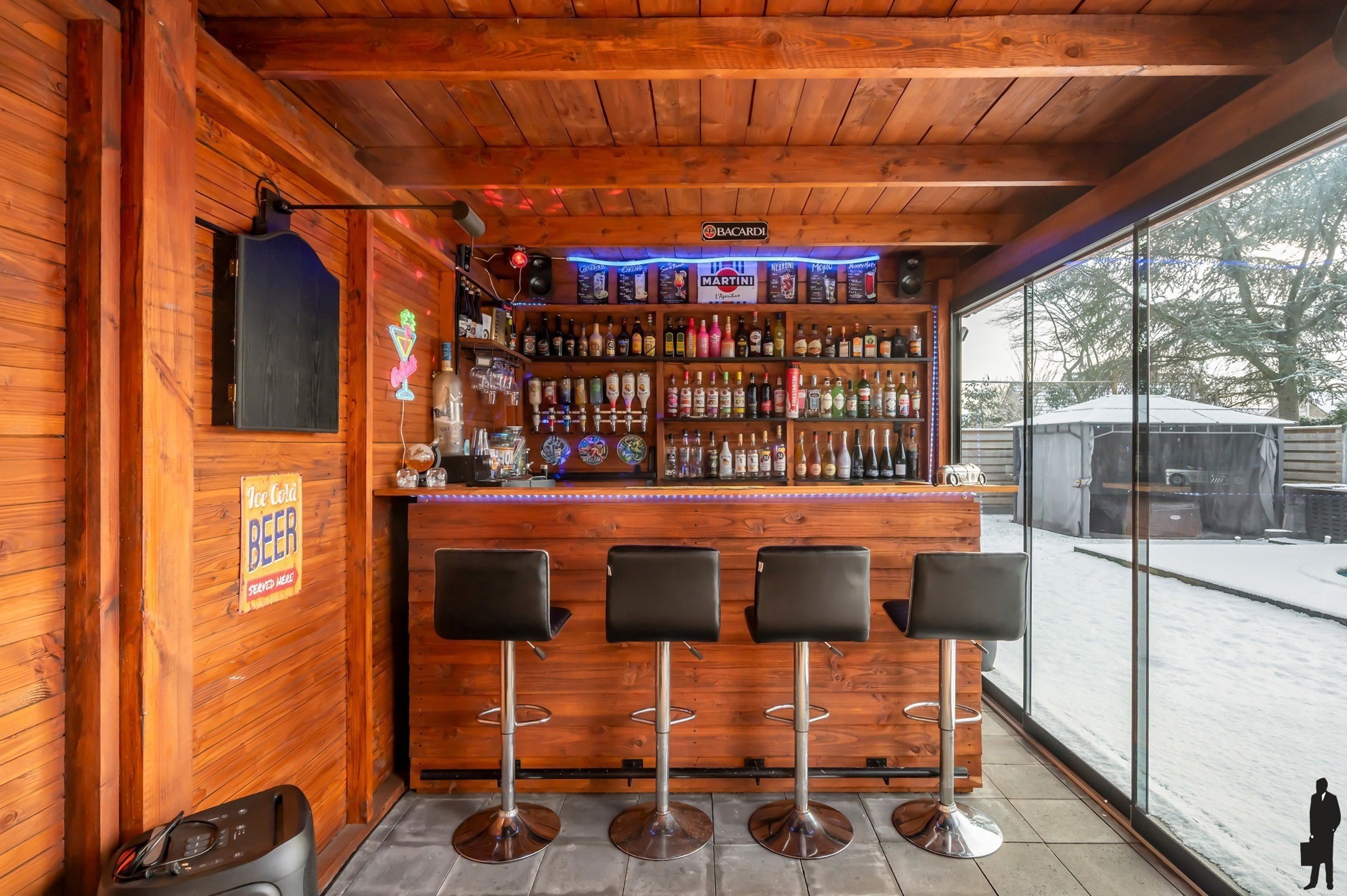 De tuin met zuidoostoriëntatie werd recent volledig omheind en beschikt over een verwarmd zwembad, een tuinhuis en een poolhouse, ingericht met lounge en buitenbar!