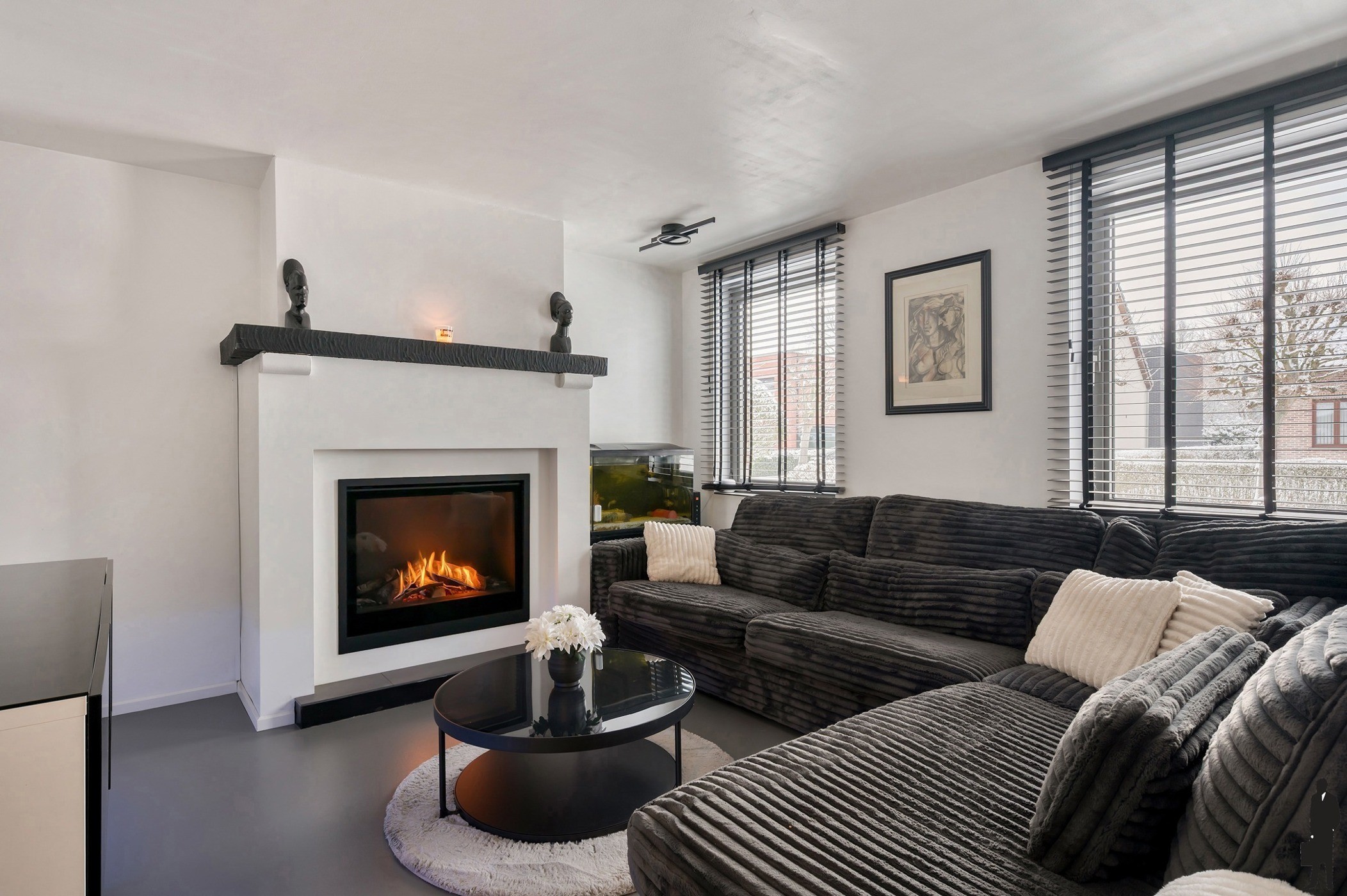 - Een woonkamer op gietvloer met aparte zithoek (Ca. 15 m²) voorzien van gashaard