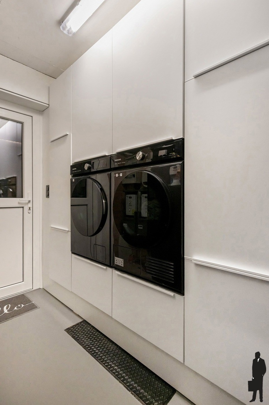 - Een praktische wasplaats met ingemaakte kasten voor droogkast en wasmachine.