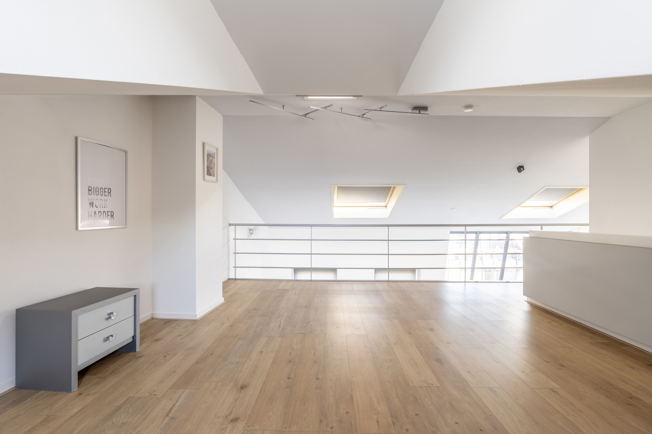 Via een vaste trap bereikt u de bovenverdieping met vide, ideaal in te richten als derde slaapkamer, bureel, dressing of speelkamer. Daarnaast zijn er nog een tweede slaapkamer en een tweede badkamer met douche, ligbad, toilet en wastafel.