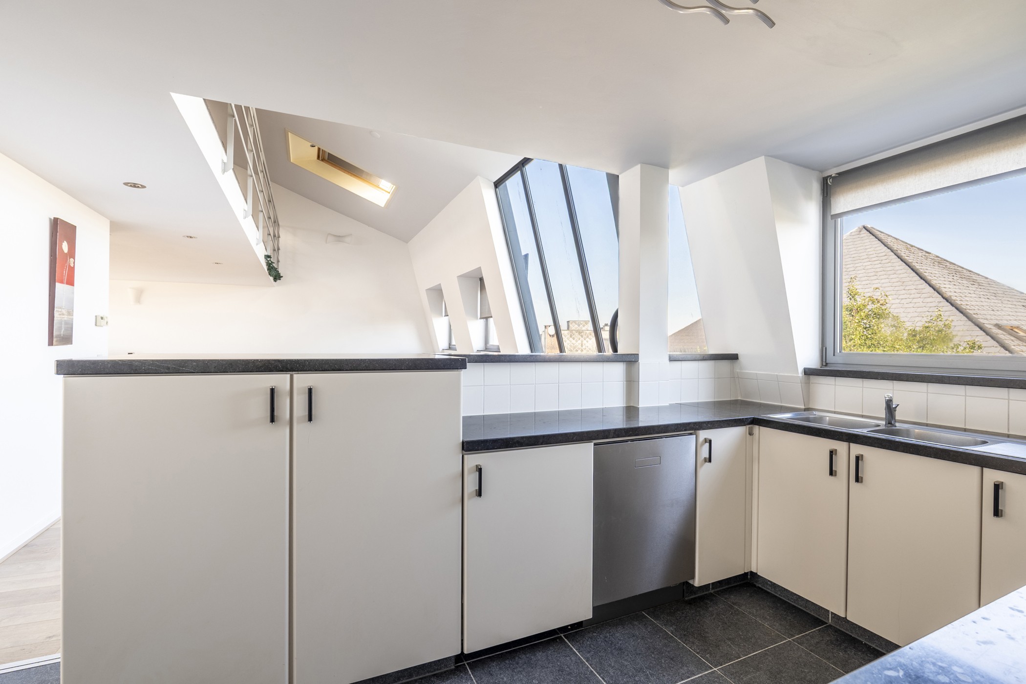 Via de inkomhal met gastentoilet komt u binnen in de ruime, lichtrijke woonkamer met directe toegang tot het grote zonneterras. De open keuken is volledig uitgerust met oven, kookplaat, dampkap, vaatwasser, dubbele spoelbak en koelkast.