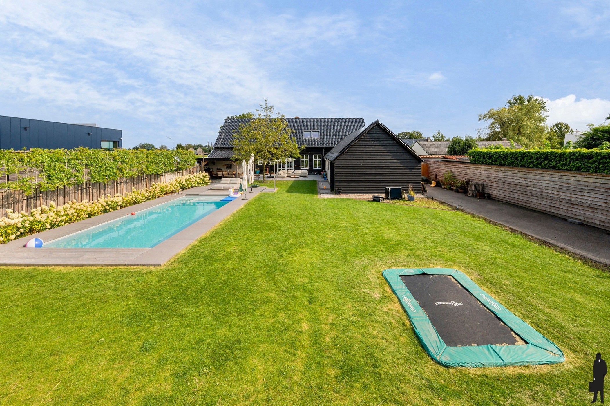 Aangelegde tuin met verwarmd zwembad.