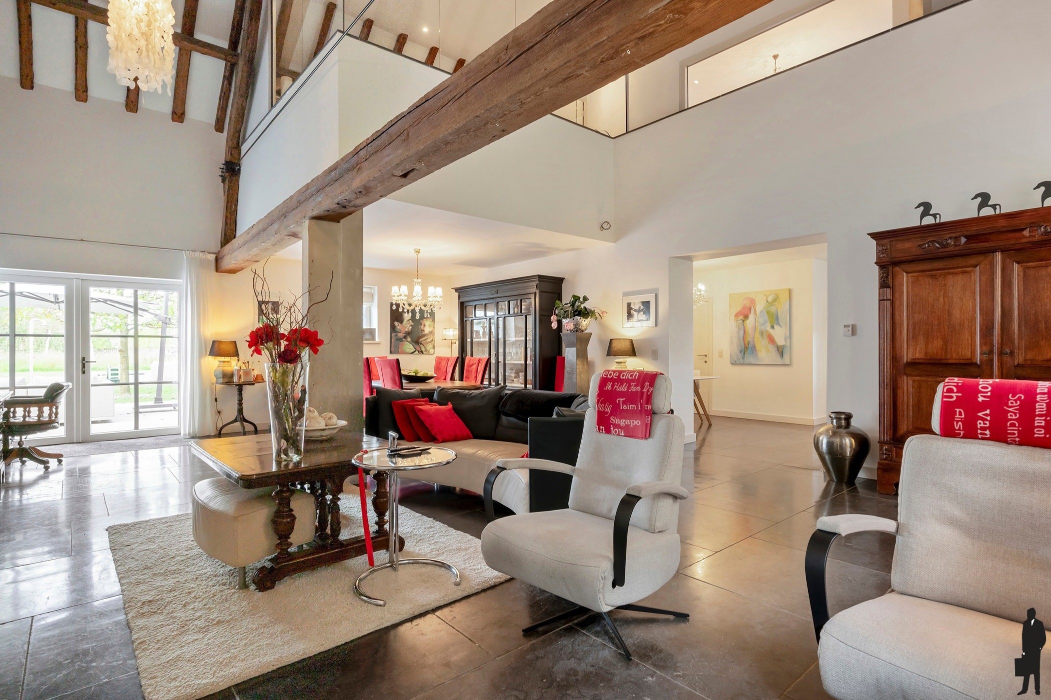 Ruime woonkamer met hoogte tot in de nok, voorzien van open haard en tuindeuren naar het terras.
