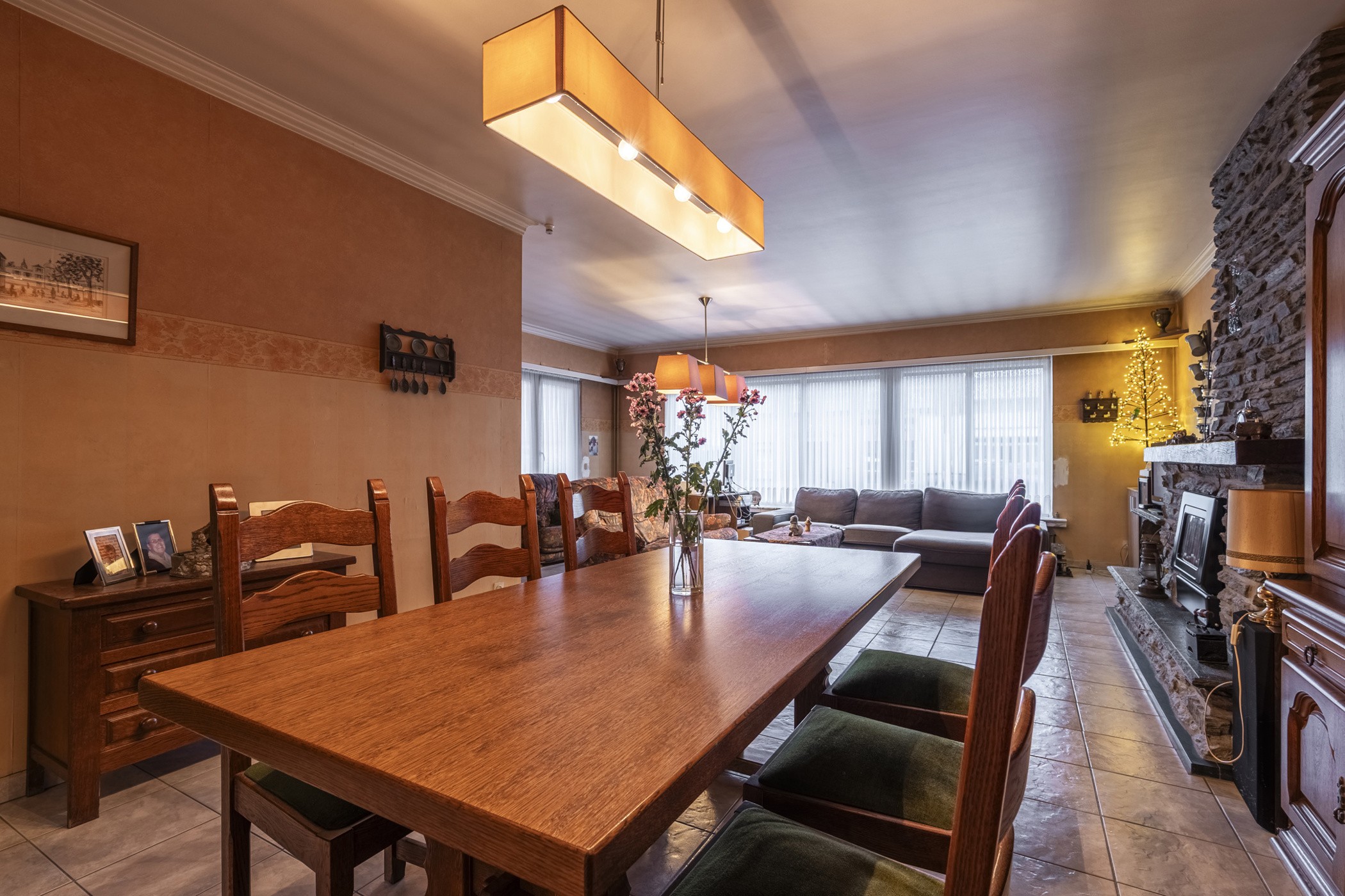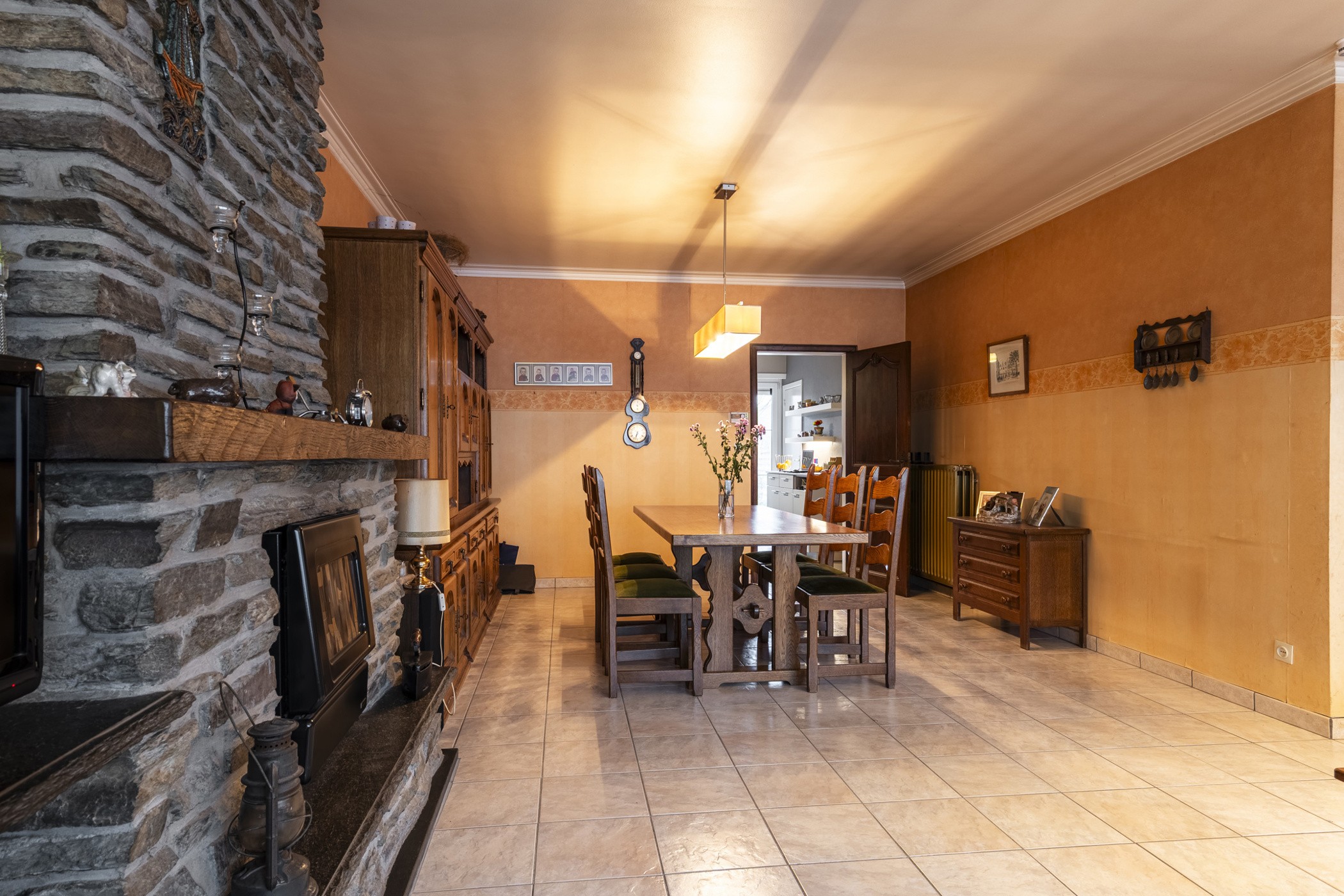 De L vormige woonkamer is ruim en ingedeeld met een grote zithoek aan de straatkant en de eetkamer kort bij de keuken. Met de inbouwhaard op hout kan u in de tussenseizoenen het gezellig warm stoken, maar in de winter een perfecte bijverwarming.