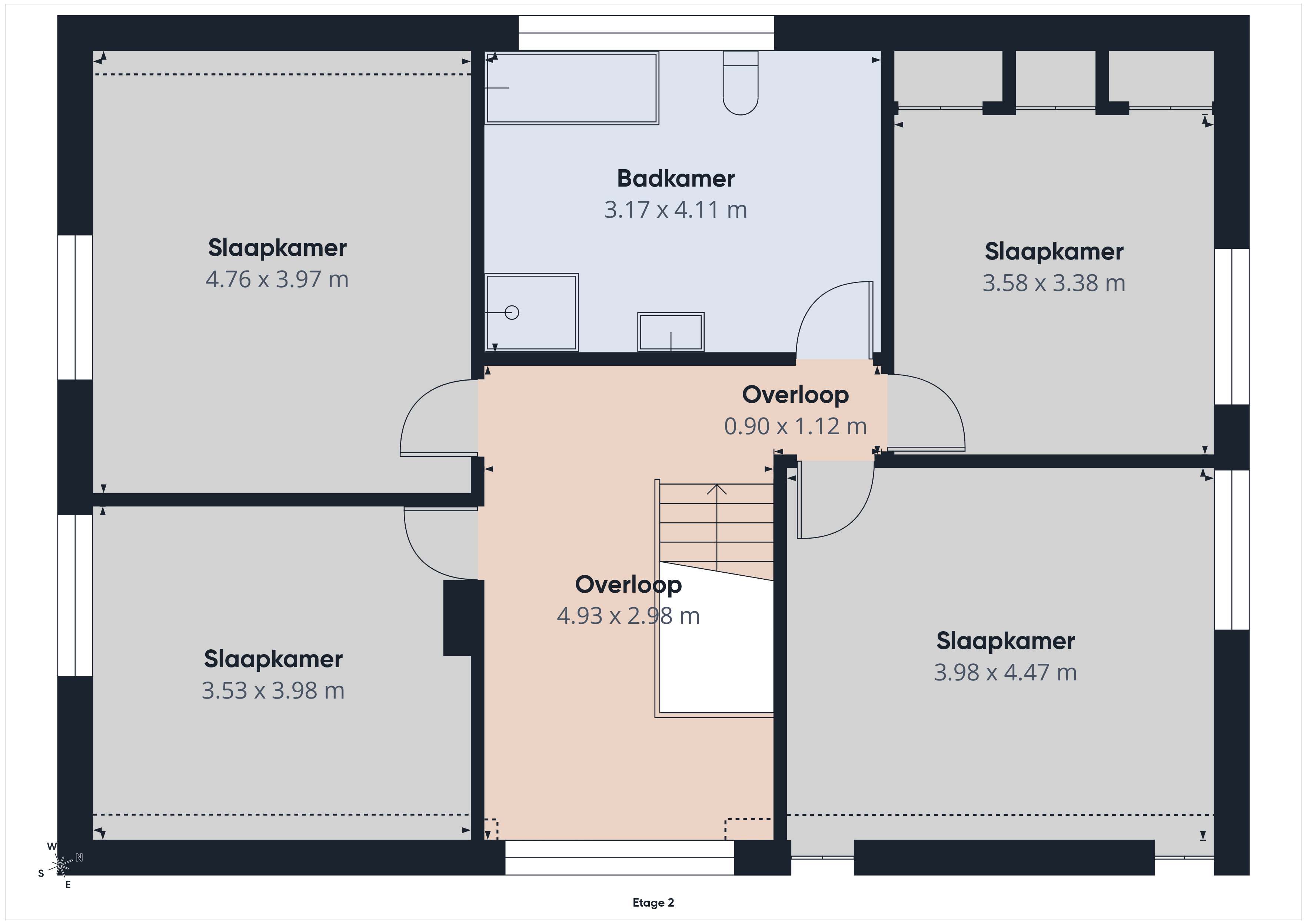 De vaste houten trap in de inkomhal brengt u naar de eerste verdieping met 4 ruime slaapkamers .