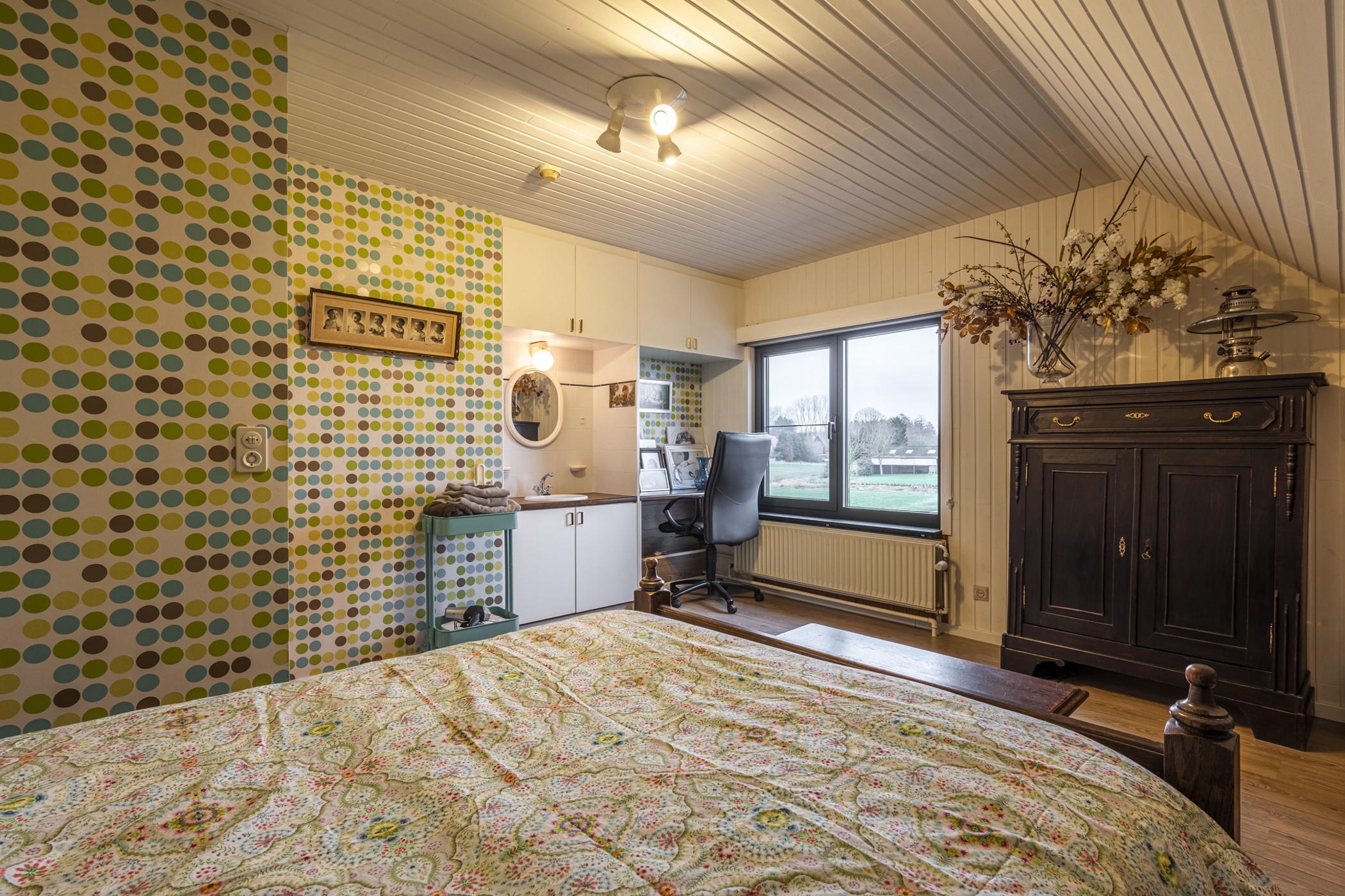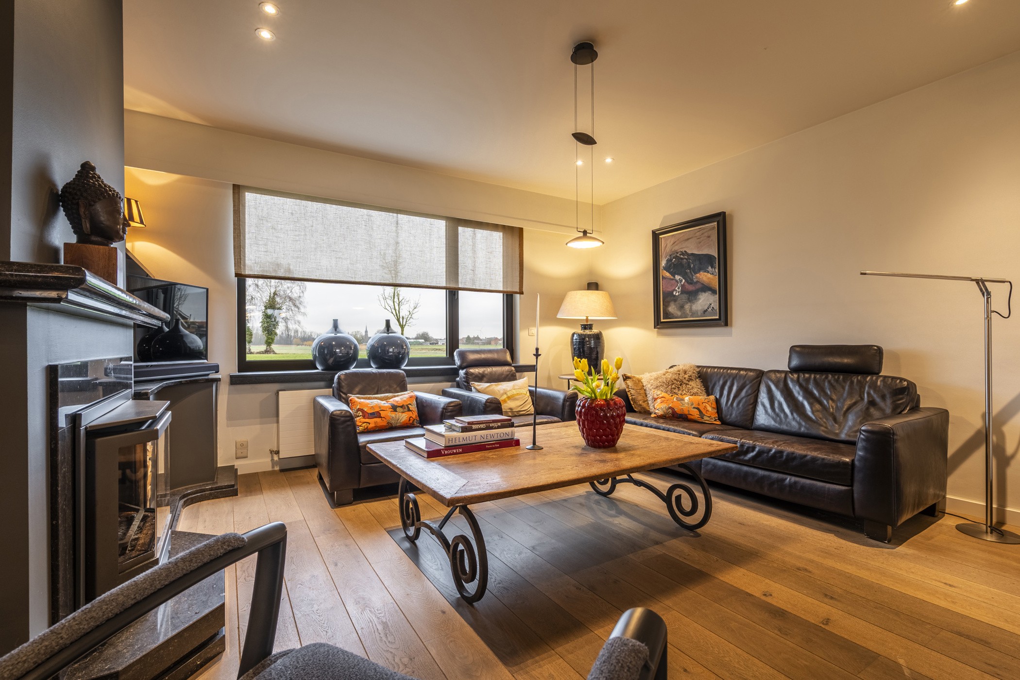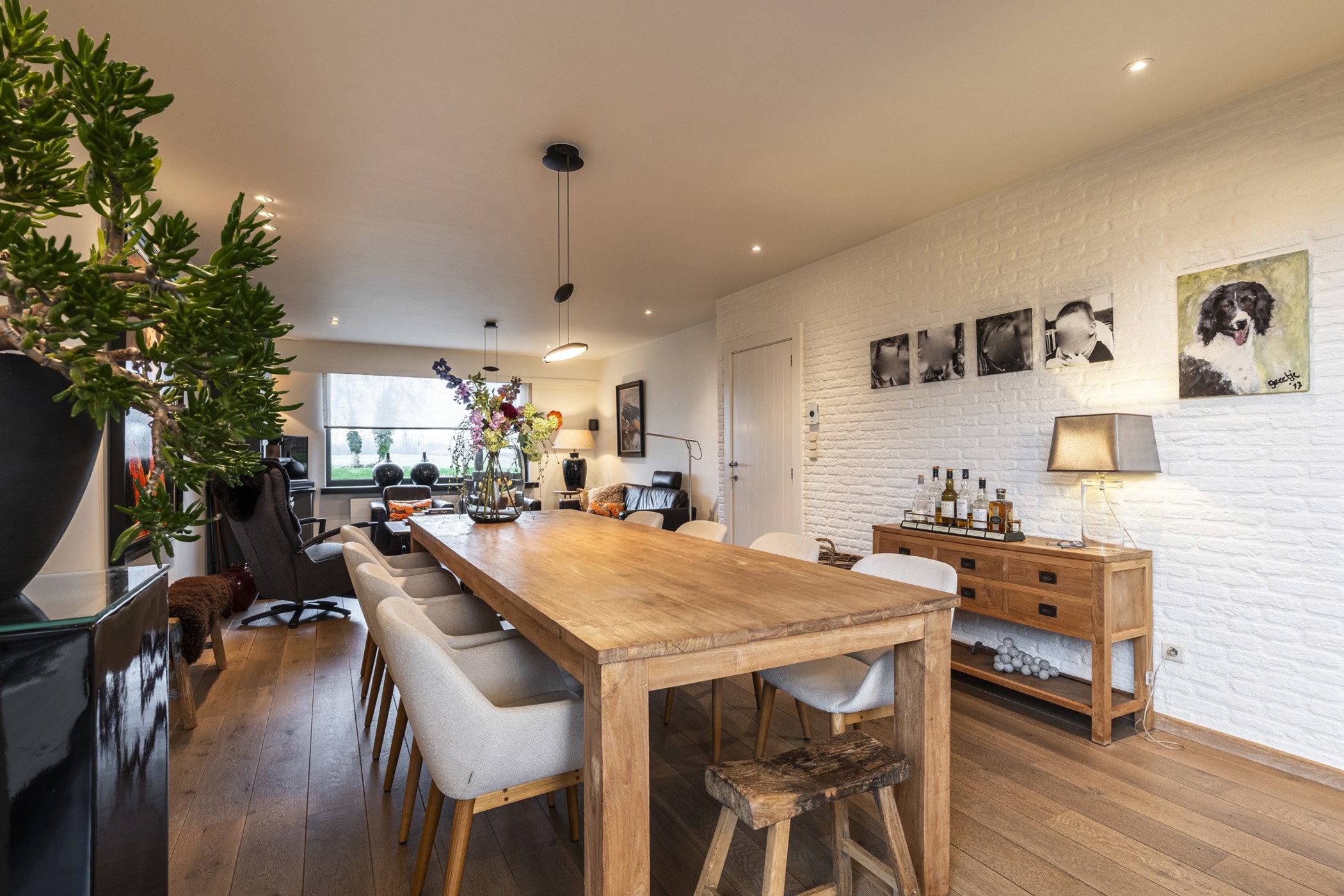 Via de inkomhal bereikt u enerzijds de lichtrijke woonkamer en anderzijds de eerste slaapkamer op het gelijkvloers — ideaal voor levensbestendig wonen of als praktijk- of bureauruimte. De woonkamer met Franse eiken parketvloer baadt in het daglicht en vormt een warme, gezellige leefruimte. De eetkamer bevindt zich centraal tussen de sfeervolle zithoek met houtkachel aan de straatzijde en de keuken. Vanuit de leefruimte geniet u van een prachtig, vrij uitzicht over waardevol agrarisch gebied en uitgestrekte weilanden.