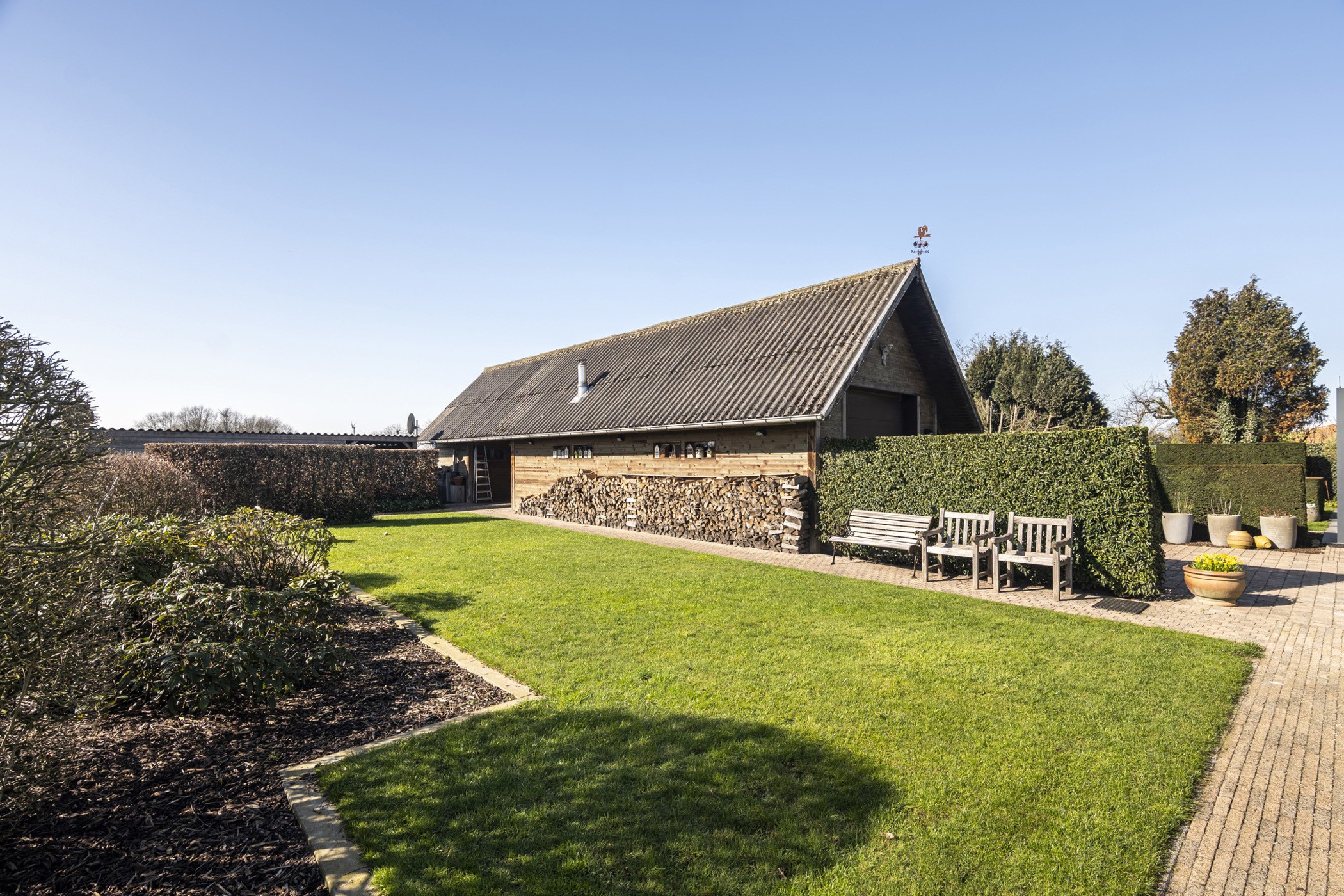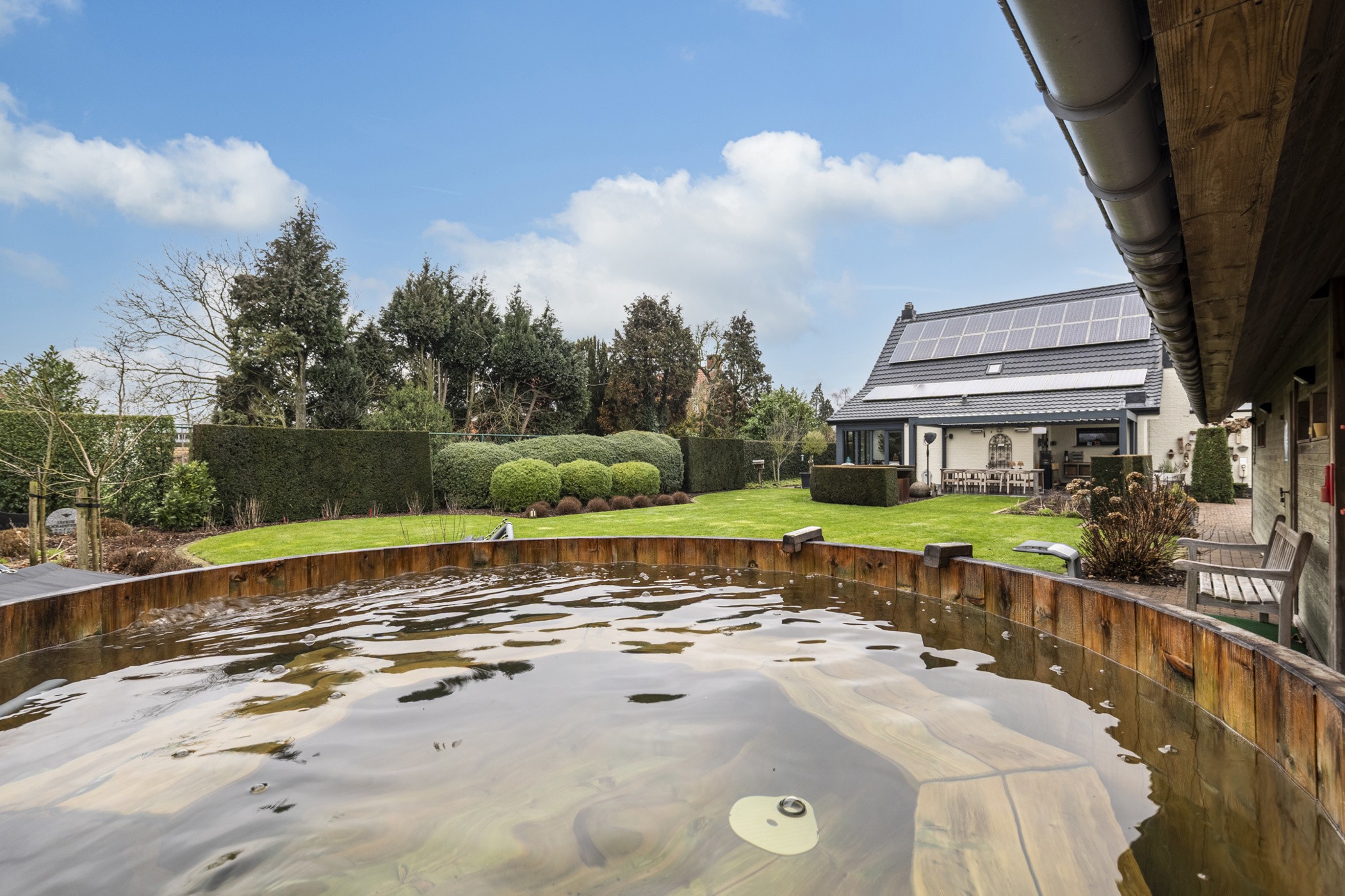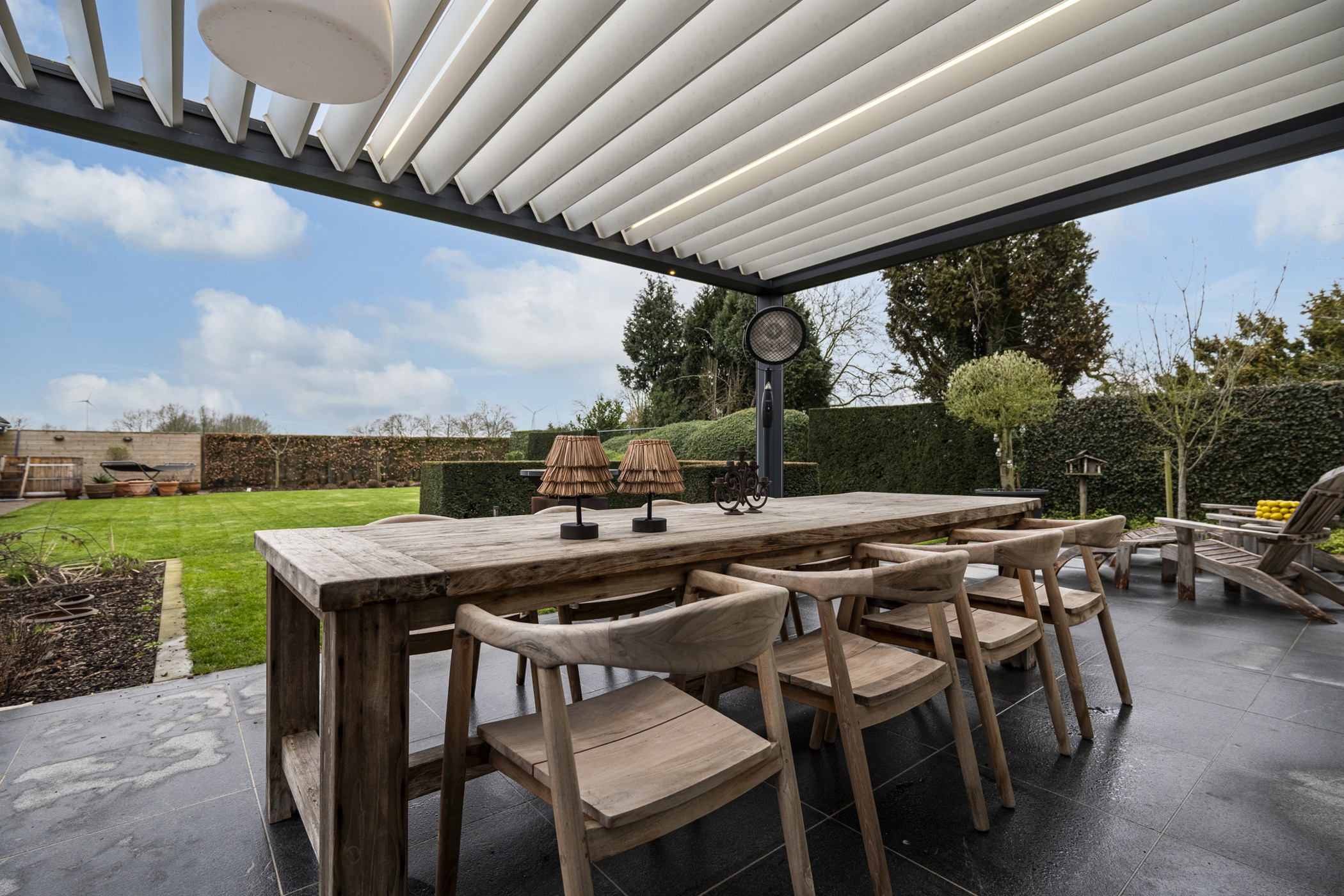 De prachtig aangelegde, volledig afgesloten tuin is zuidgericht en biedt maximale privacy en een uniek uitzicht op de Wampvallei. Het ruime terras (35 m²) is uitgerust met een kwalitatieve lamellenoverkapping van Brustor, voorzien van screens rondom, waardoor u eenvoudig een schaduwrijke plek creëert. Hier kan u in alle rust tafelen en genieten van het open landschap. Het grote bijgebouw (104m²) is momenteel opgesplitst in twee delen; Achteraan een groot tuinhuis en vooraan een wellnessruimte met sauna, infraroodcabine, douche en toegang tot de hot tub in de tuin. Deze multifunctionele ruimte is ideaal voor hobby, praktijk, ontspanning of het organiseren van gezellige privéfeestjes.