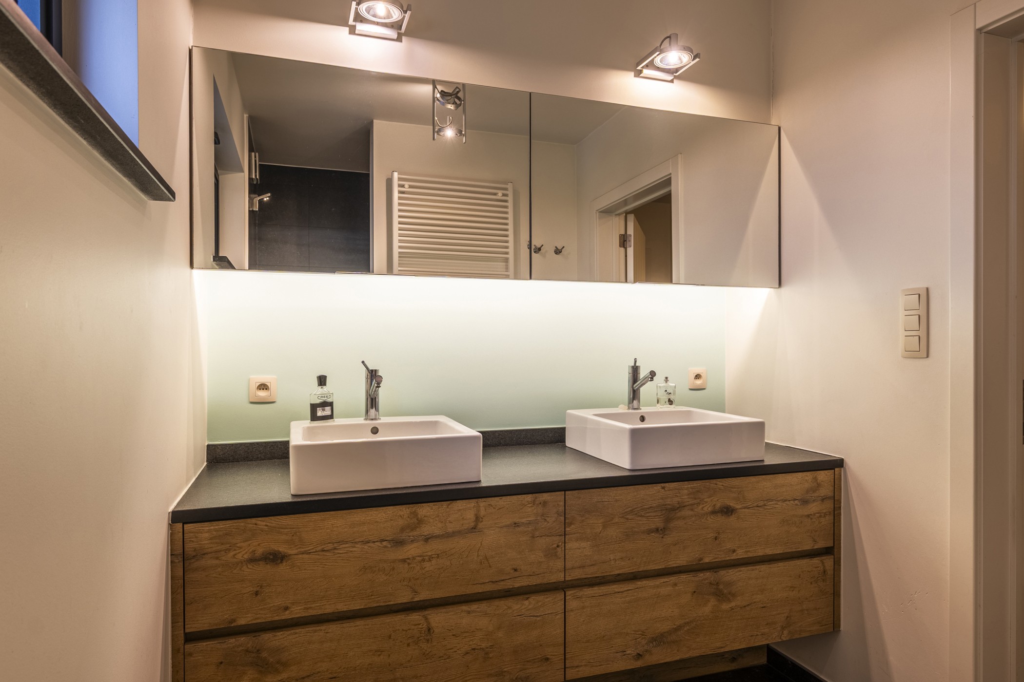 De maatwerkkeuken vormt het hart van de woning en is uitgerust met hoogwaardige toestellen en afwerkingen: natuurstenen werkbladen, wokbrander, twee gasbekkens, twee inductiekookplaten, een Amerikaanse Liebherr-koelkast, dubbele spoelbak met Quooker Grohe en diverse Miele-toestellen (vaatwasser, combisteamer, heteluchtoven en warmhoudlade). Daarnaast beschikt de keuken over een geklimatiseerde wijnkast, extra koelkast en een koffiehoek. Aan het aparte keukeneiland geniet u van het zicht op de tuin — perfect voor een rustig koffiemoment of een aperitief met uw gasten terwijl u kookt. De gelijkvloerse badkamer werd volledig vernieuwd en beschikt over een ruime inloopdouche, dubbele wastafel met maatwerkkasten en een apart toilet. Via de keuken bereikt u de praktische bijkeuken met kamerbrede maatwerkkasten en toegang tot de voorraadkelder.