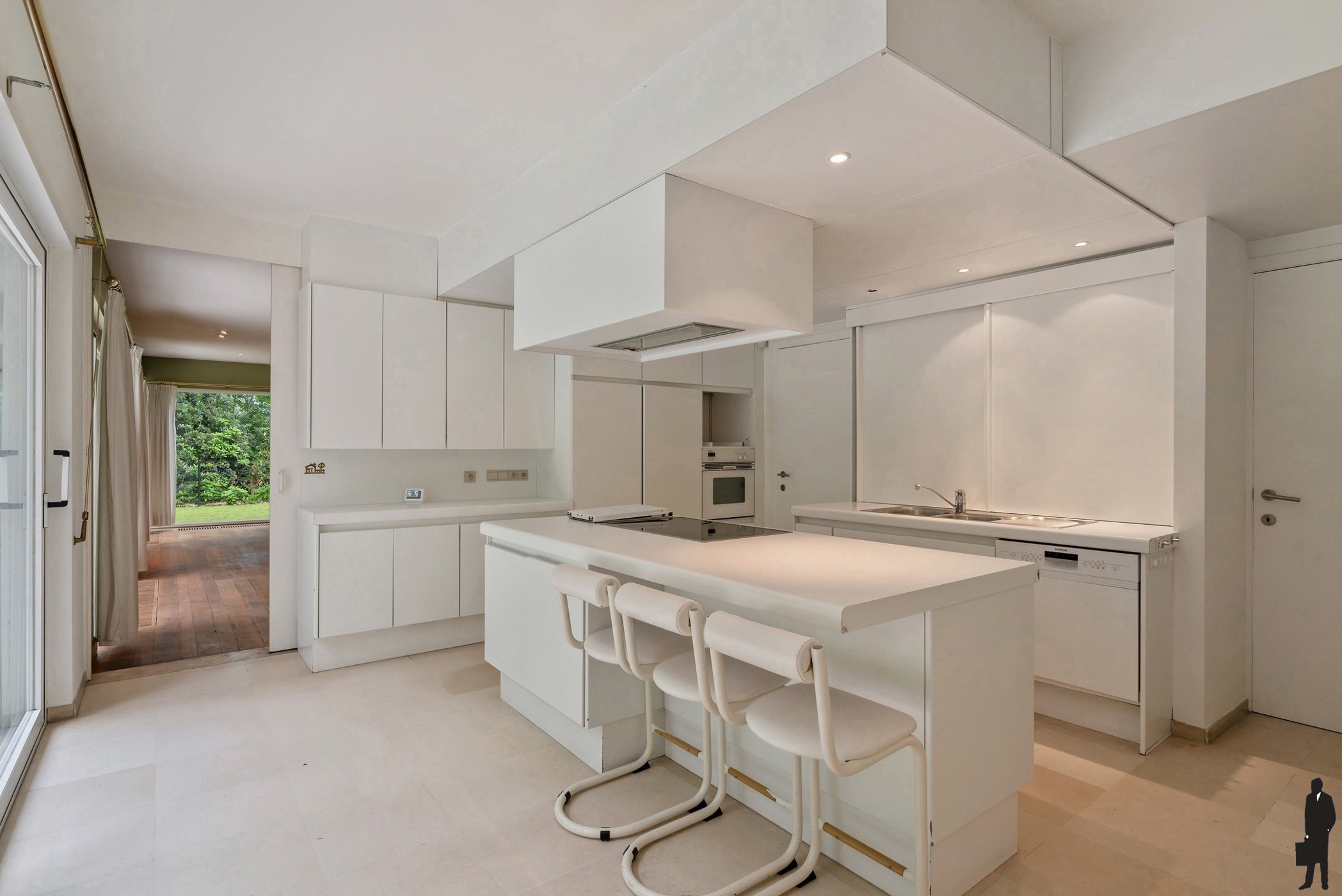 - Een leefkeuken op natuursteen met kookeiland met AEG koelkast, dubbele lavabo, Siemens kookvuur, Gaggeneau friteuse, Siemens oven -en vaatwasser en schuifraam naar terras en tuin