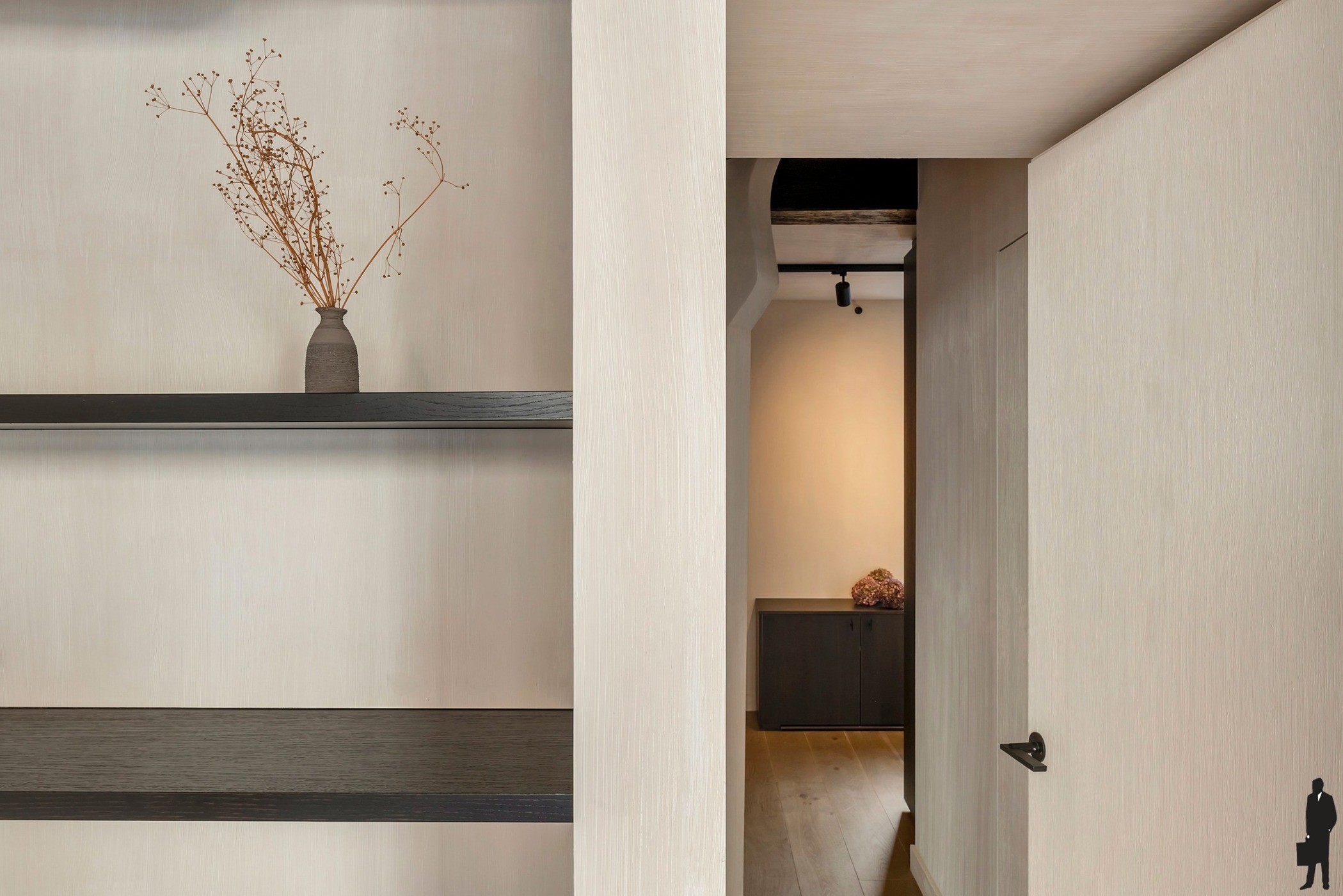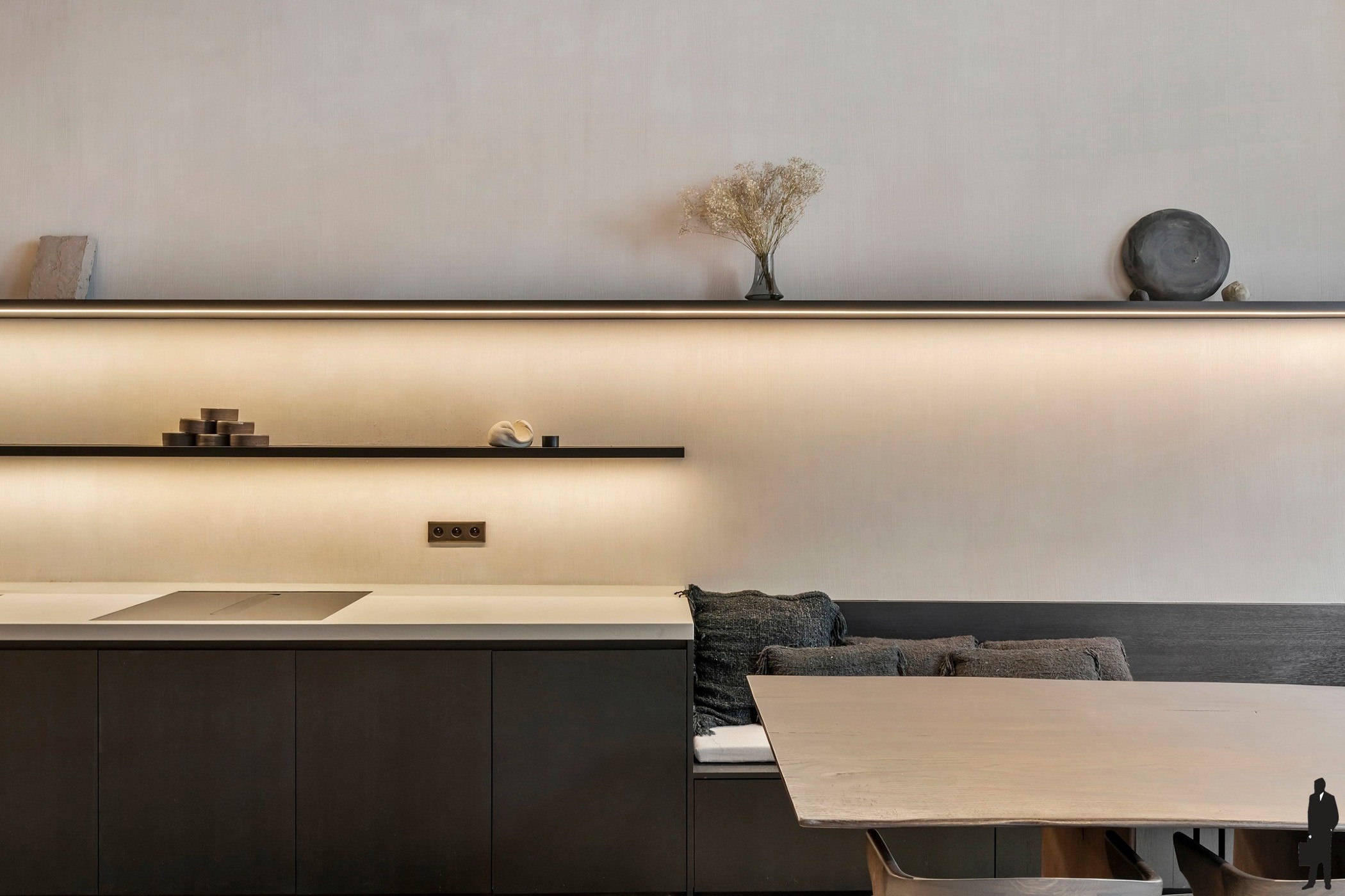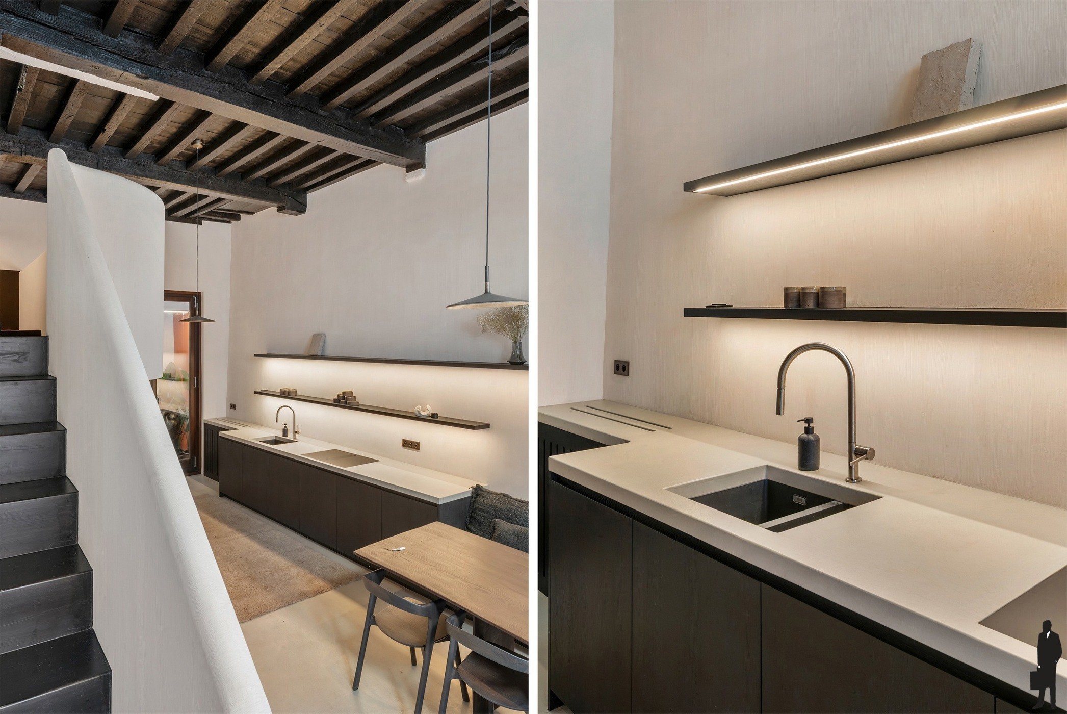 Het gelijkvloers verwelkomt je in een warme leefkeuken en eetruimte, afgewerkt met kalkverf en verrijkt met een combinatie van originele elementen en nieuwe massiefhouten accenten. Op de tussenverdieping werd optimaal gebruikgemaakt van de ruimte door maatwerk­kasten die perfect aansluiten bij het statige karakter van het huis. Op de eerste verdieping wacht een elegant salon, rijk aan sfeer en licht.